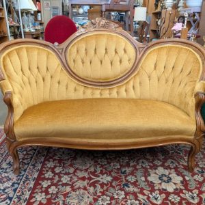 Carved Wood Medallion Loveseat – Tufted Yellow Gold Velvet