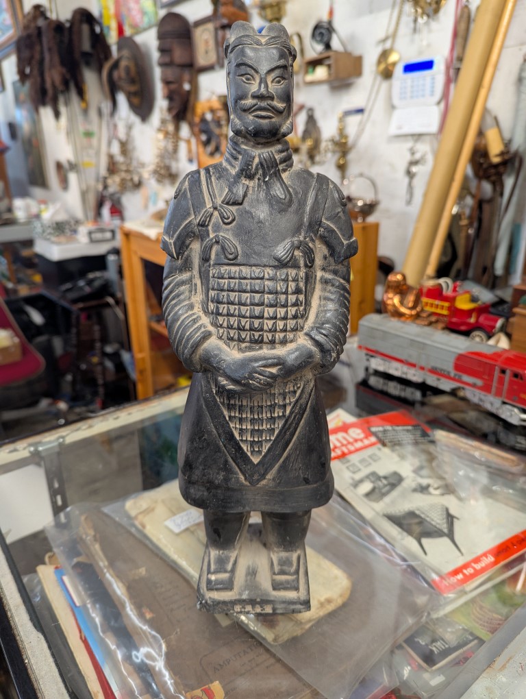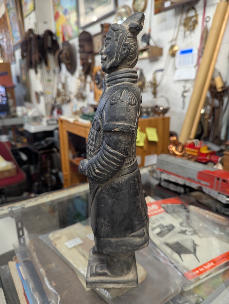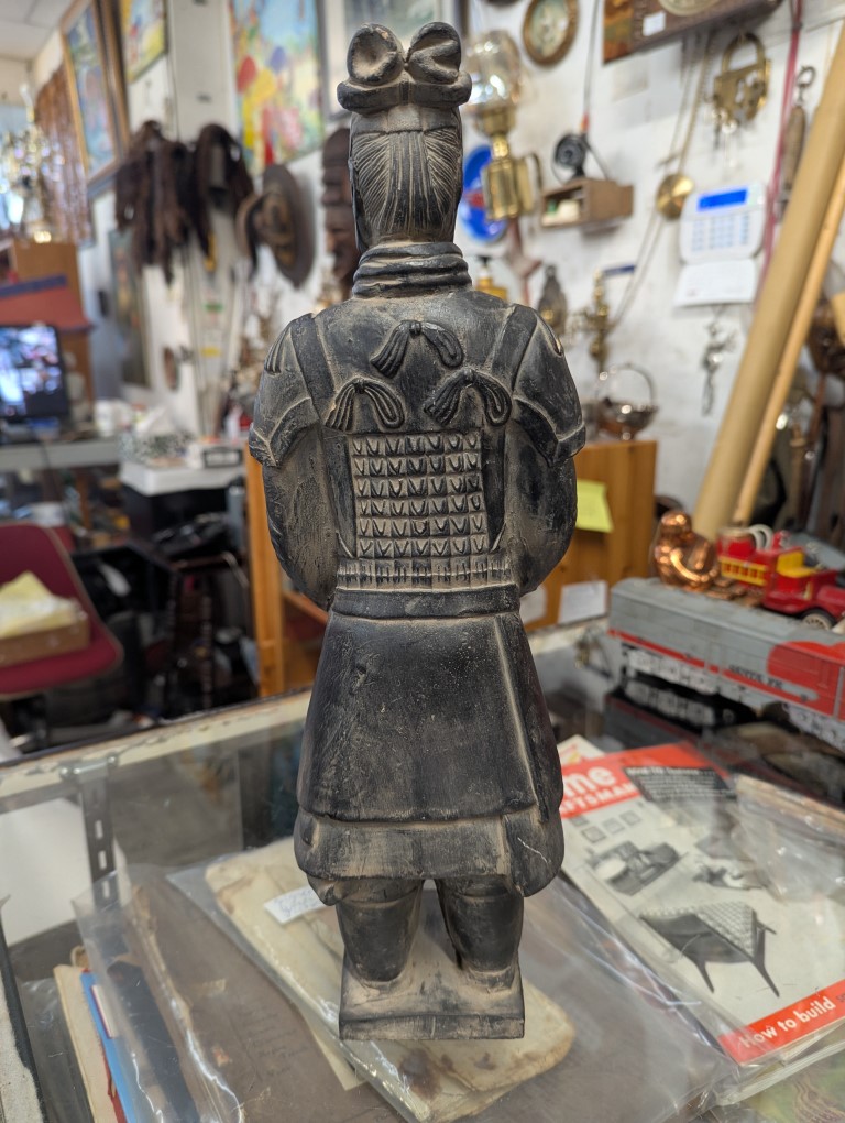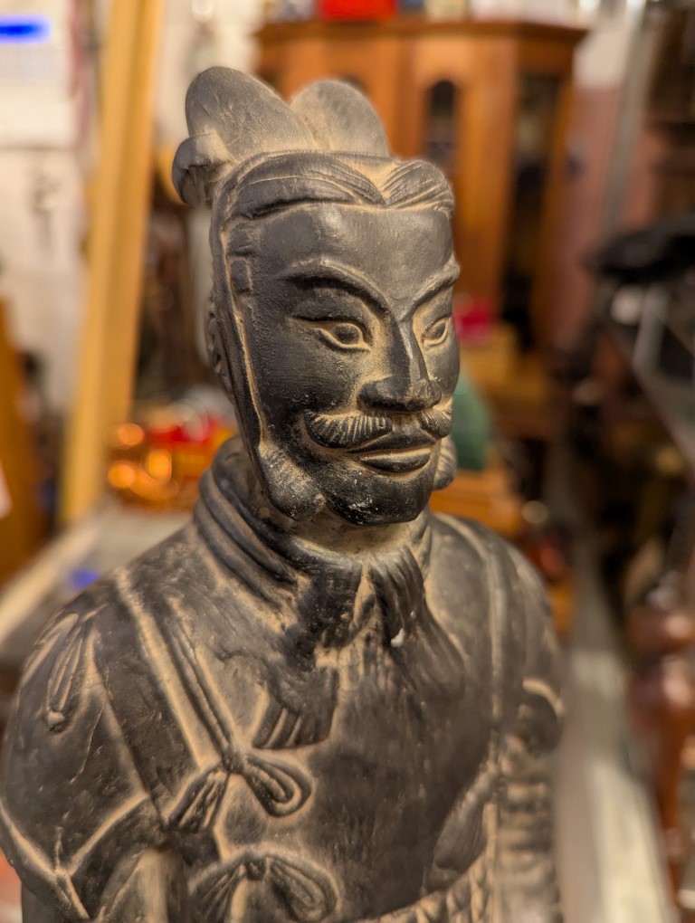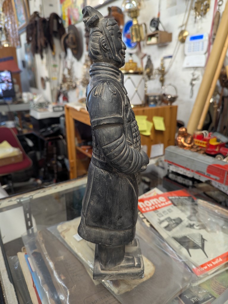 Stern standing terracota warrior statue clothed in full armor.