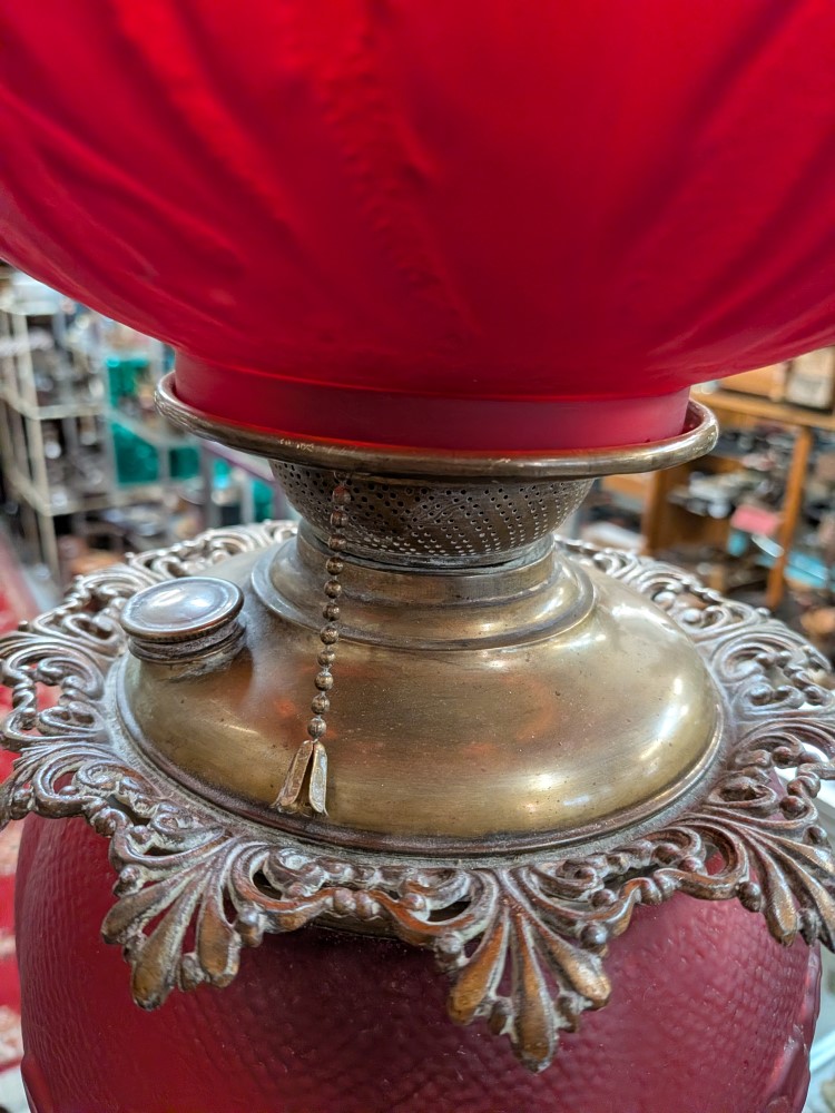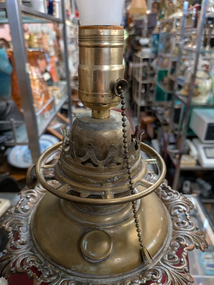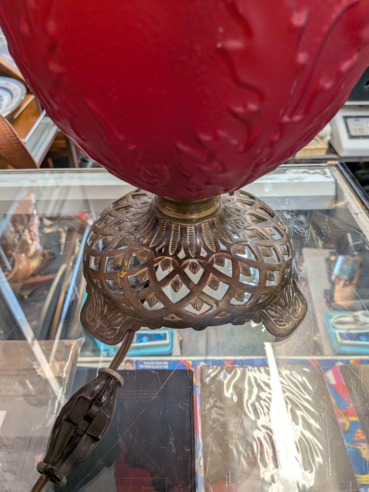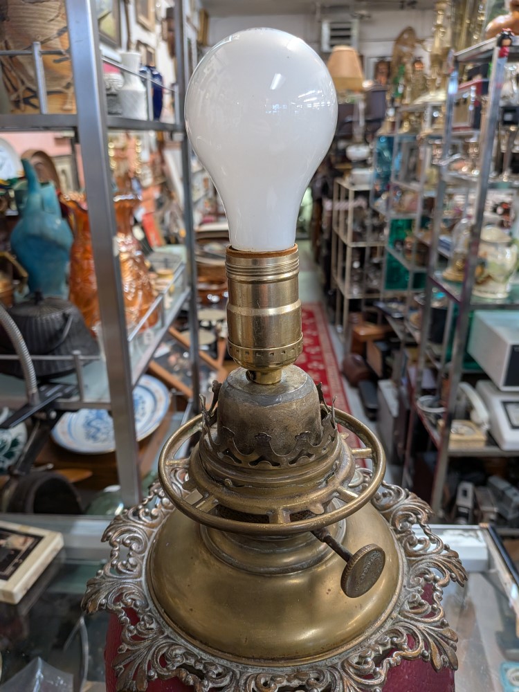 Late Victorian parlor lamp in vibrant red satin glass with an embossed poppy pattern. Originally a kerosene lamp, it has been converted to electric and features a classic ornate brass plated base.