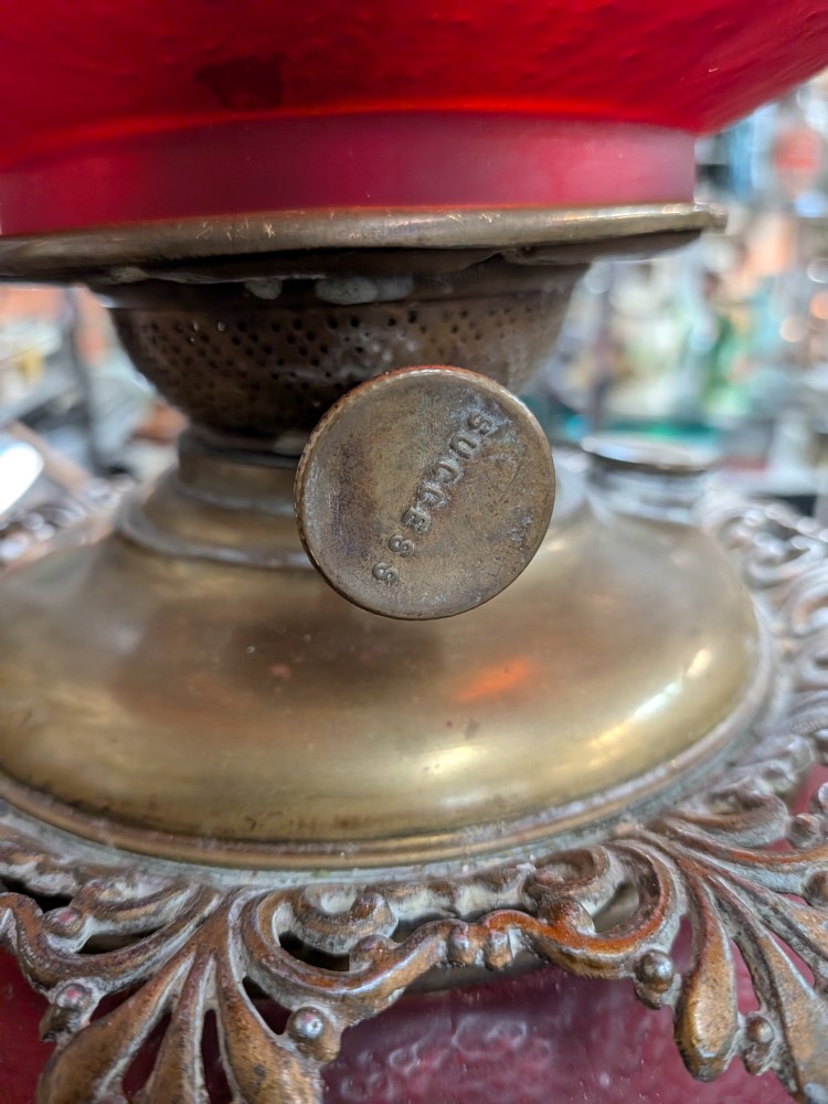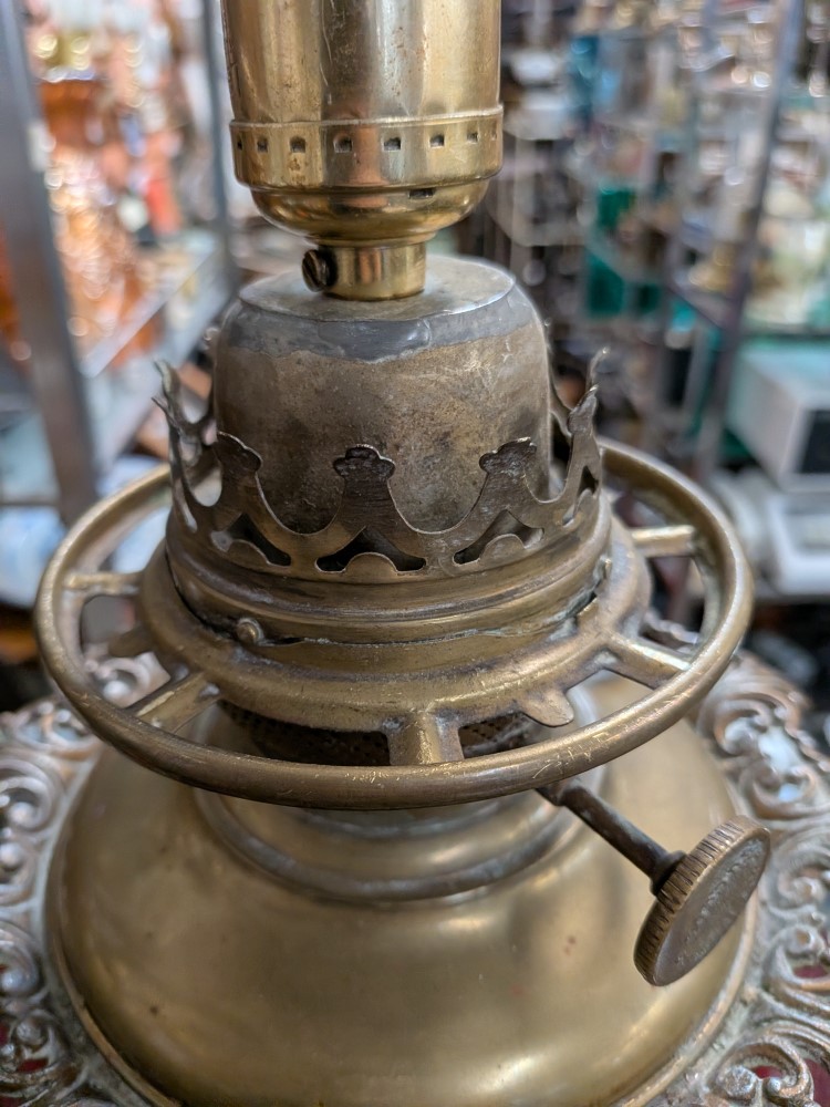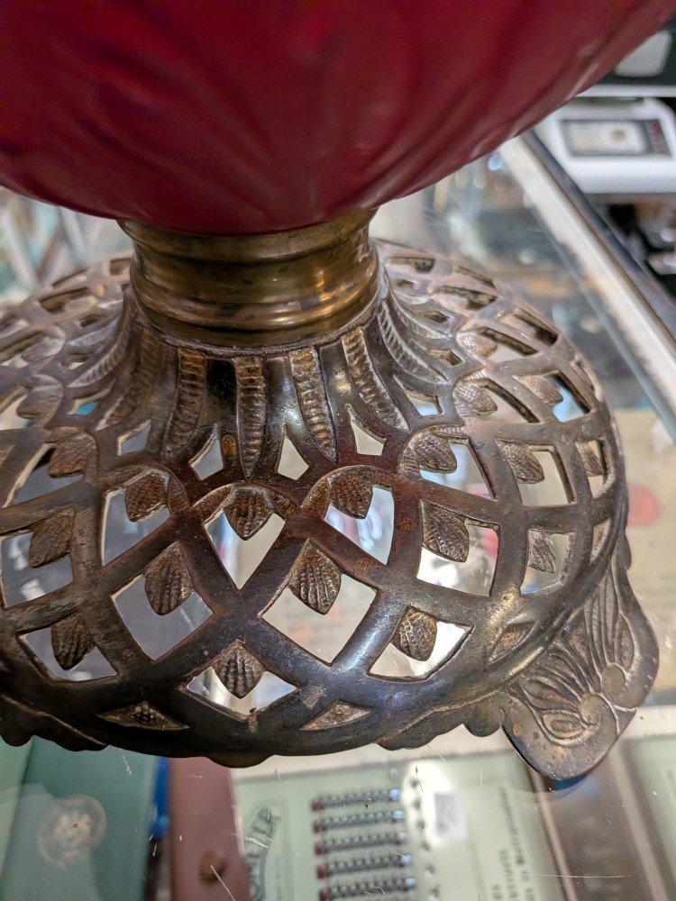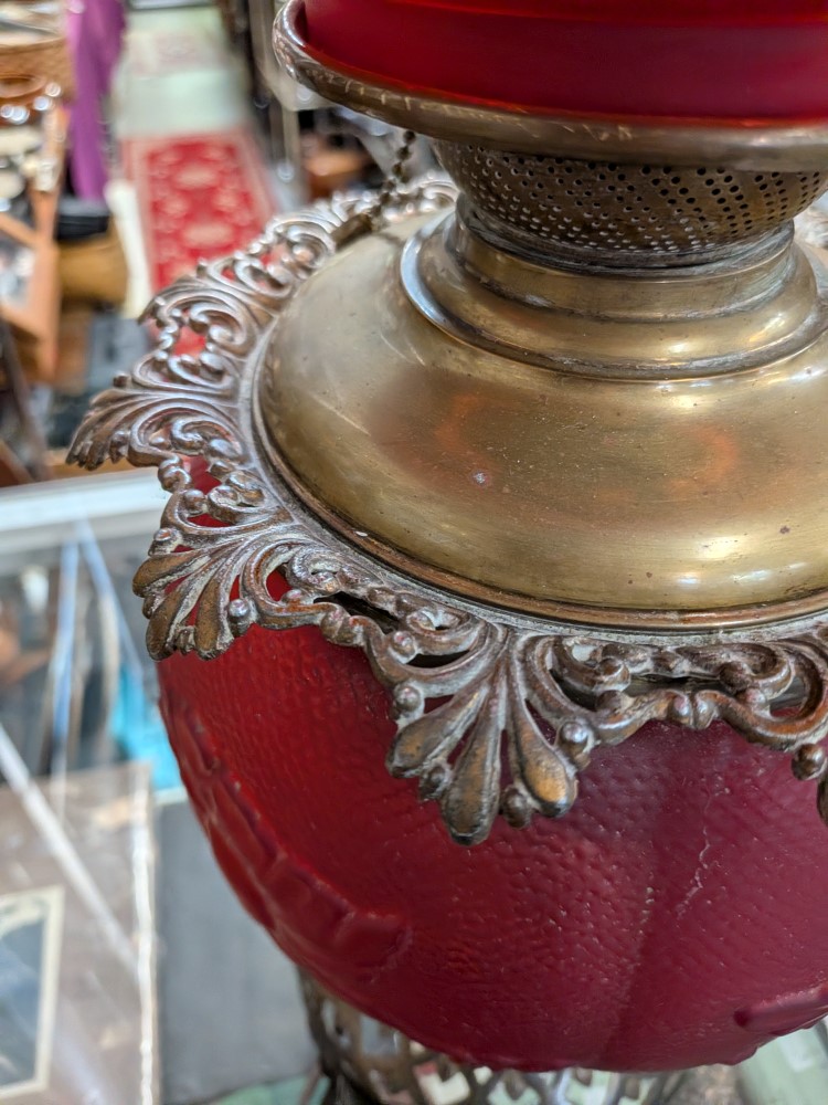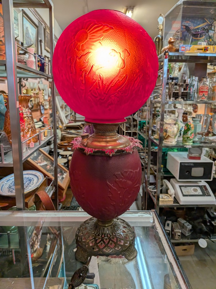 Late Victorian parlor lamp in vibrant red satin glass with an embossed poppy pattern. Originally a kerosene lamp, it has been converted to electric and features a classic ornate brass plated base.