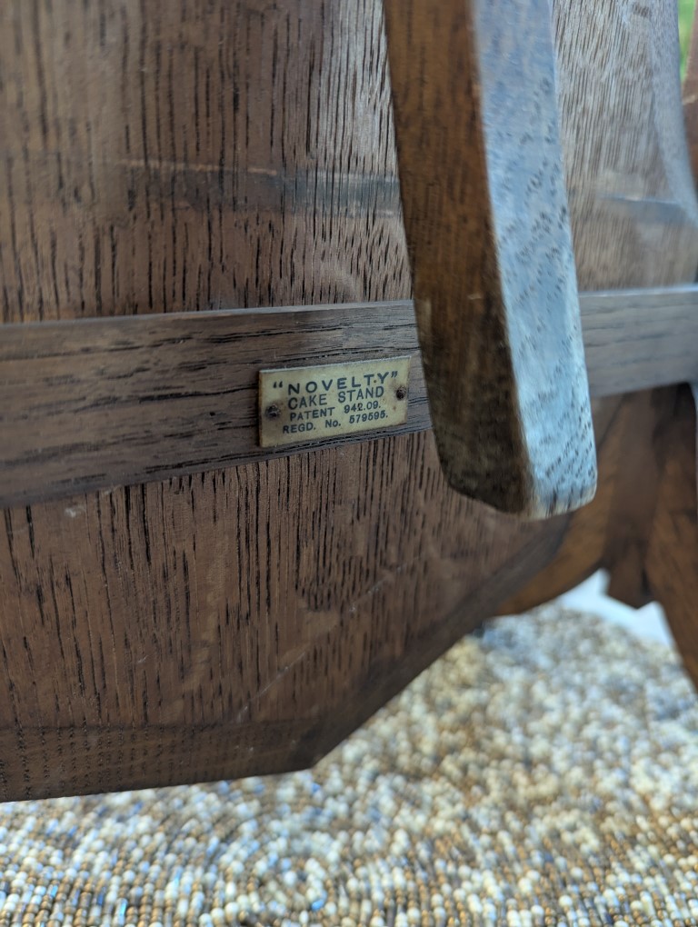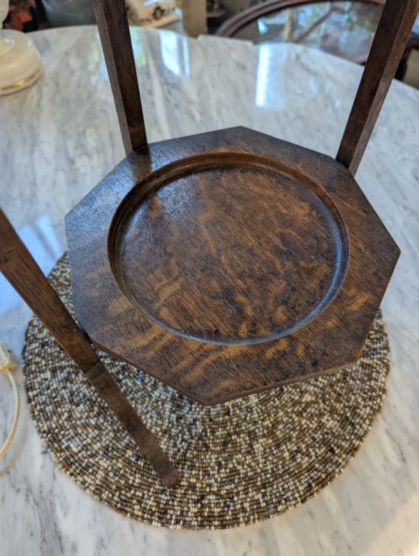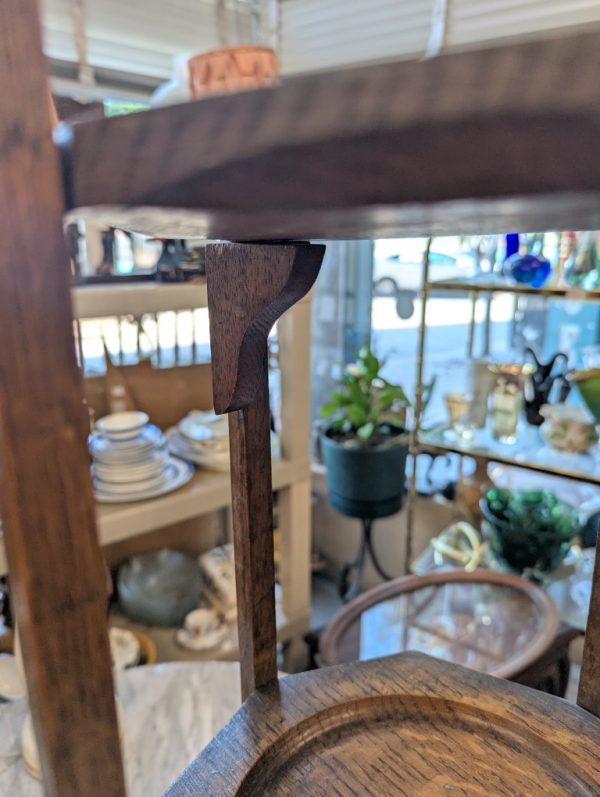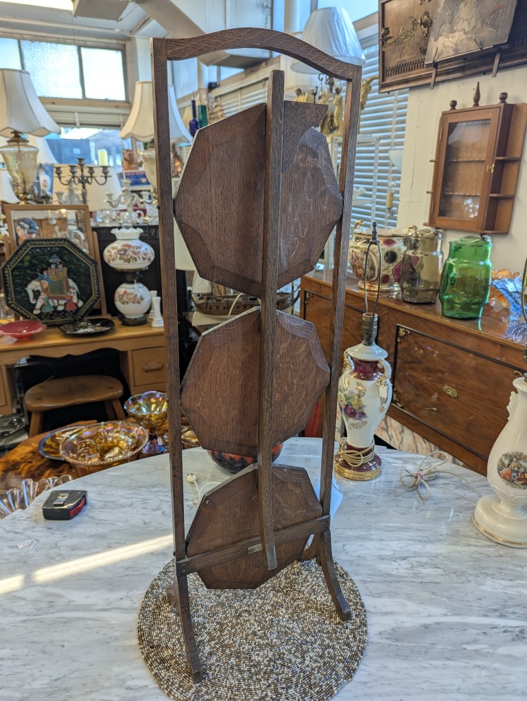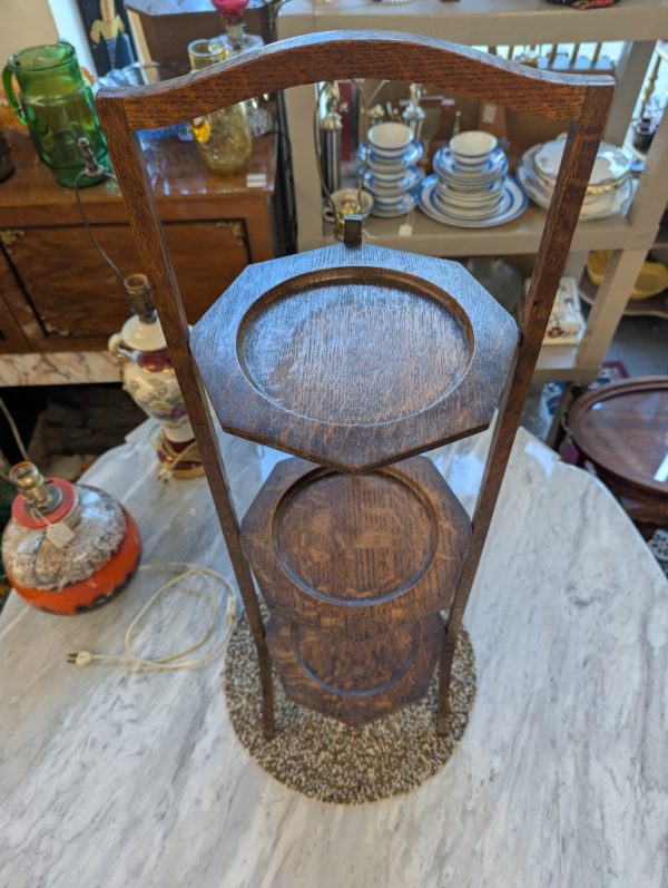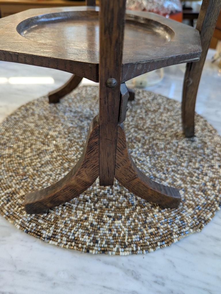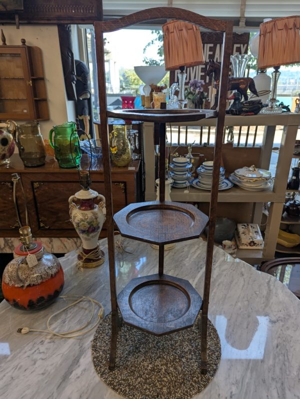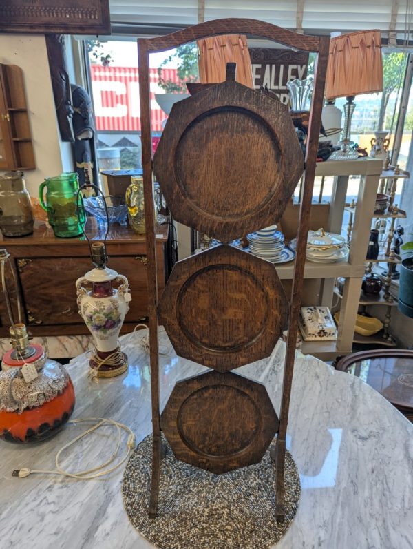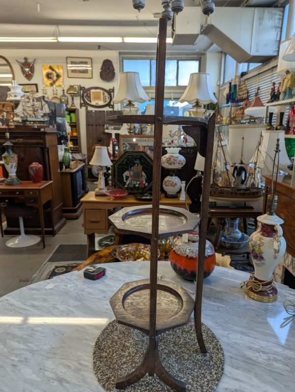 Antique 3-tier folding stand crafted from dark-stained wood, designed with octagonal trays.