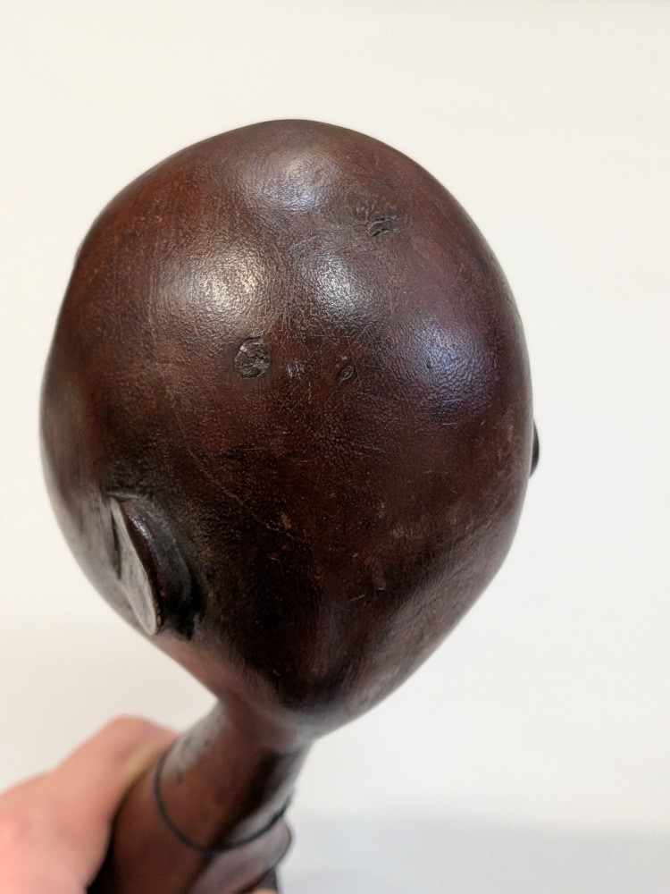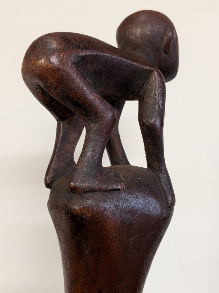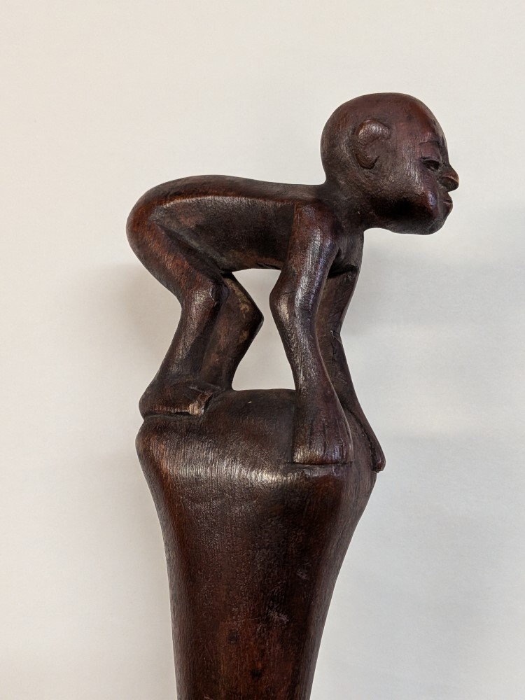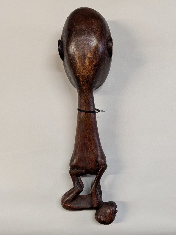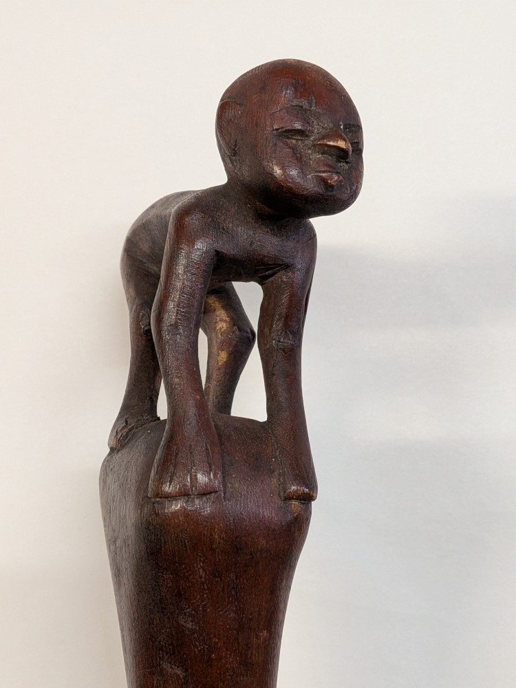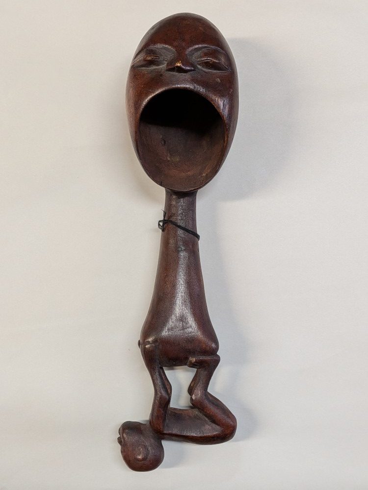 Single piece of dark, carved wood spoon. Open mouthed face scoop with kneeling carving on the base.