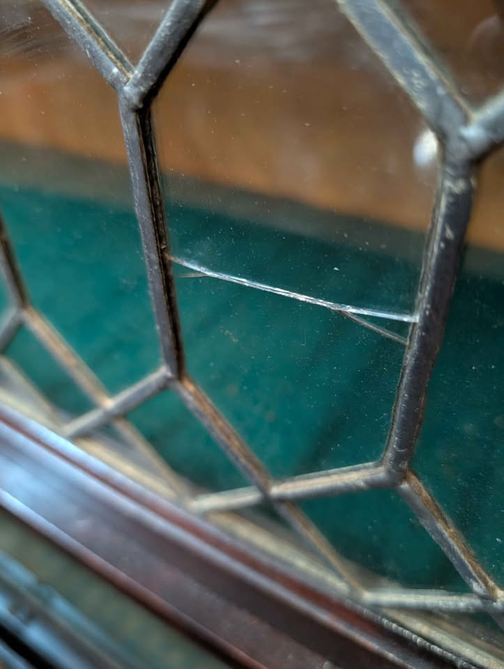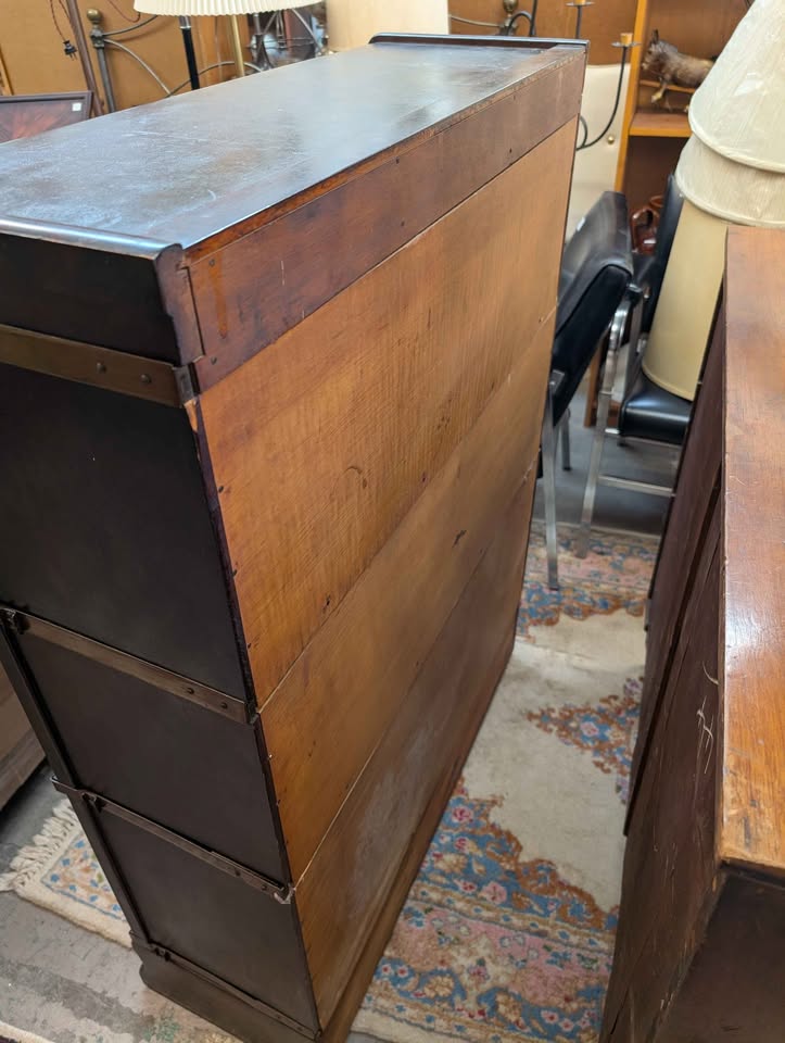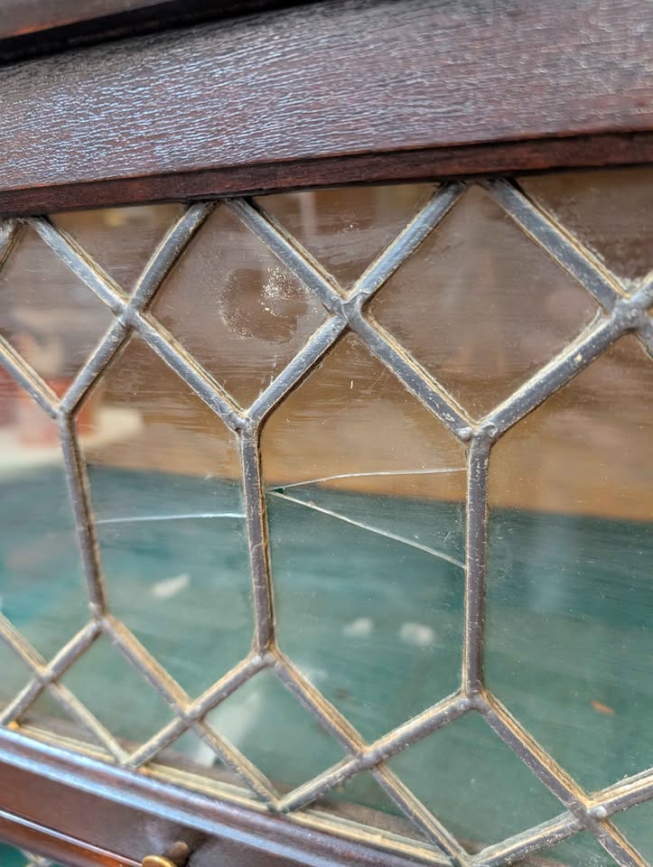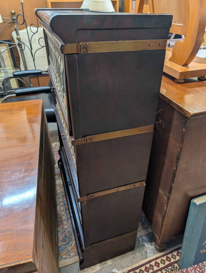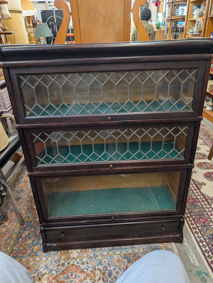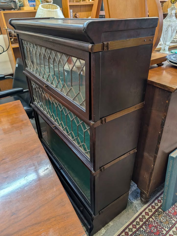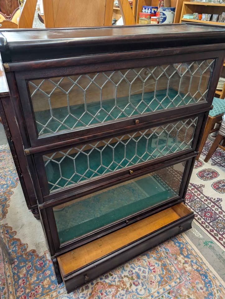 Three-section barrister bookcase with leaded glass diamond fretwork and a built in base drawer. Refer to photos for cracks on glass.