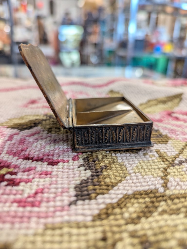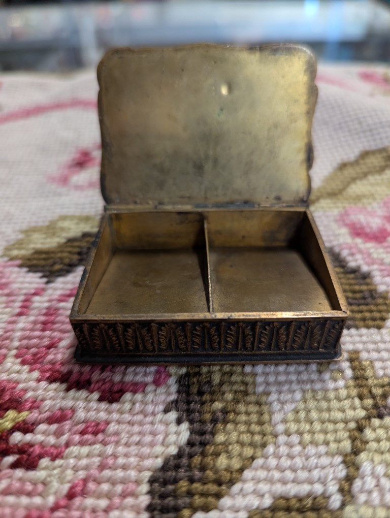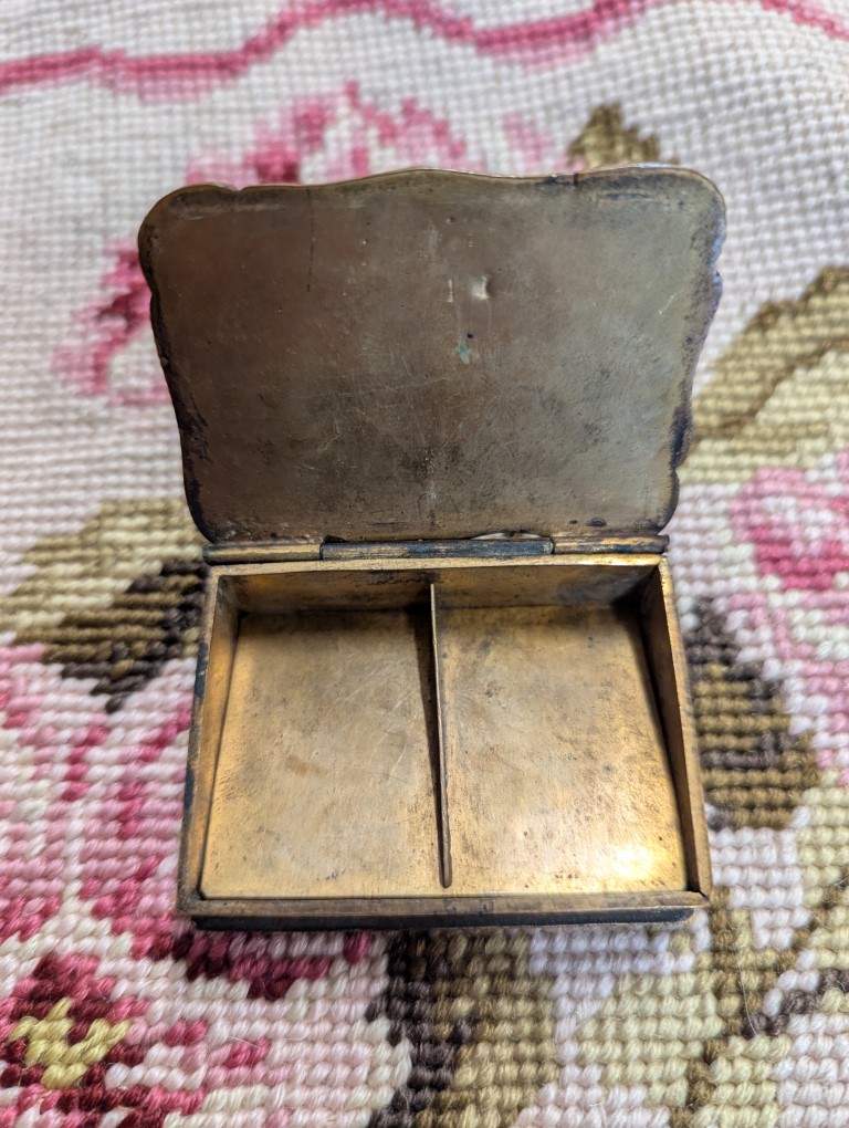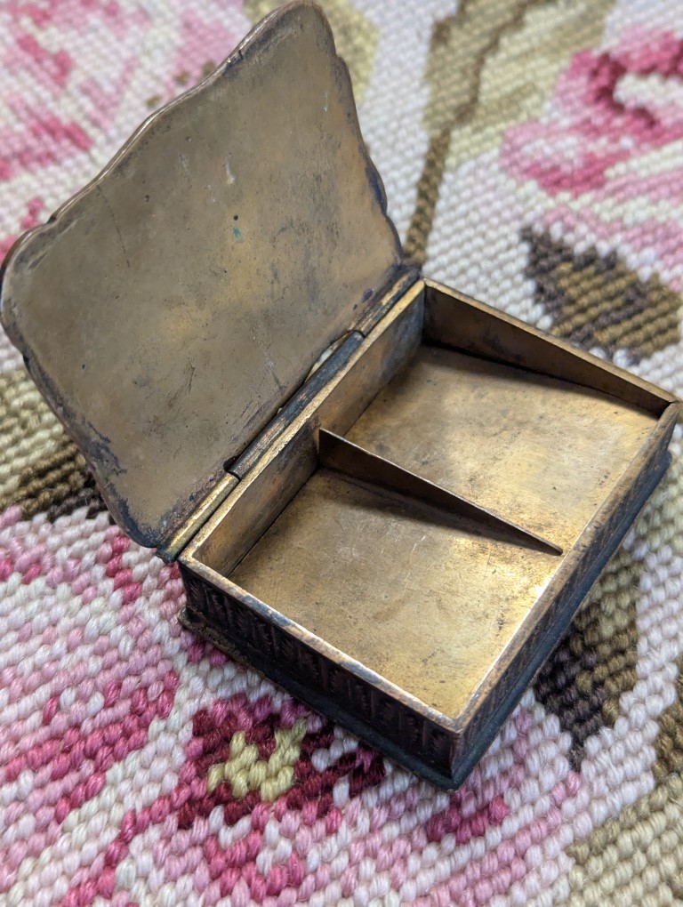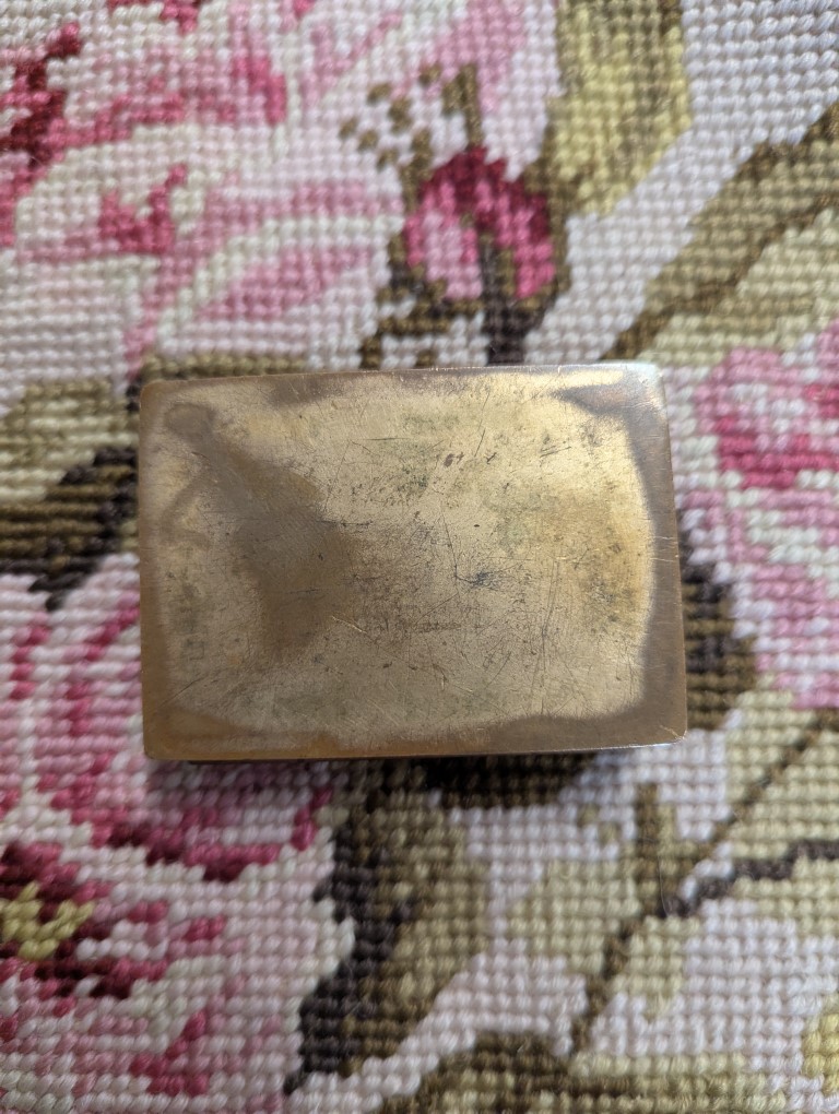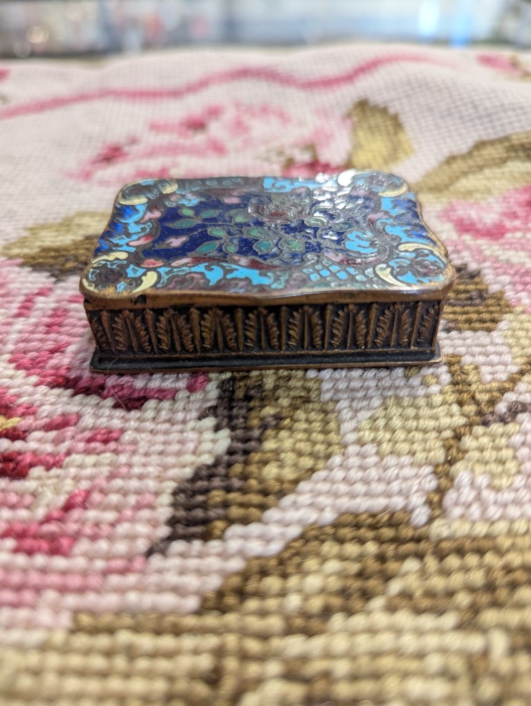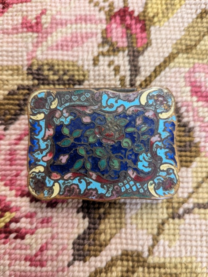 Charming antique miniature brass trinket or pill box with floral Cloisonné enamel motif. Natural wear, aging and patina please refer to photos for condition.