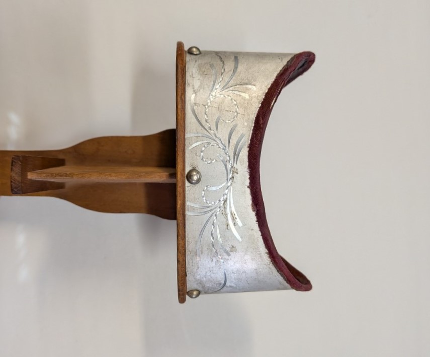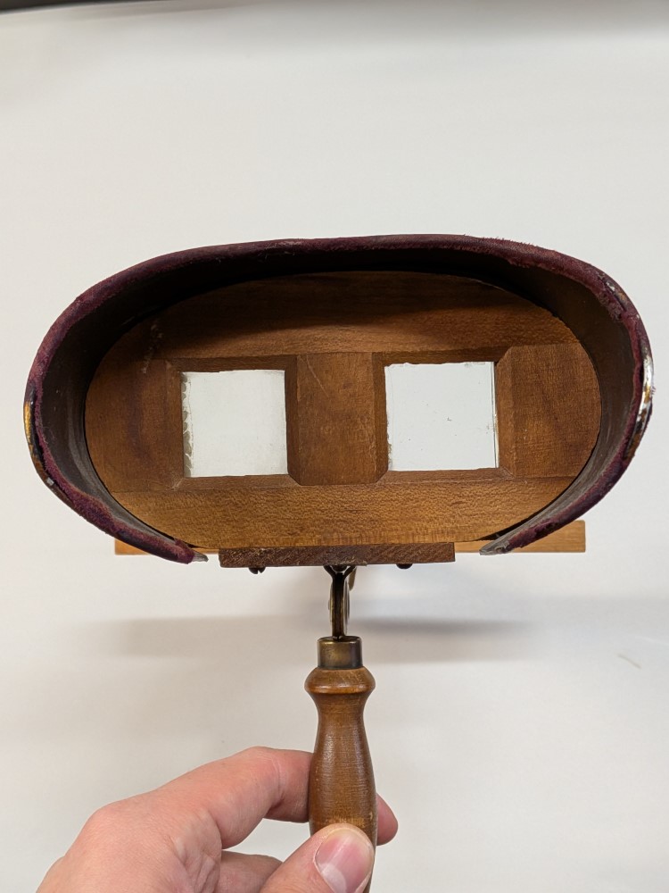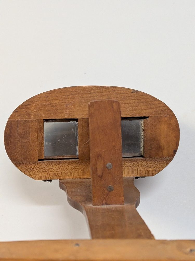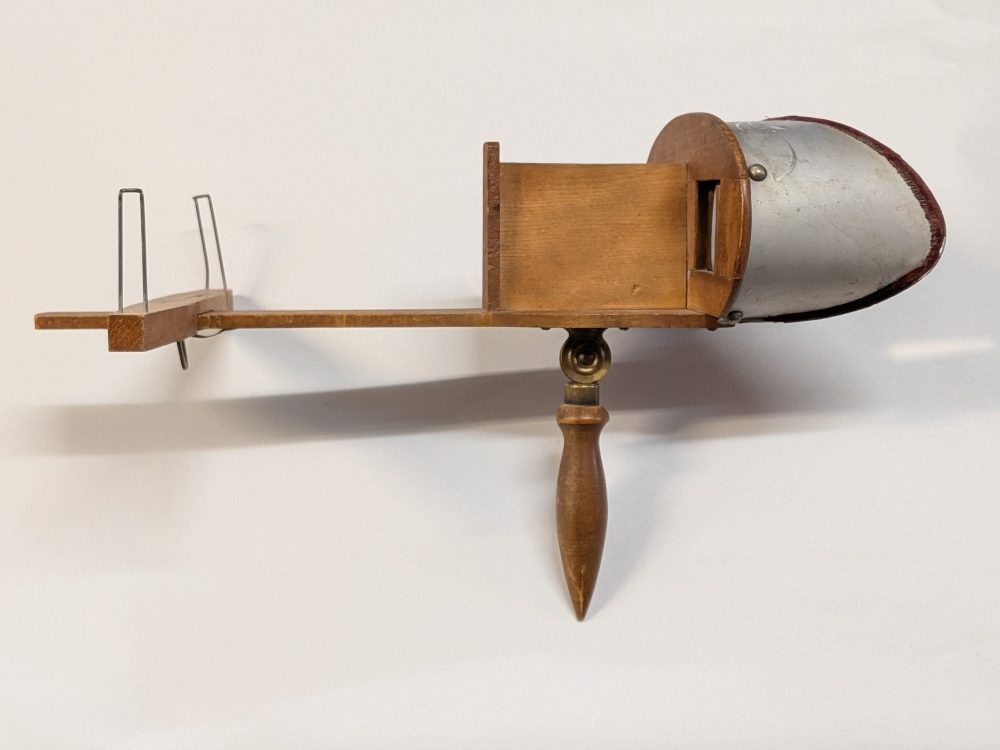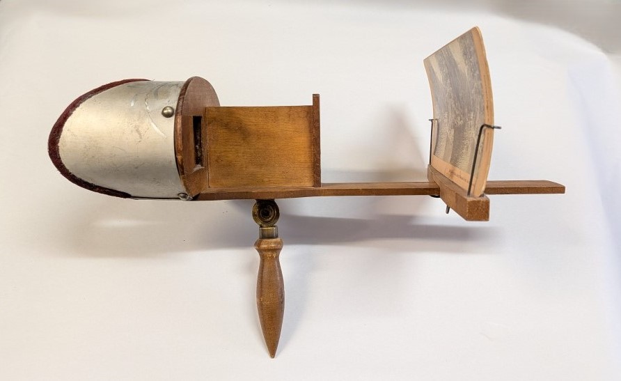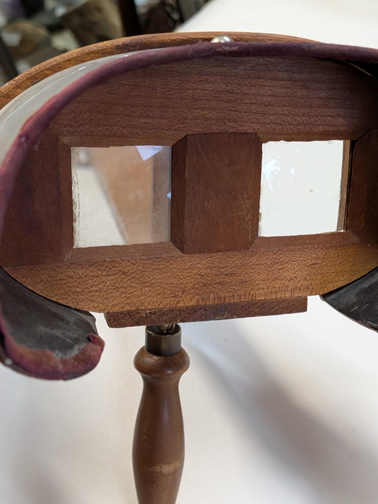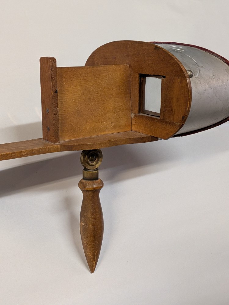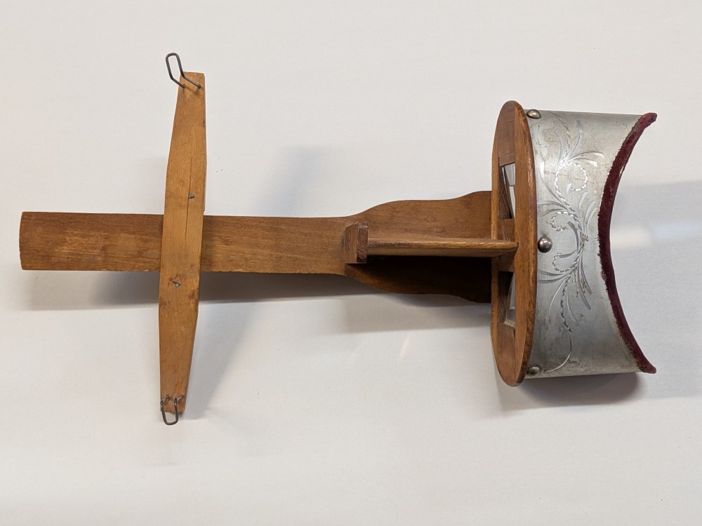 Early 1900s Stereoscope with lightweight aluminum hood, floral engraving, velvet trim, and folding wooden handle with brass hardware.