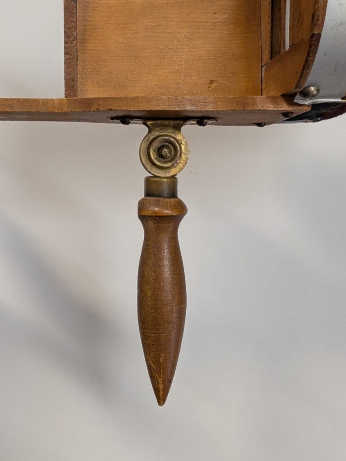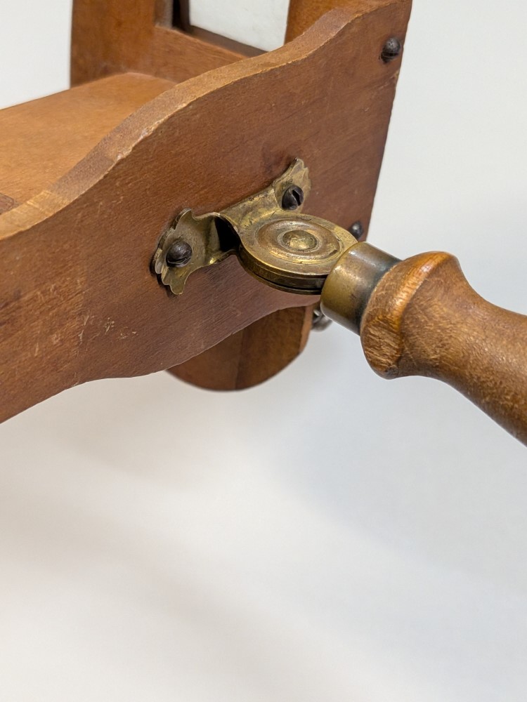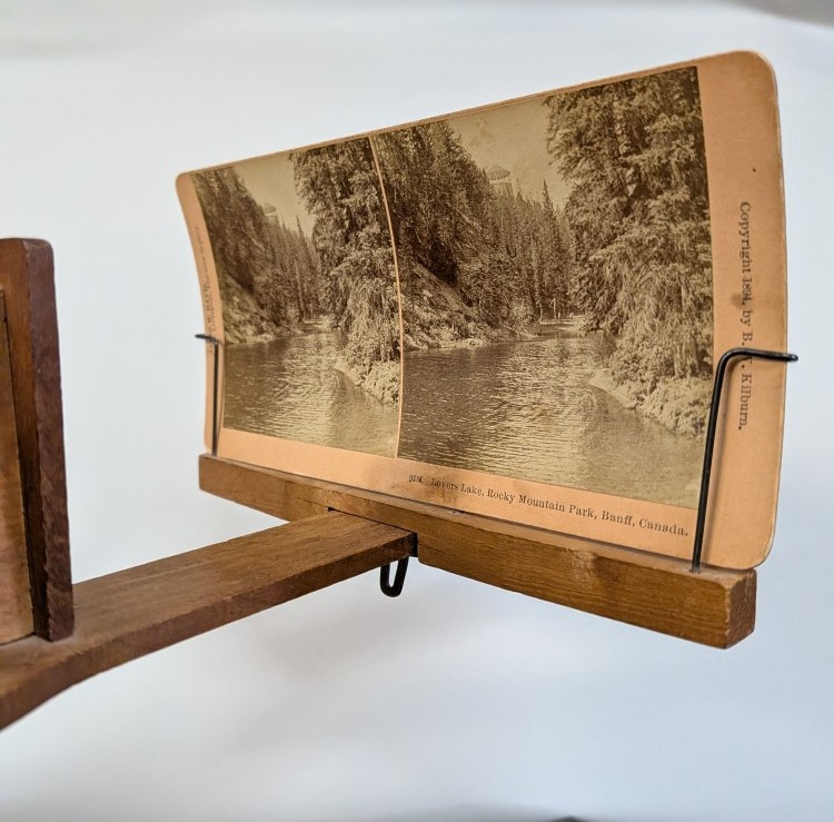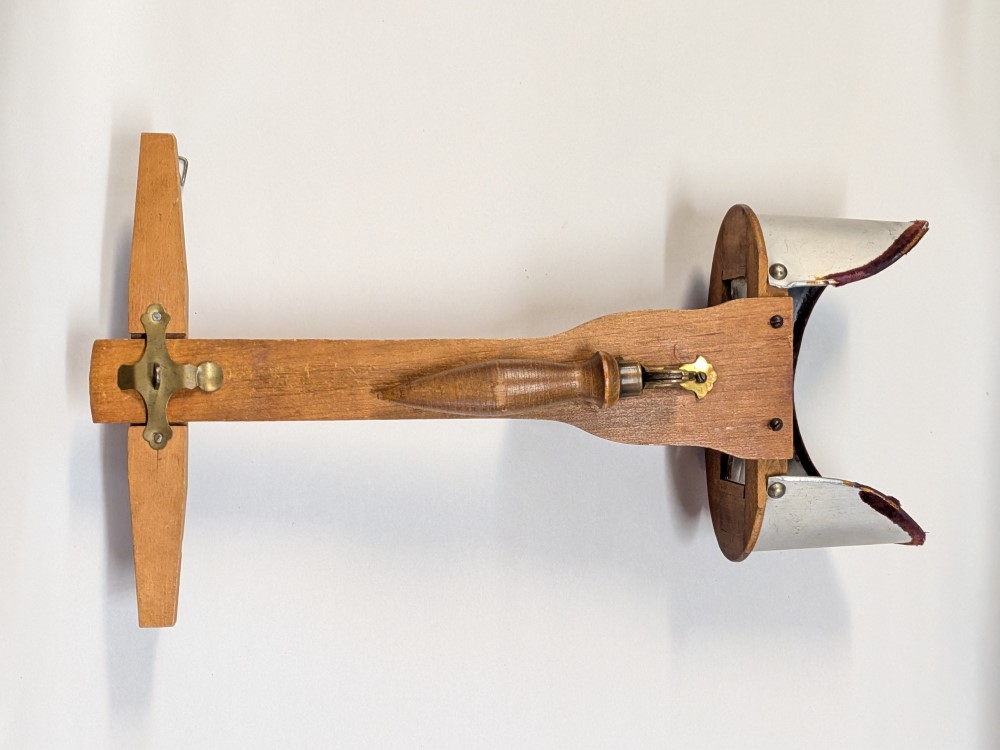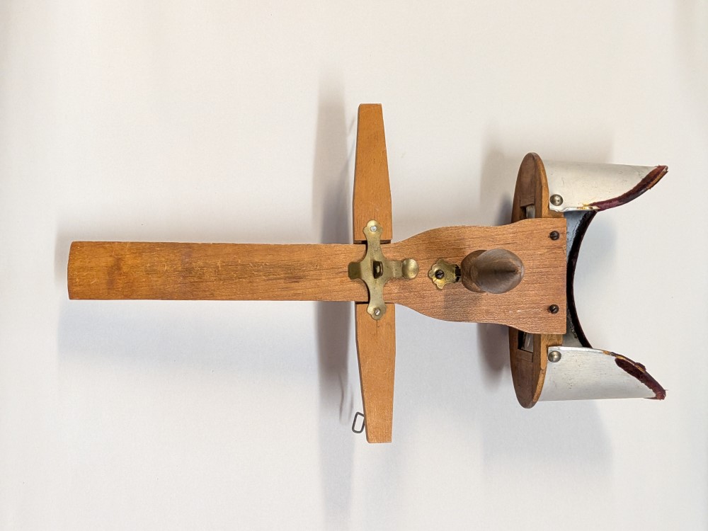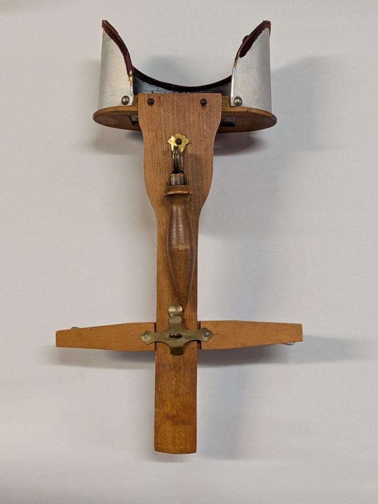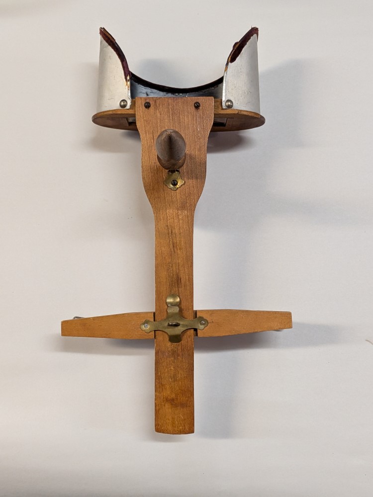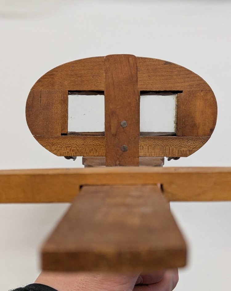 Early 1900s Stereoscope with lightweight aluminum hood, floral engraving, velvet trim, and folding wooden handle with brass hardware.