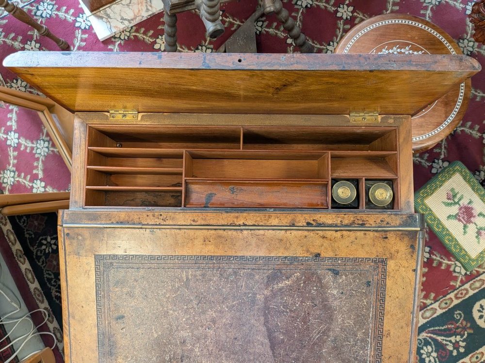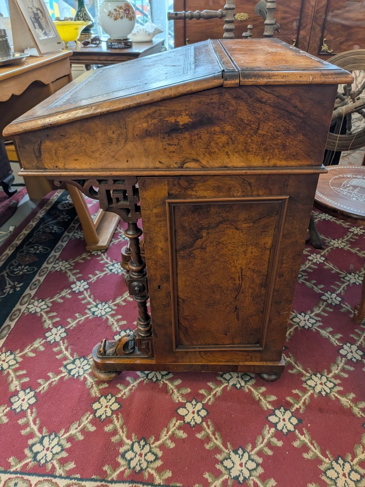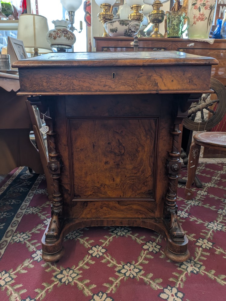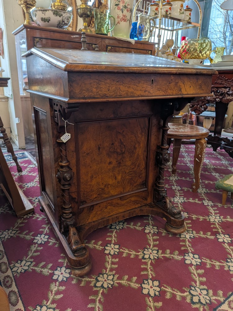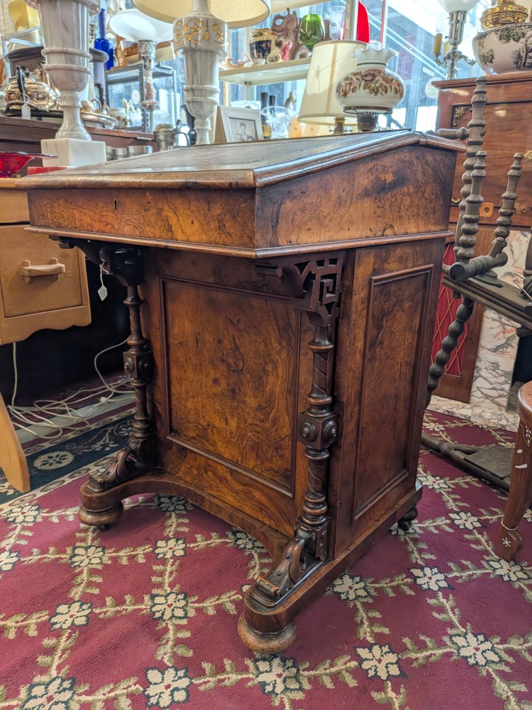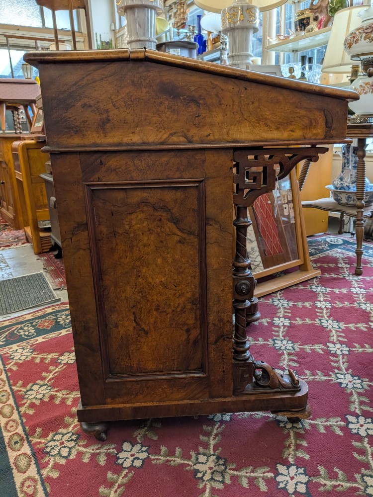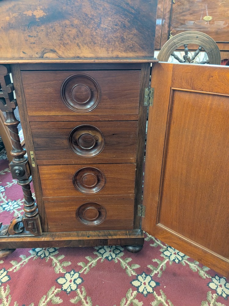 Antique walnut Davenport desk with a sloped leather writing surface and four side drawers. It features ornate spiral pillars and original castor wheels for easy movement.