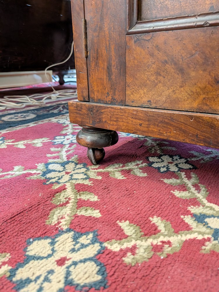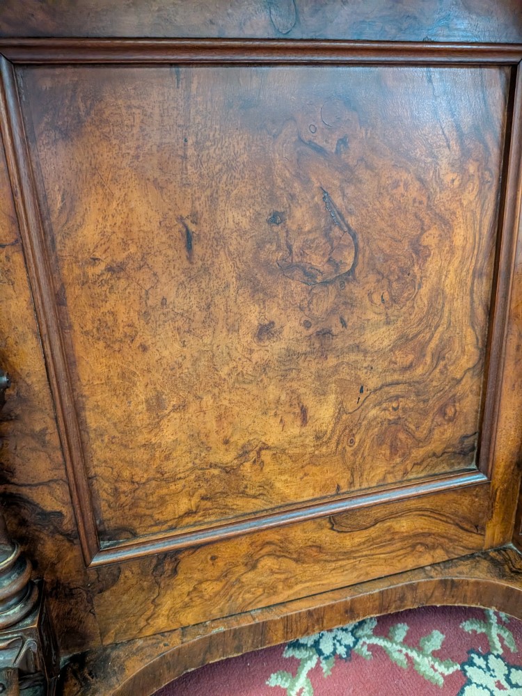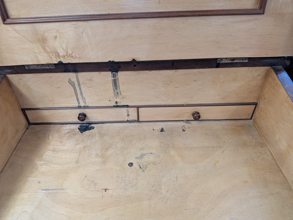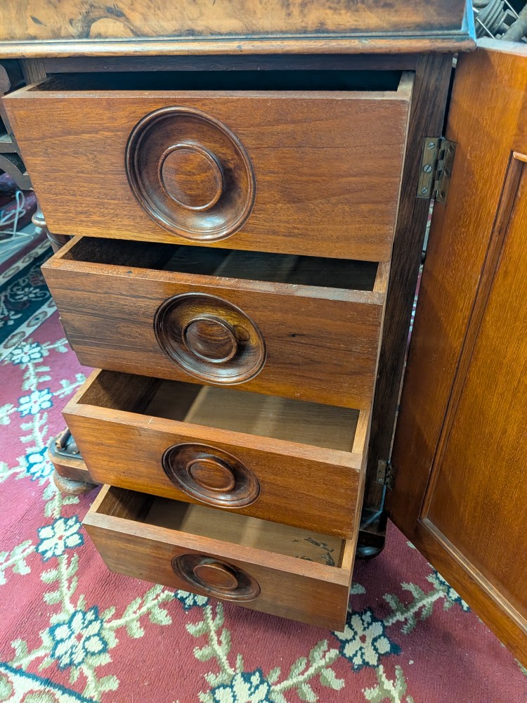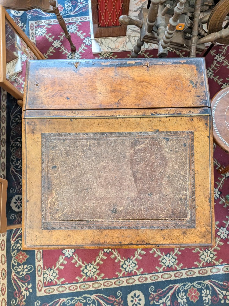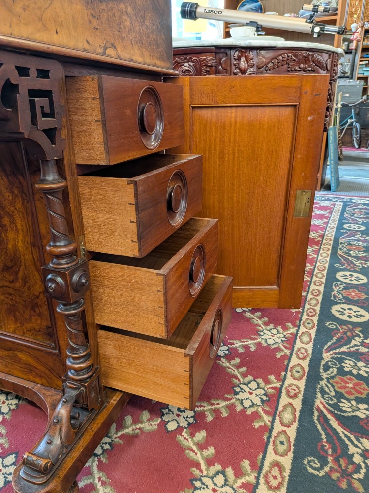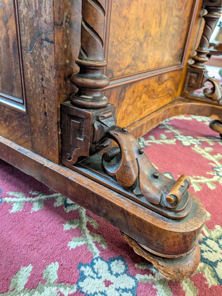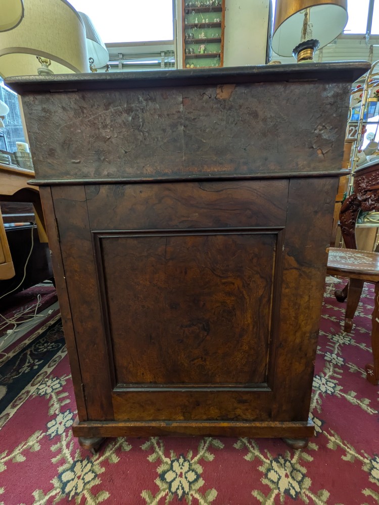Antique walnut Davenport desk with a sloped leather writing surface and four side drawers. It features ornate spiral pillars and original castor wheels for easy movement.