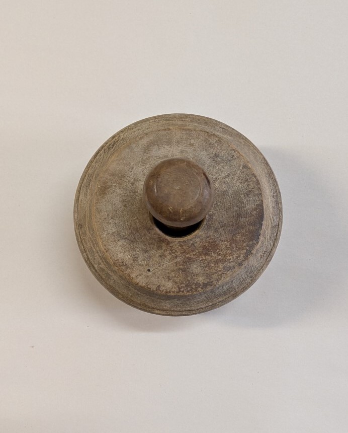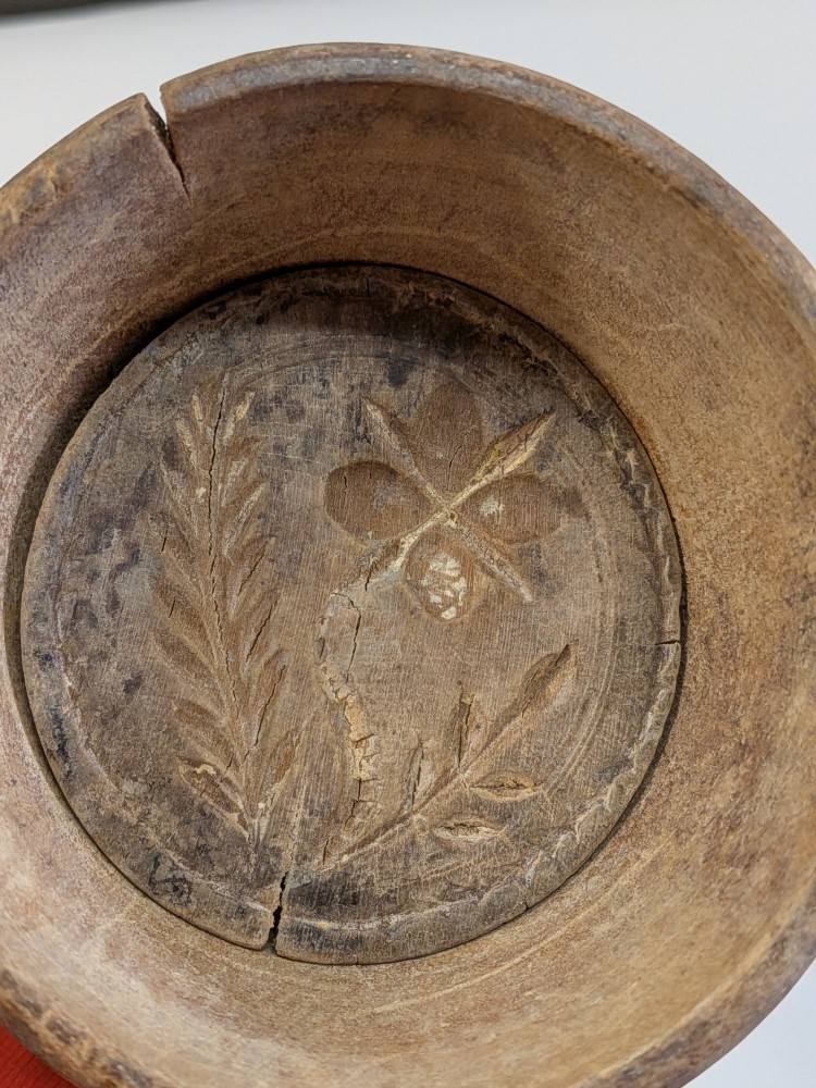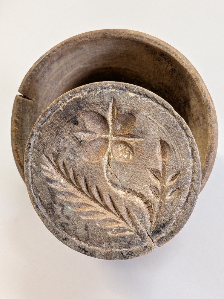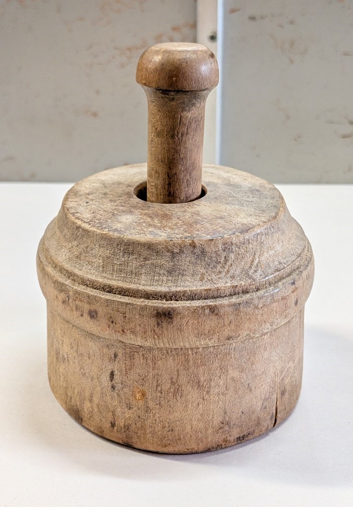 Antique primitive wooden plunger style butter mold with hand carved floral and fern design. Lovely rich dark farmhouse patina.