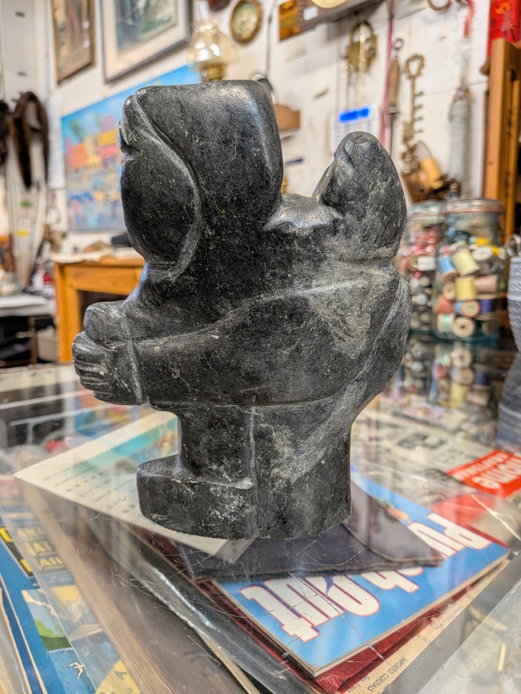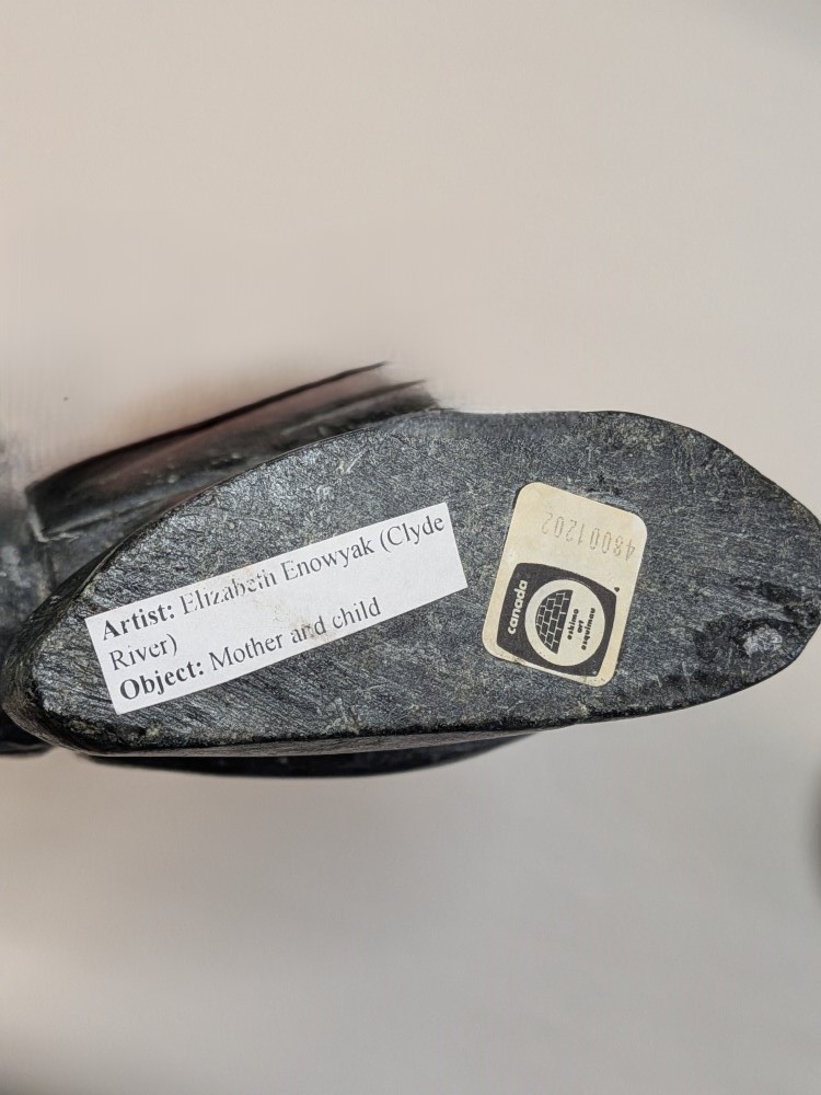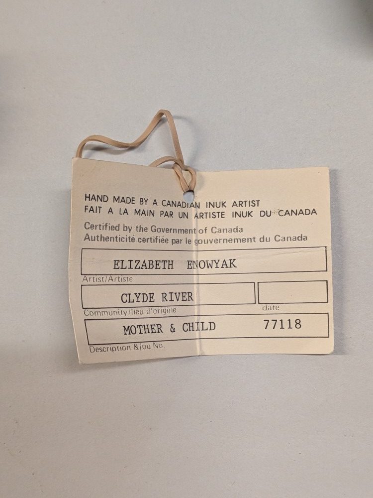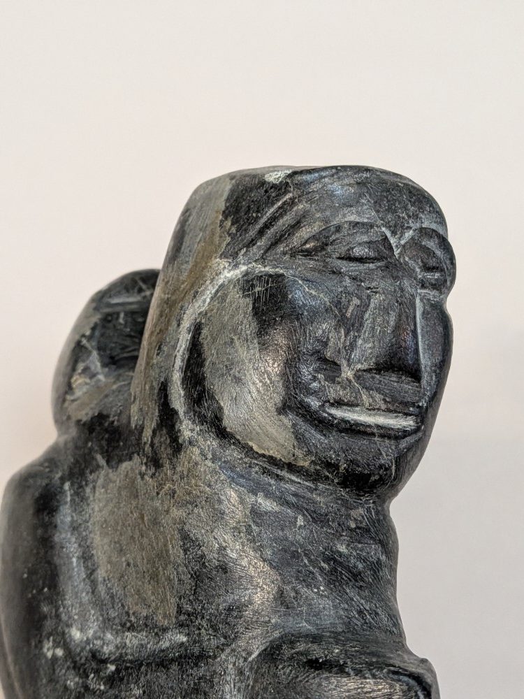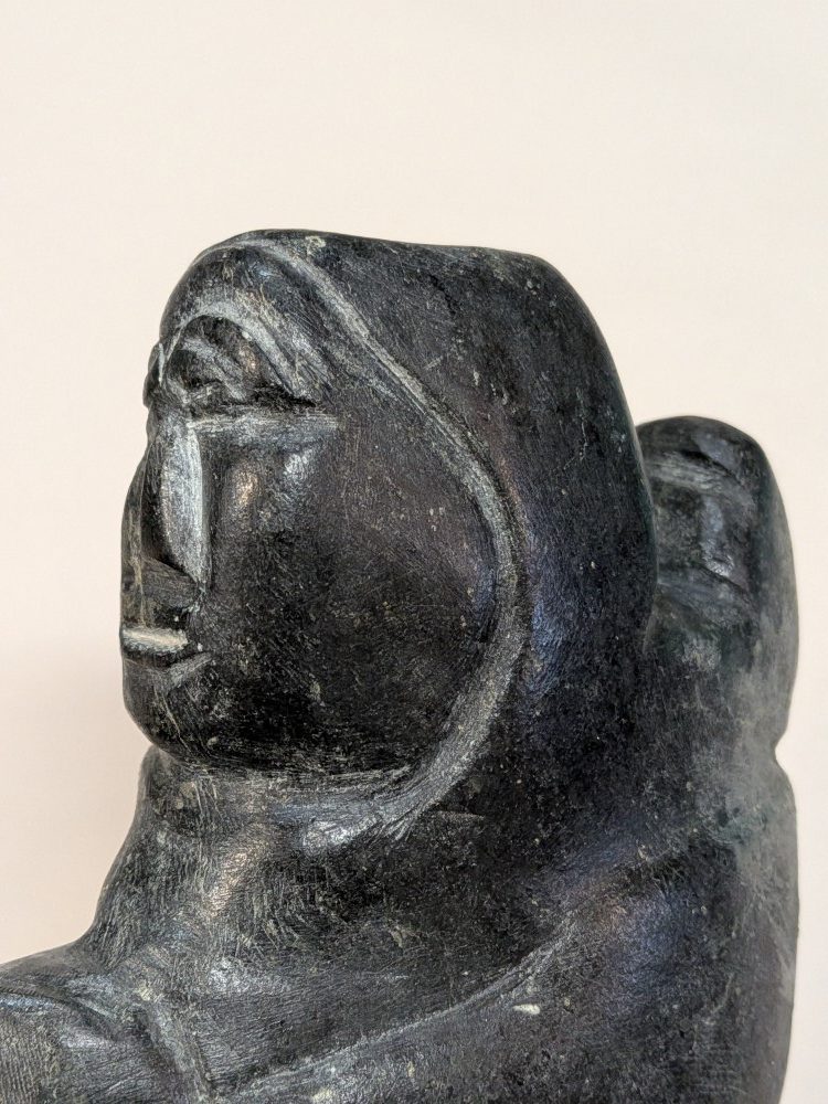 Authentic vintage soapstone carving by Elizabeth Enowyak Clyde River of a mother carrying a child in her amauti hood. Classic Inuit sculpture in dark soapstone, complete with the original artist label and authenticity tag.