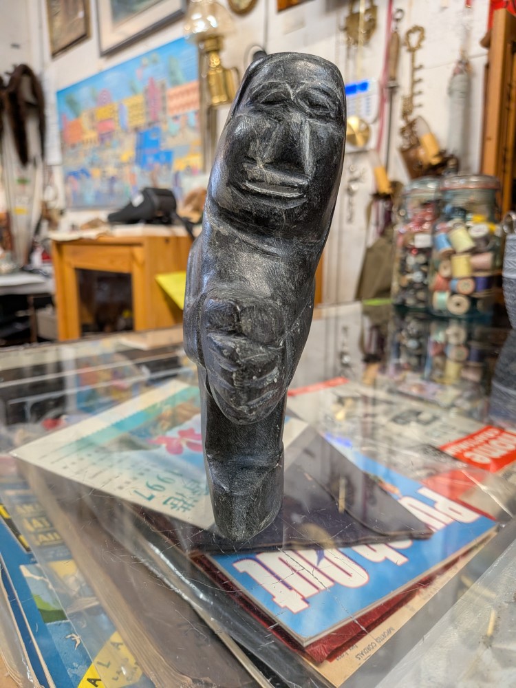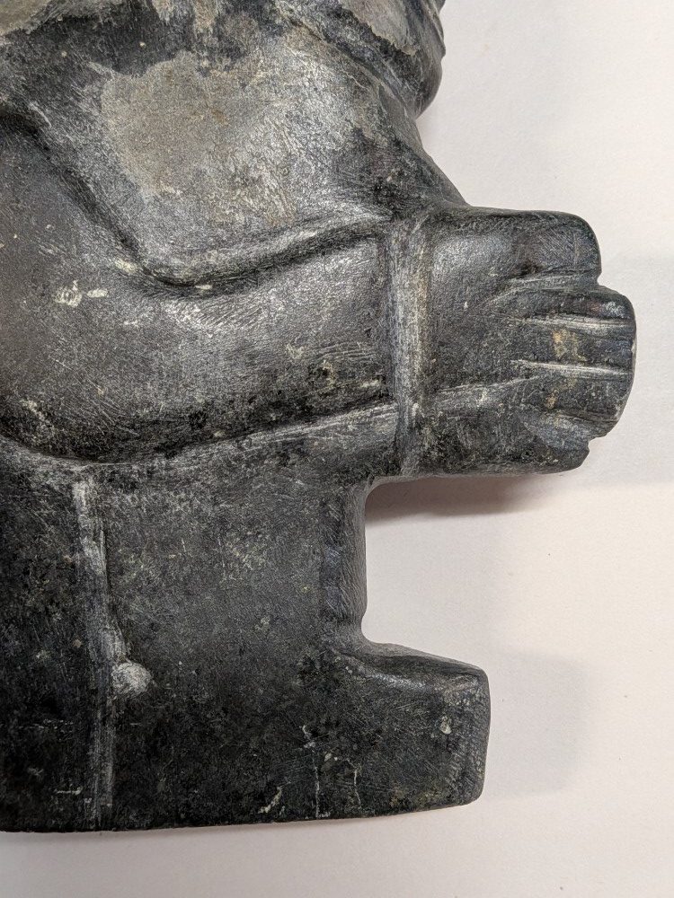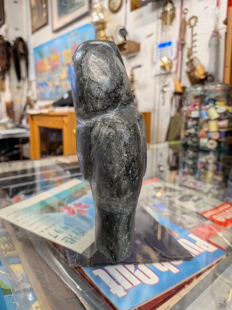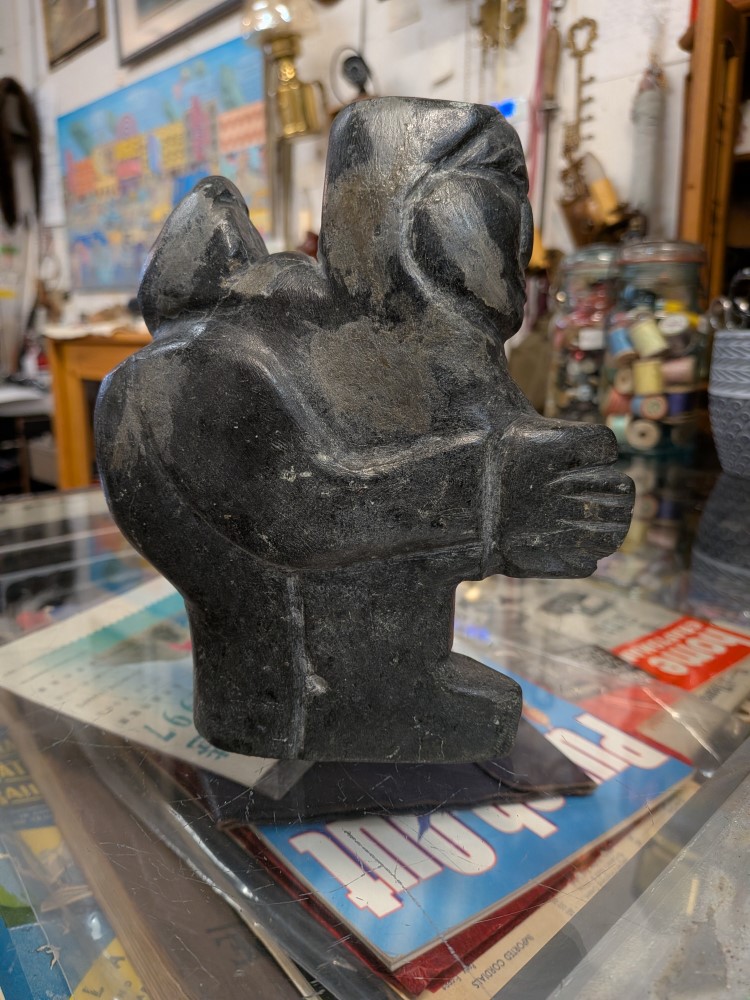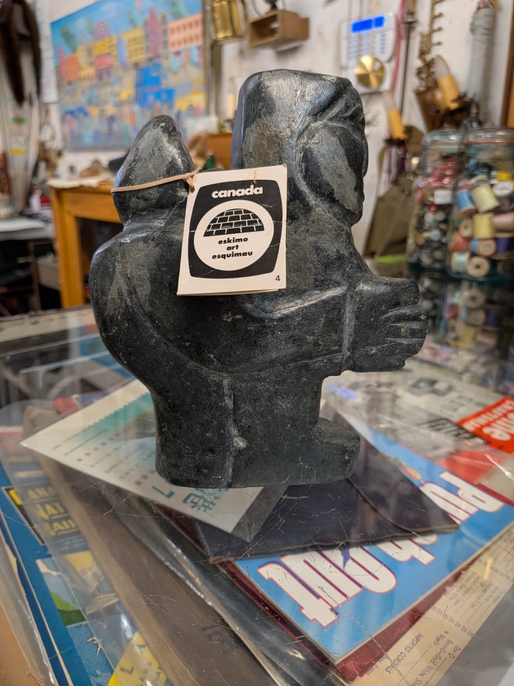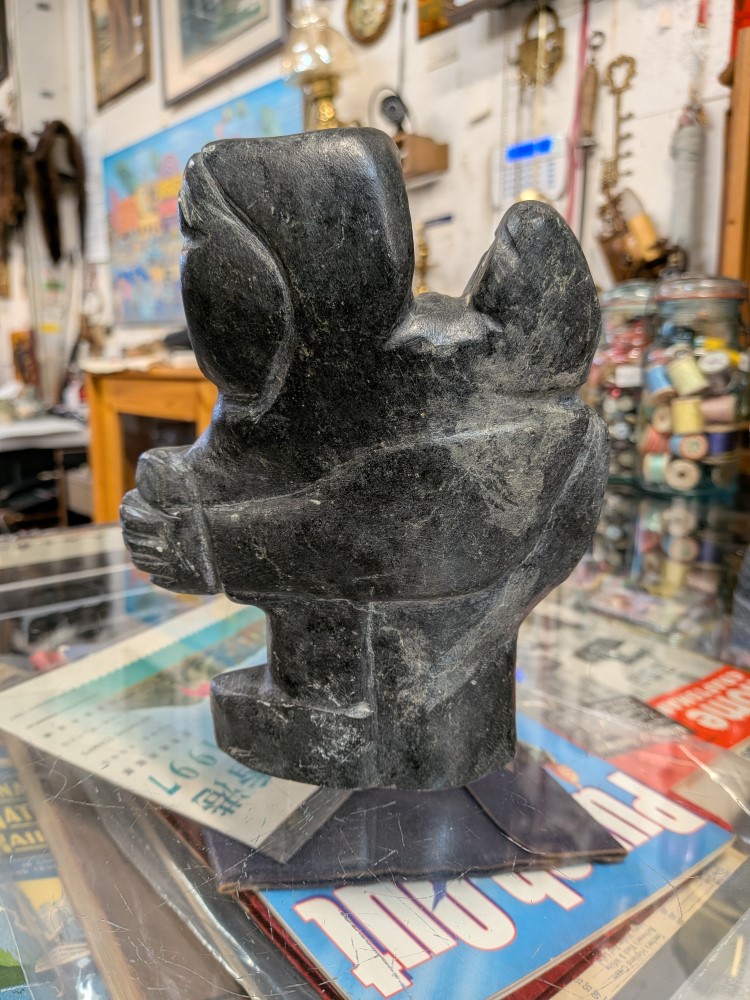 Authentic vintage soapstone carving by Elizabeth Enowyak Clyde River of a mother carrying a child in her amauti hood. Classic Inuit sculpture in dark soapstone, complete with the original artist label and authenticity tag.