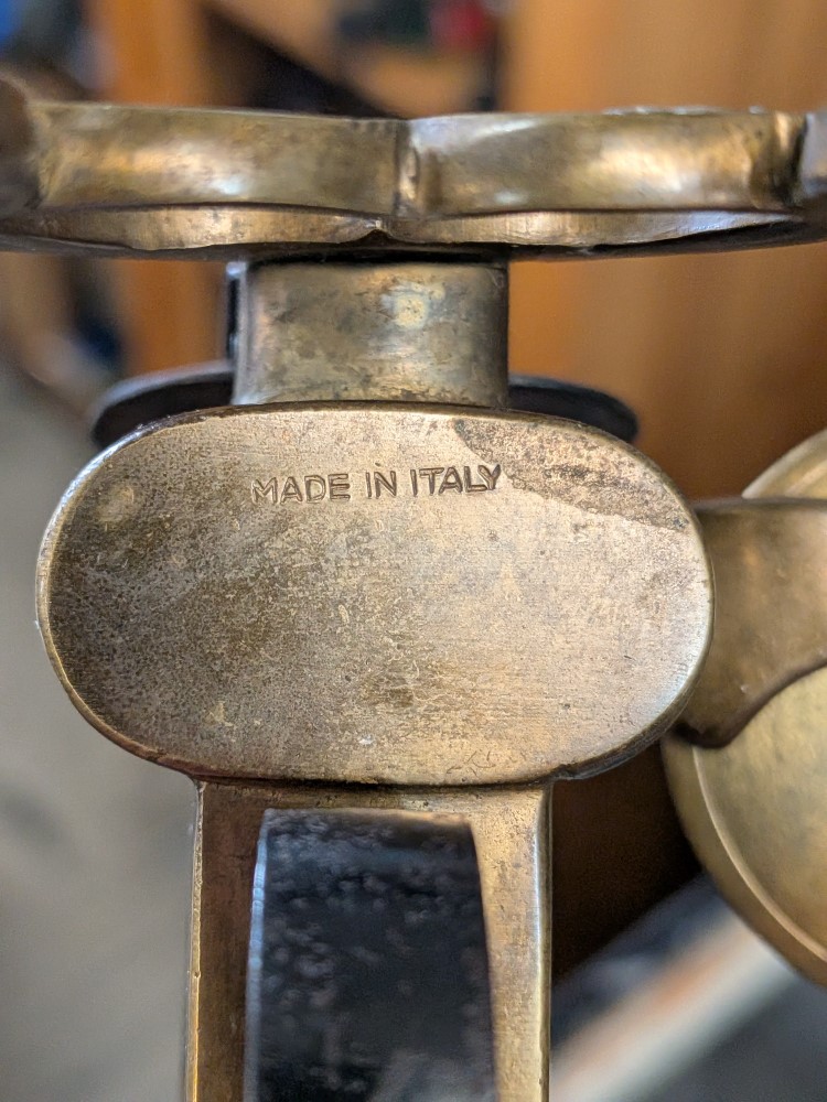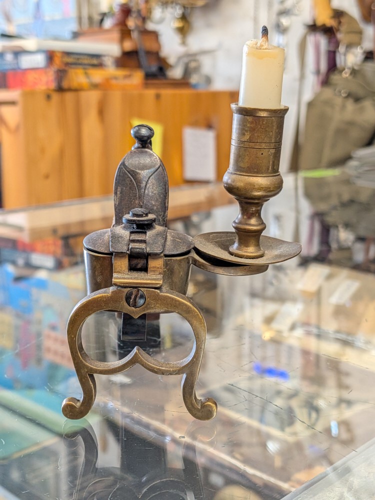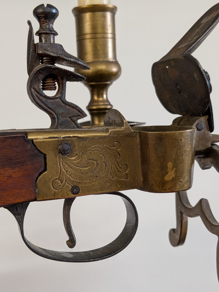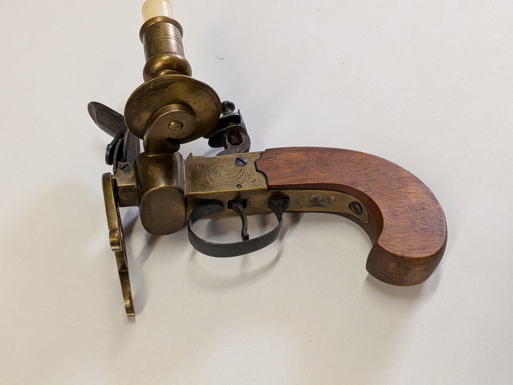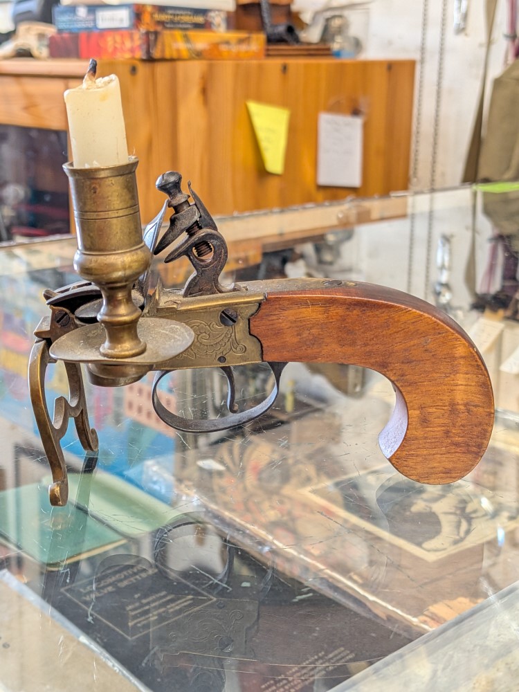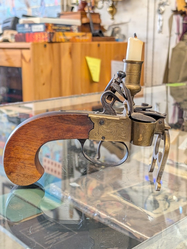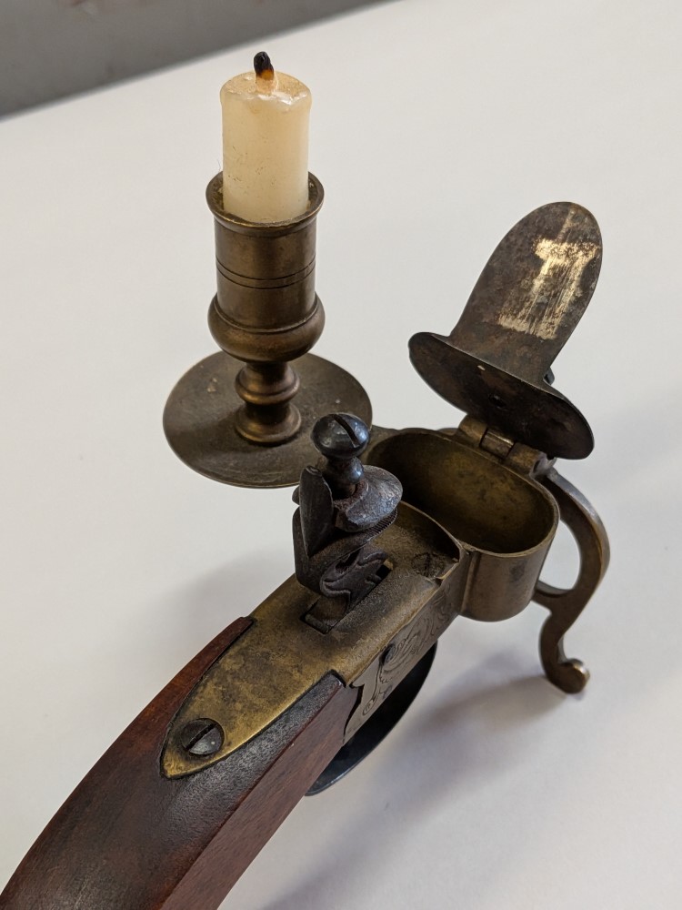 Unique piece combining the look of an antique Italian style flintlock pistol with a functional brass candle holder and tinder lighter mechanism. Mid 20th century.