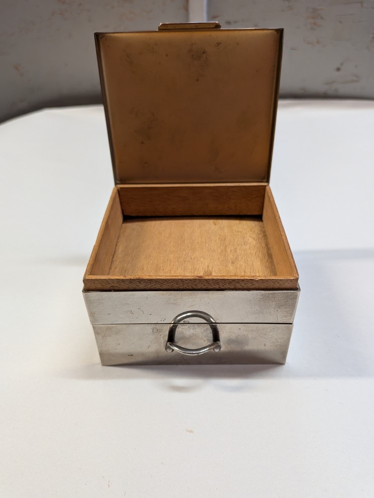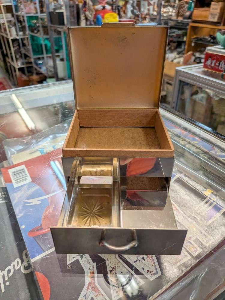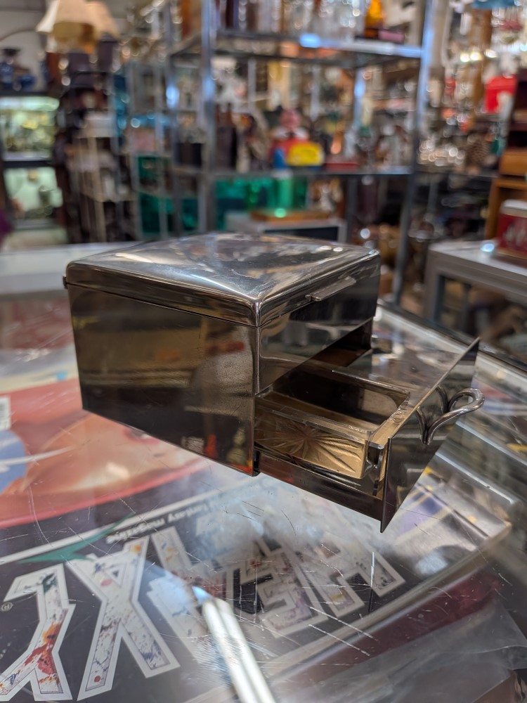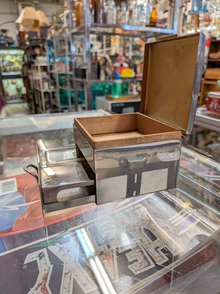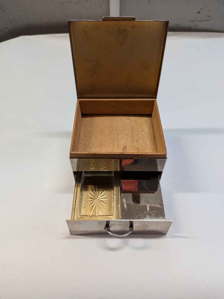Vintage cigarette box, functional design with a cedar lined top compartment. The bottom drawer including a glass ashtray and a dedicated slot for a matchbox, making it a complete mid century tabletop smoking set.