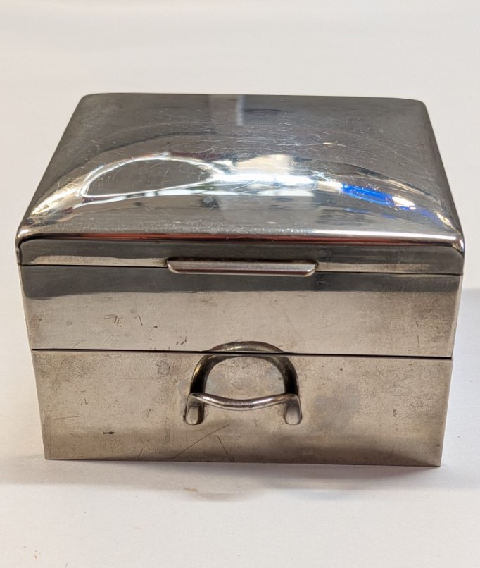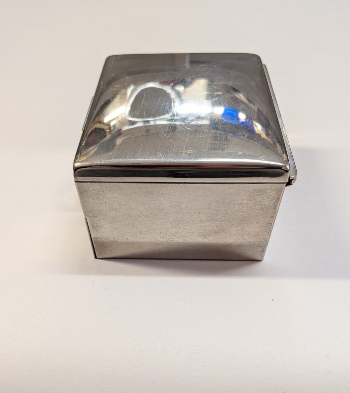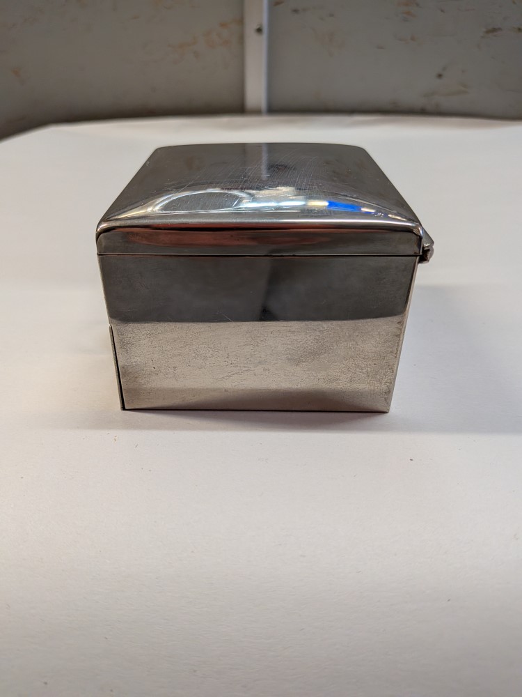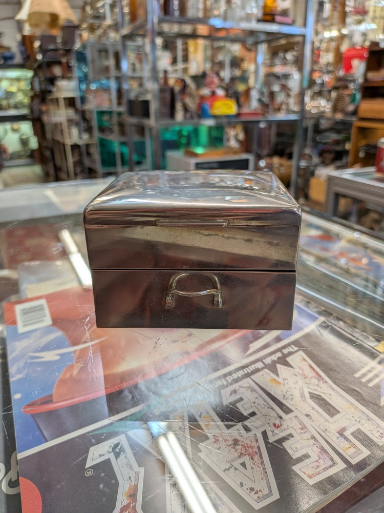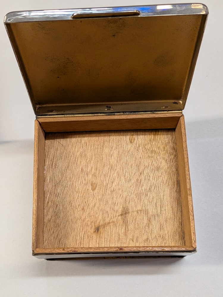 Vintage cigarette box, functional design with a cedar lined top compartment. The bottom drawer including a glass ashtray and a dedicated slot for a matchbox, making it a complete mid century tabletop smoking set.