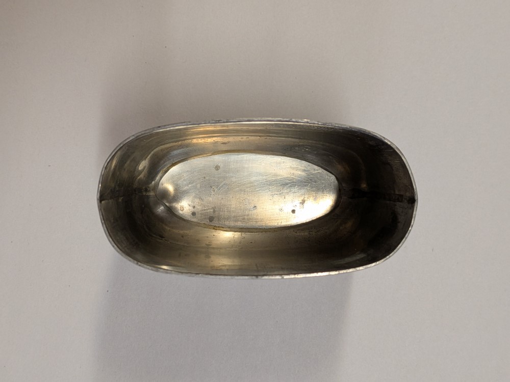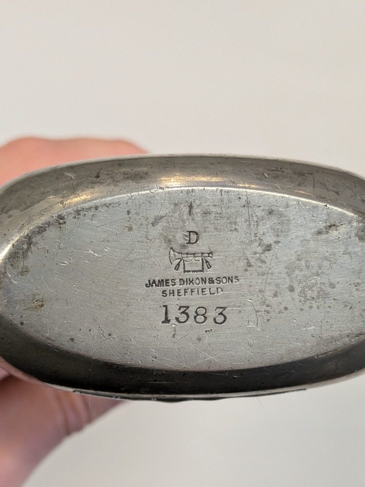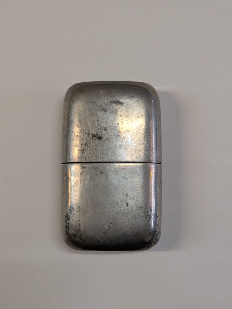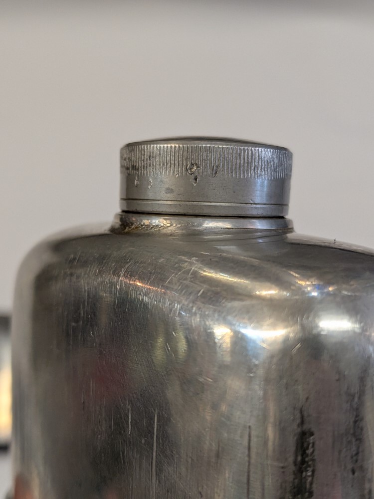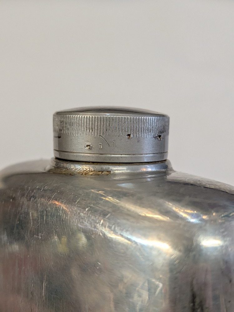 Sheffield pewter flask with two piece design, including a friction fit removable drinking cup and a threaded top. Showing heavy patina consistent with mid 1800s use.