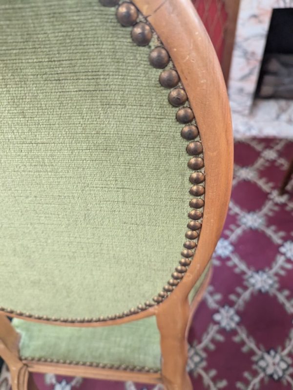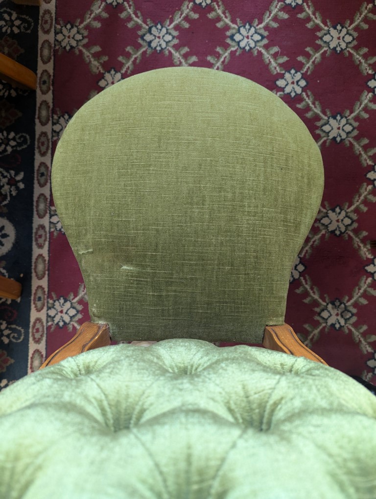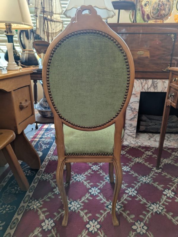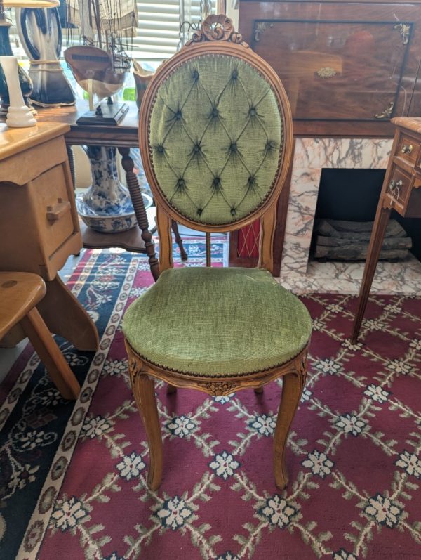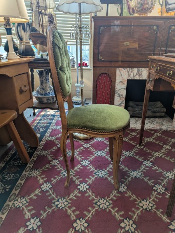Elegant Louis XV style side chair with carved wood frame, floral and scroll accents. The medallion backrest is upholstered in tufted green fabric with button details.