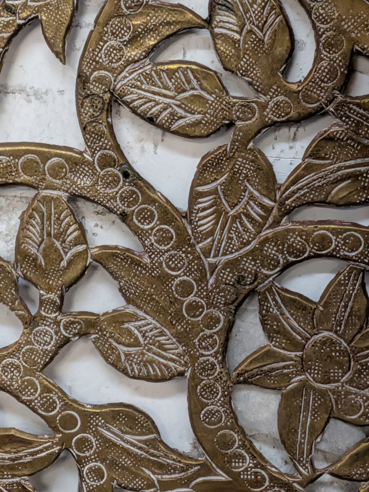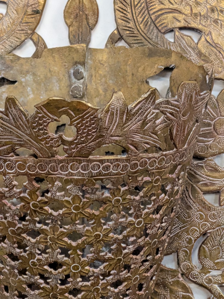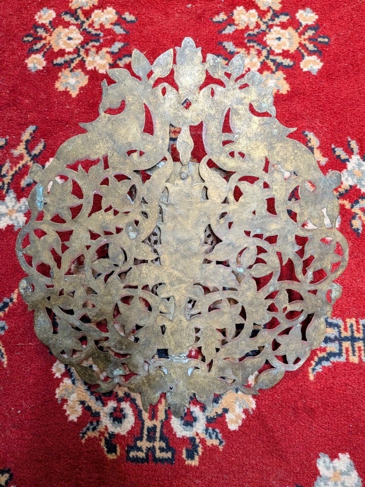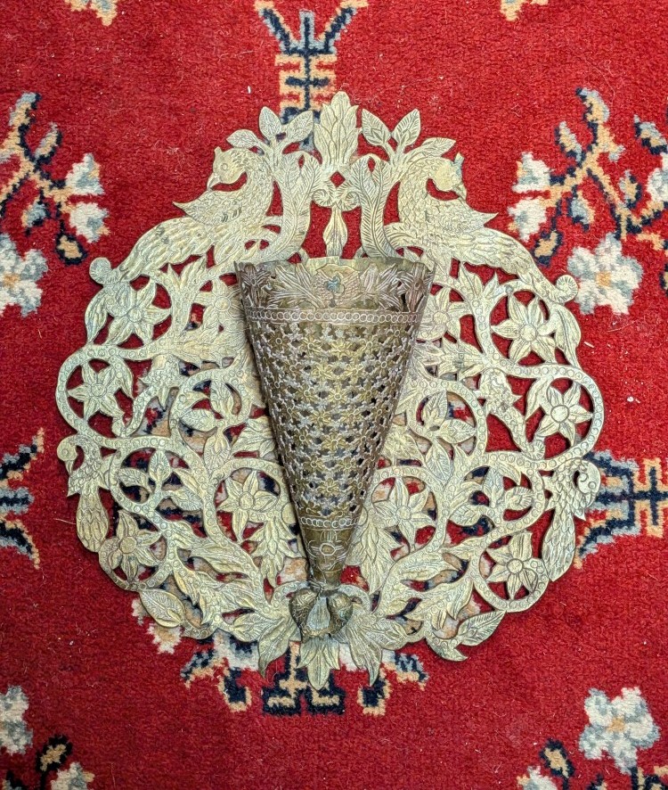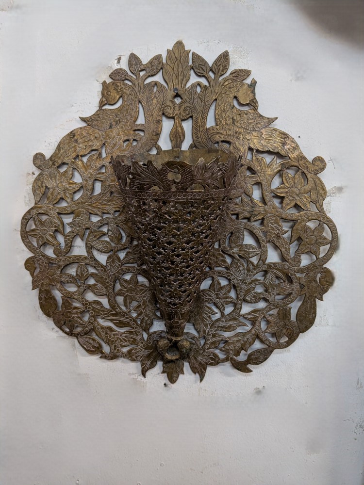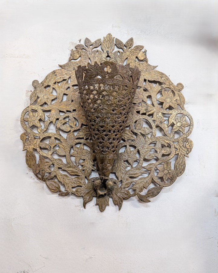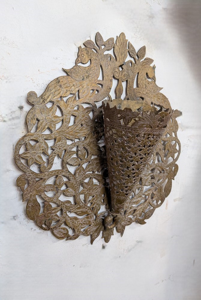 Handcrafted solid brass with an intricate filigree and pierced metal design exotic moroccan wall pocket sconce.