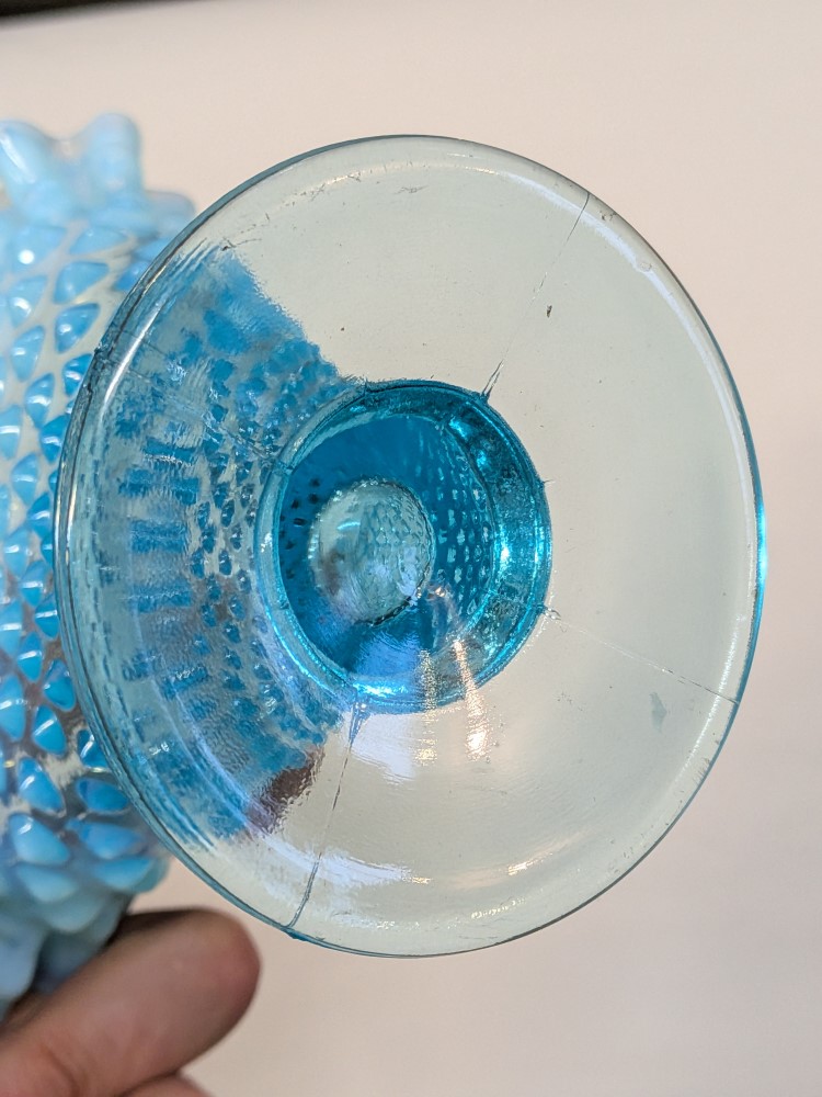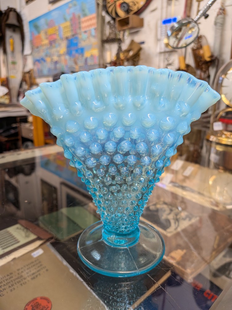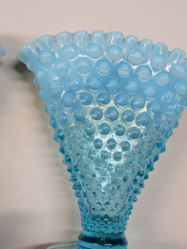 Vintage glass vase with classic Fenton hobnail pattern and translucent blue body that transitions into a milky white opalescent ruffled rim. Decorative distinct fan shape and footed base. Please refer to the photos for condition.