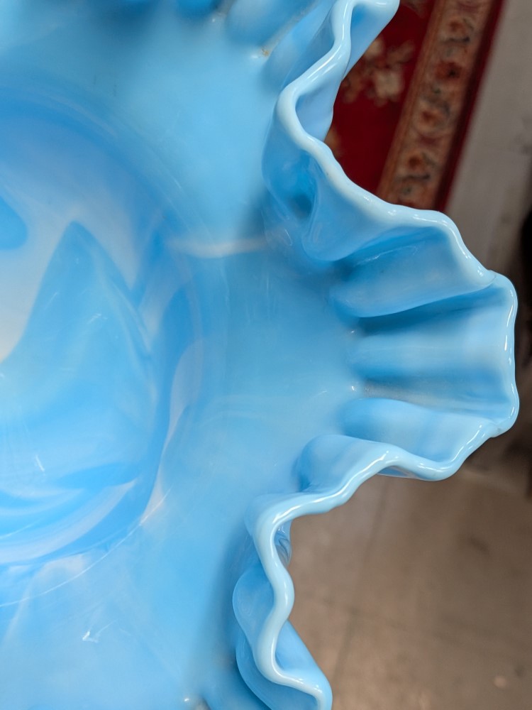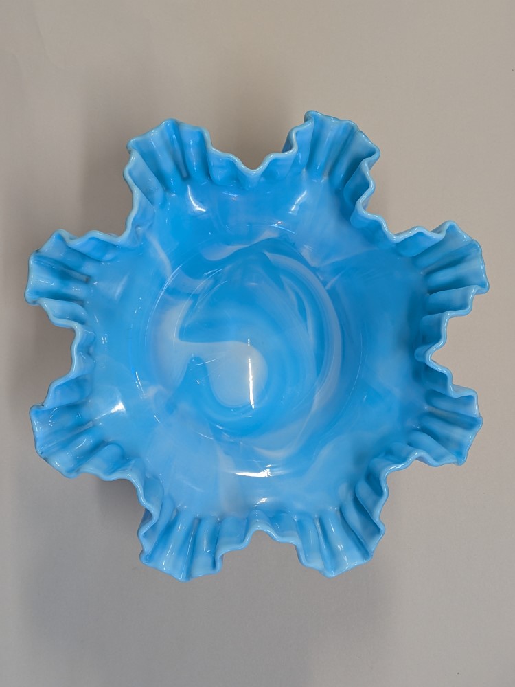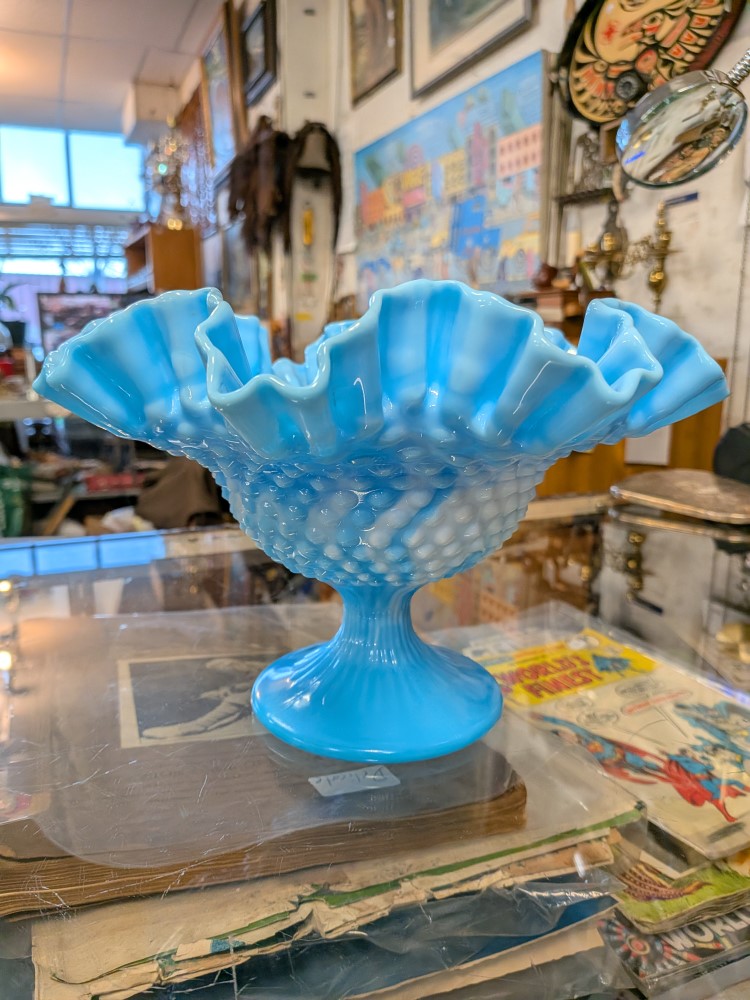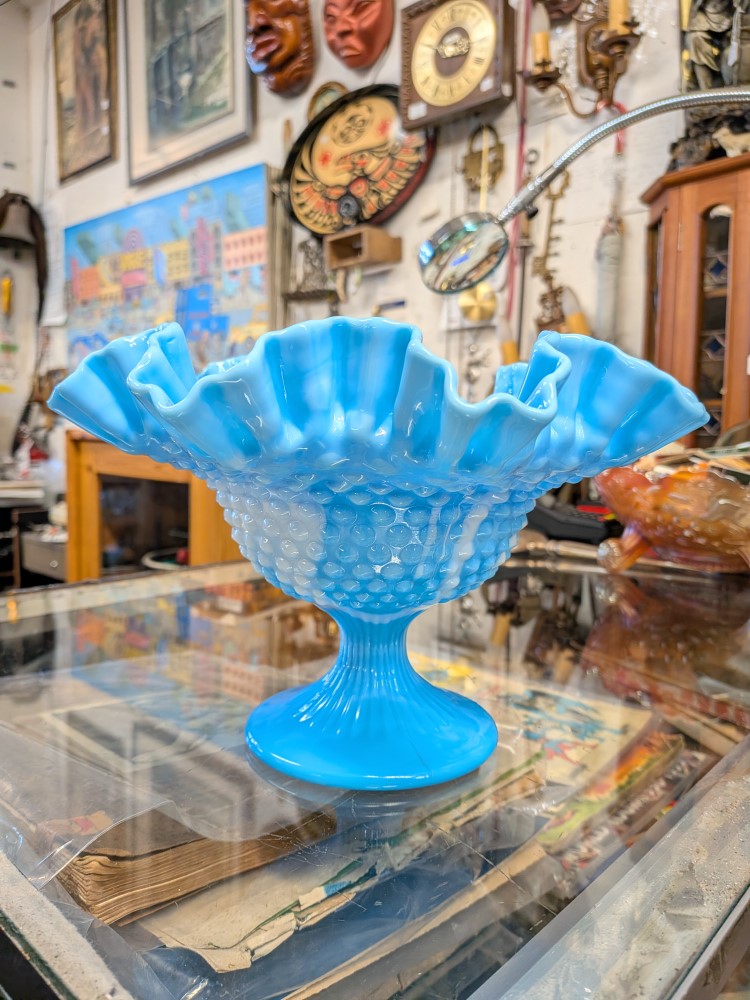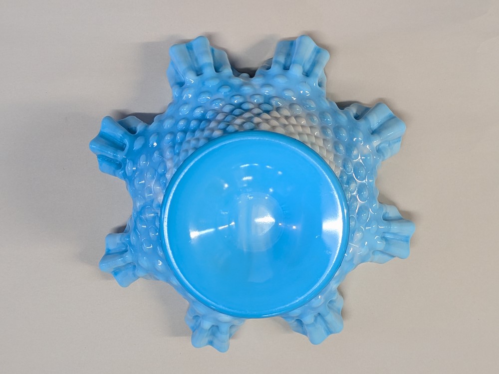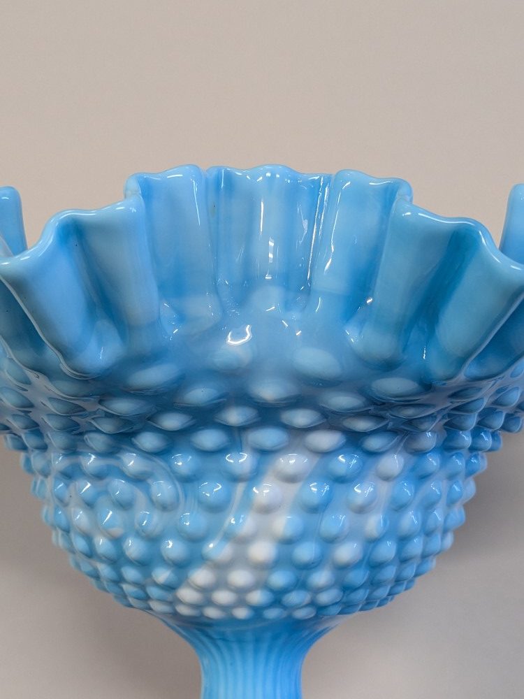 Fenton glass bowl with a vibrant sky blue color mixed with milky white slag swirls and the classic textured hobnail pattern. Footed compote pedestal bowl, finished with a double crimped ruffled edge.