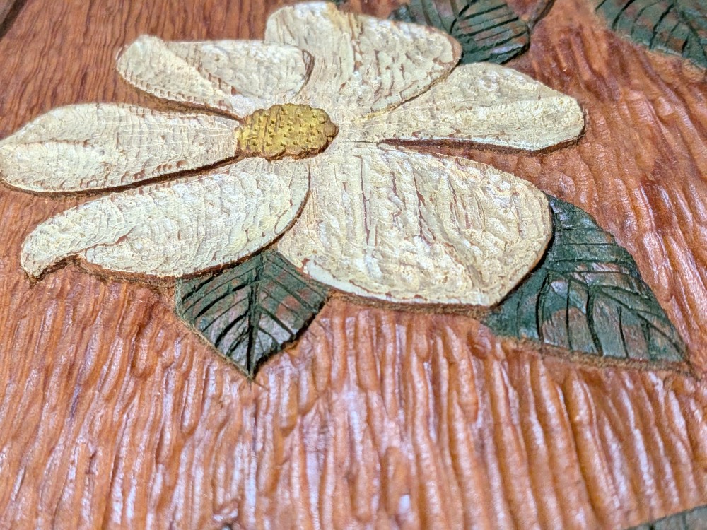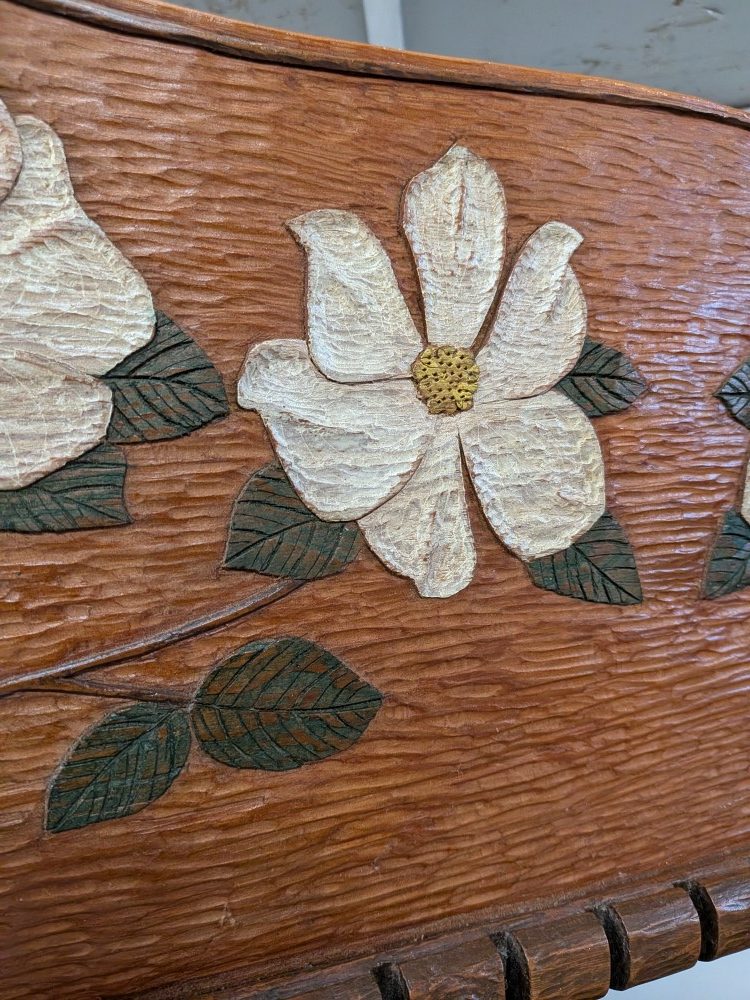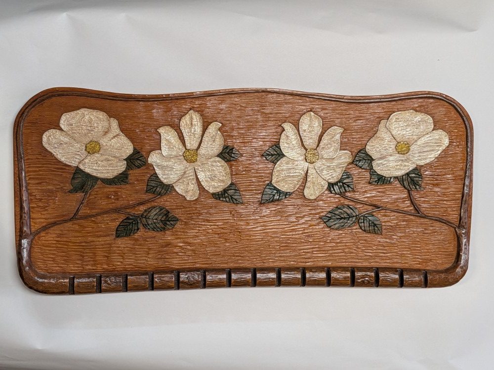 Vintage hand carved spoon rack with a detailed Dogwood blossom motif, a beautiful textured background and 15 notched slots.