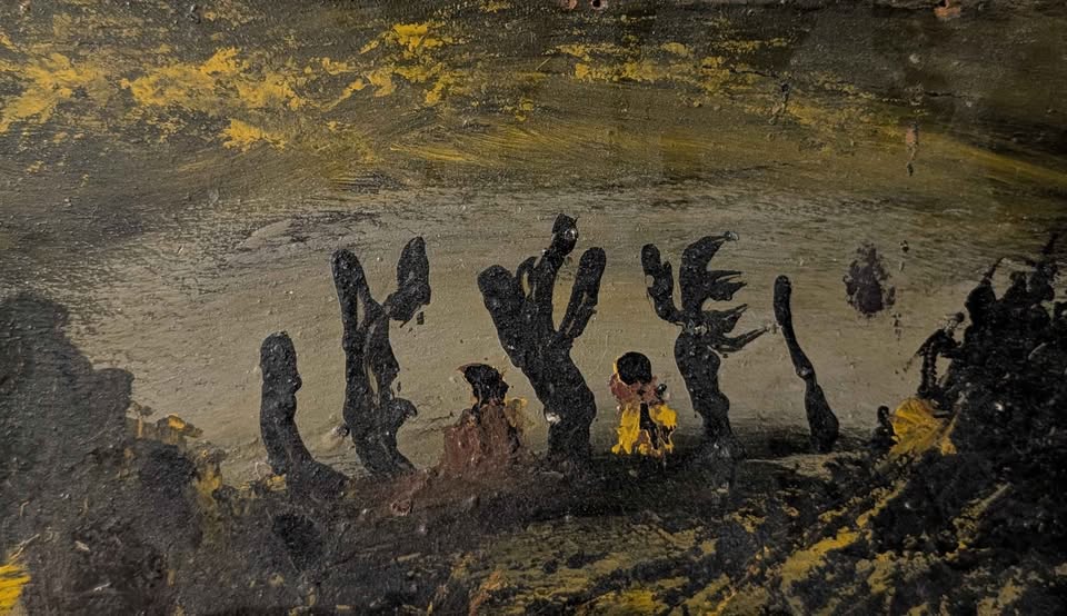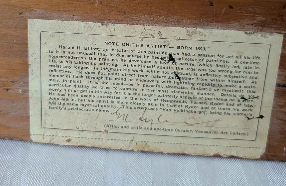 Photos of H H.E. come from a local Private Collection. Painting comes from the estate of Nona Franks. Harold Herbert Elliott (1890 – 1968) was a Canadian Artist. After having a heart attack in his Fifties, and being told by his Doctor he needed to change his lifestyle, this semi- successful Businessman, who ran a Pickle and Relish Factory on Victoria Drive, started dressing like Rembrandt and Emily Carr… calling himself The Gypsy, and “Painting against Time.” He bragged he painted over 5000 paintings before he died. One Critic stated perhaps Harold only did 5 paintings in his lifetime, but he executed each one over 1000 times. This is one of those paintings. One of the common themes from a Master who lived as if life is a fairytale.