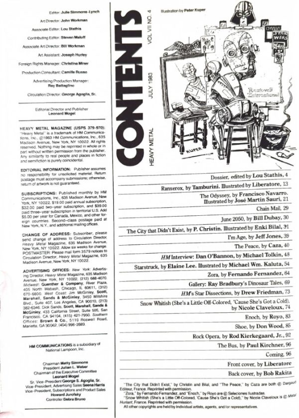 Interior works by legendary artists such as Lou Stathis, Liberatore, Francisco Navarro, Jose Martin Sauri, Bill Dubay, Enki Bilal, Jeff Jones, Drew Friedman, Royo, Don Wood and more…
