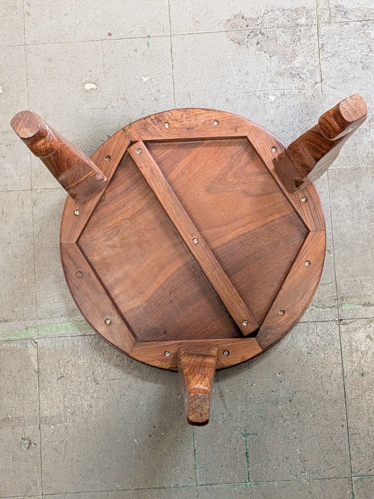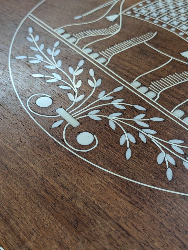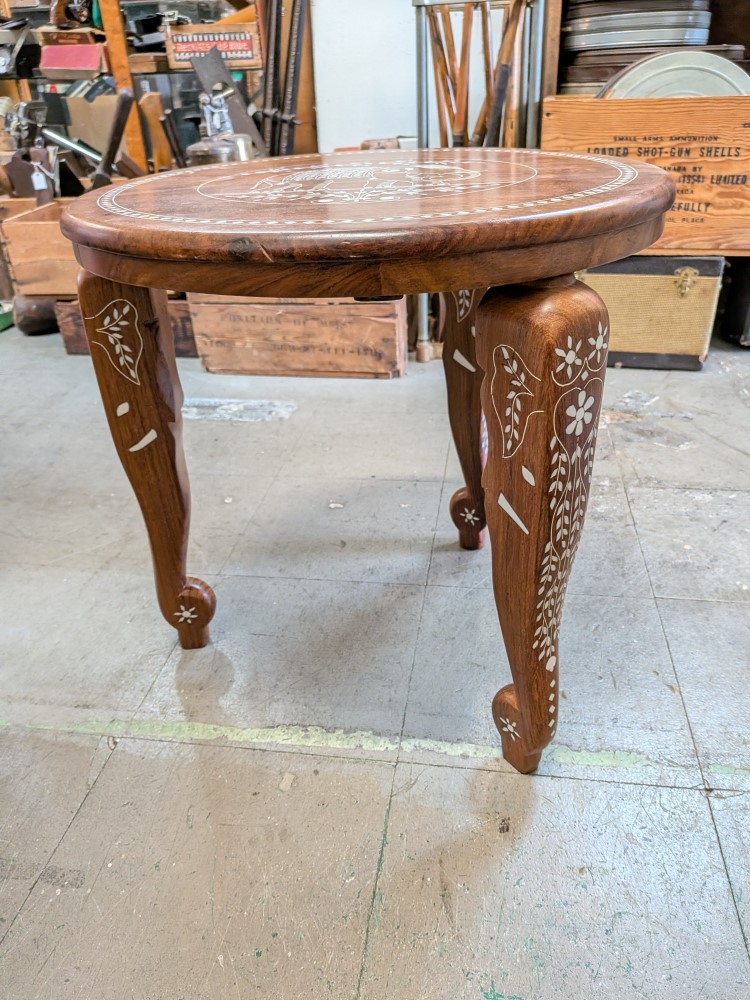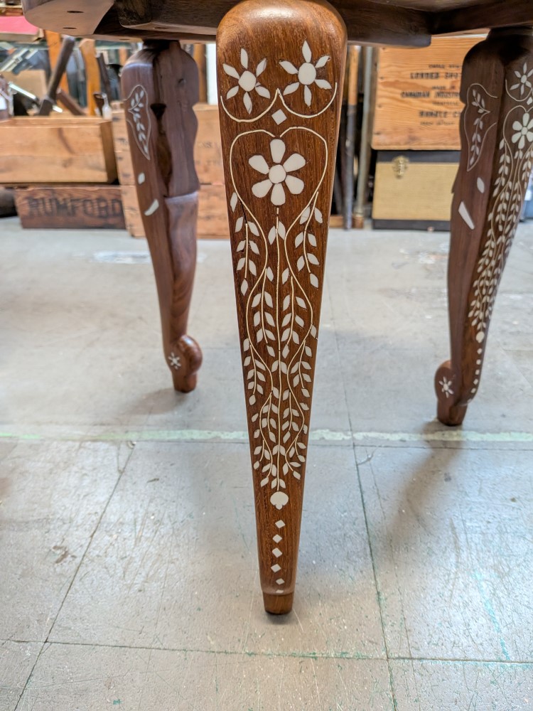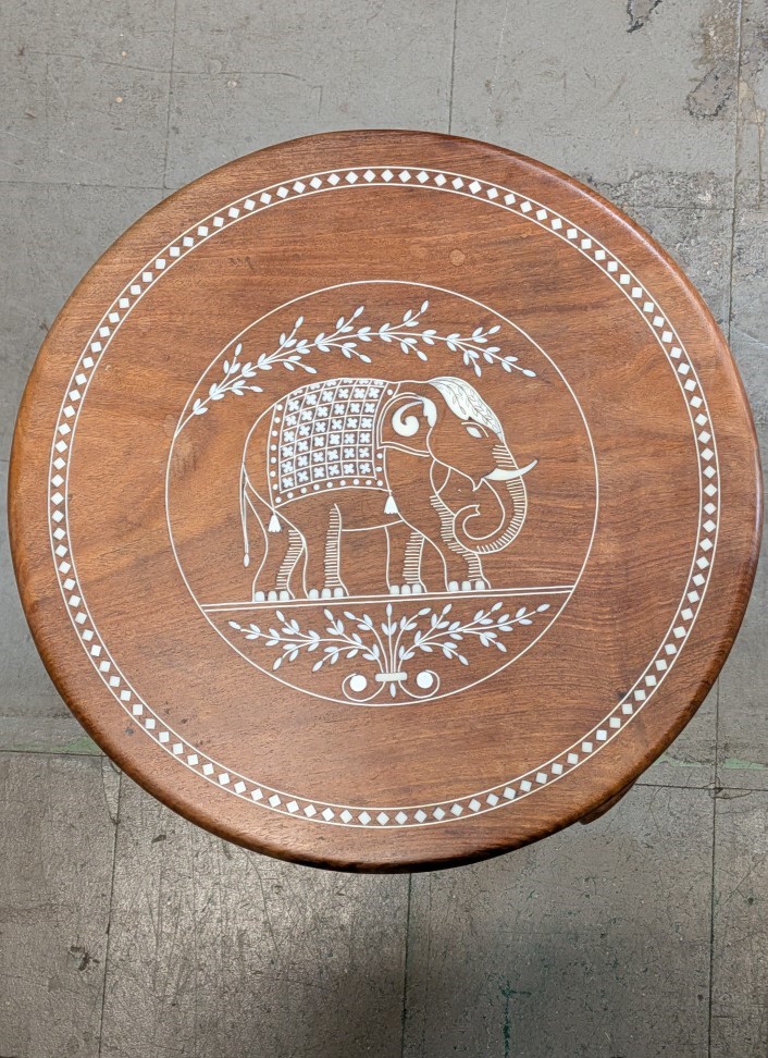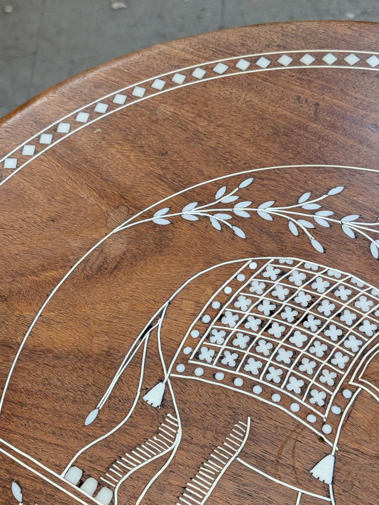 Hoshiarpur style accent table with hand inlaid ceremonial elephant motif surrounded by floral and geometric borders. Three screw in legs aswell with inlaid decorative design. Please refer to photos for condition.