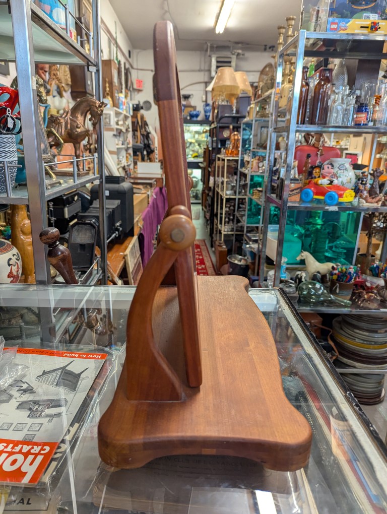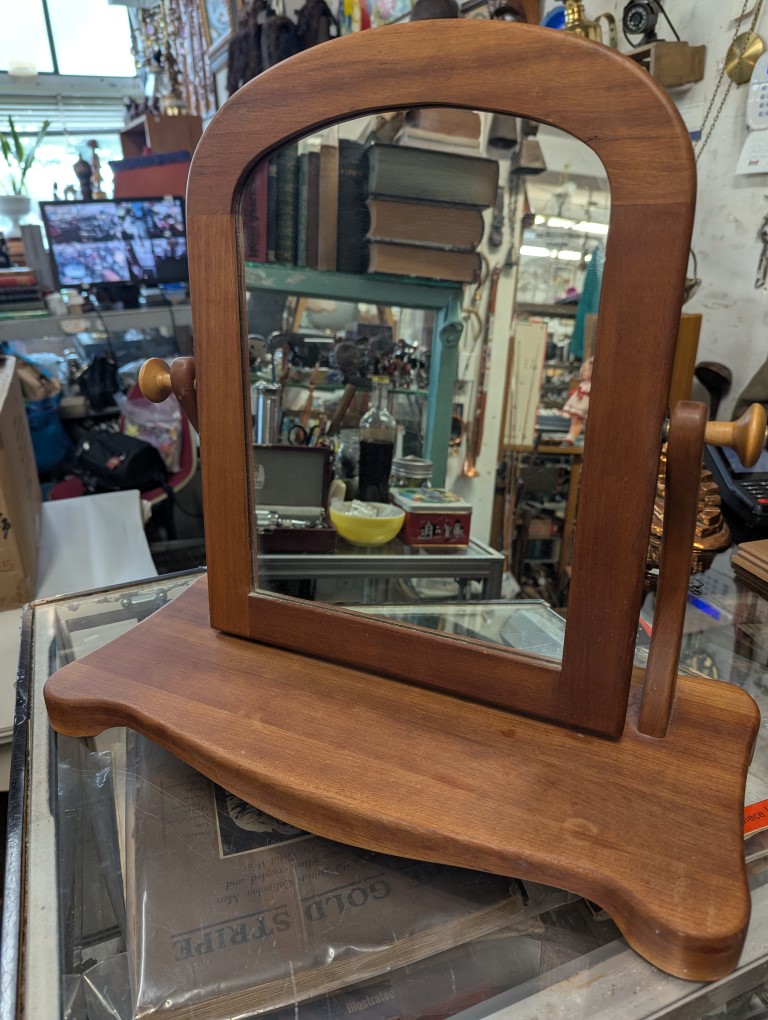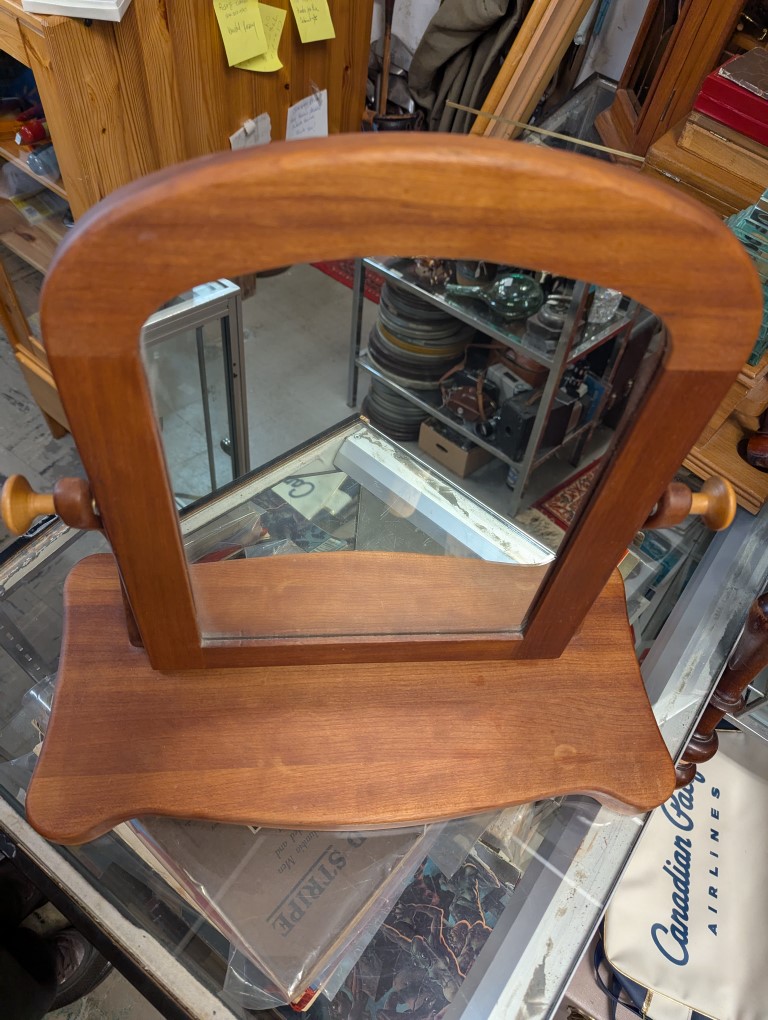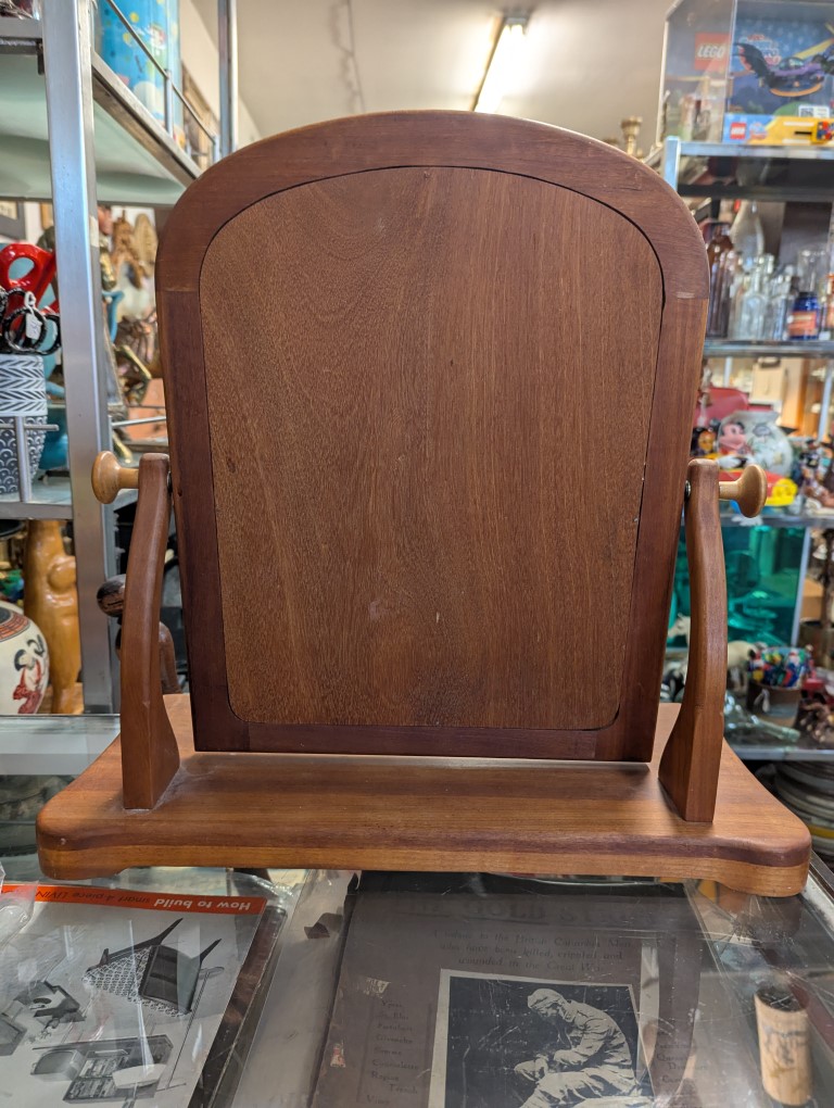Versatile mid century modern Danish teak vanity mirror with a clean, arched design and tilting frame. Please refer to photos for conditon.