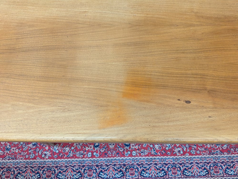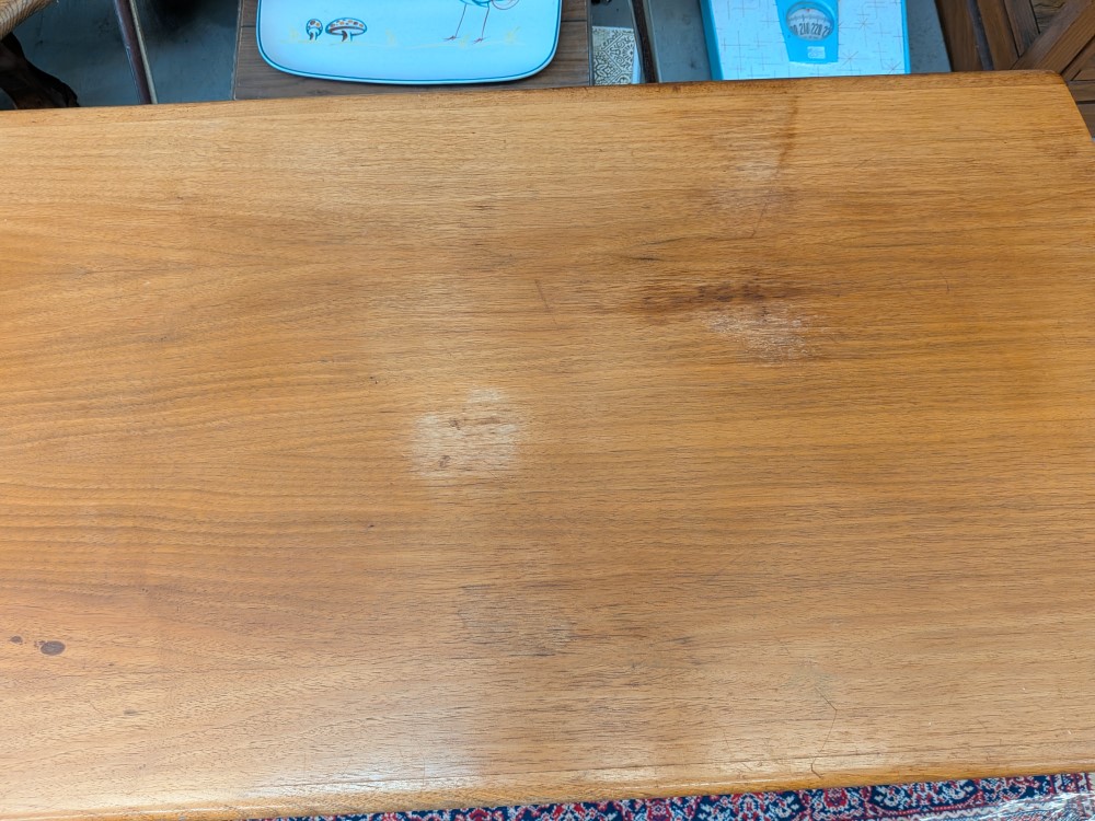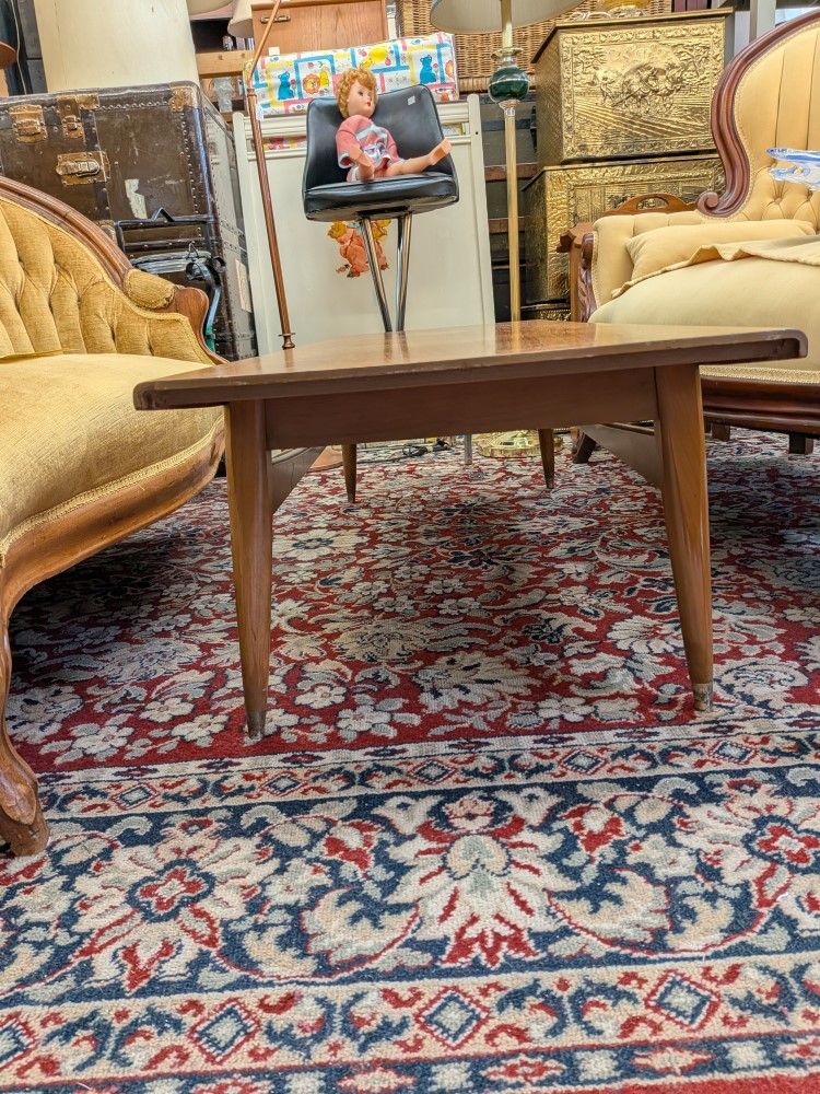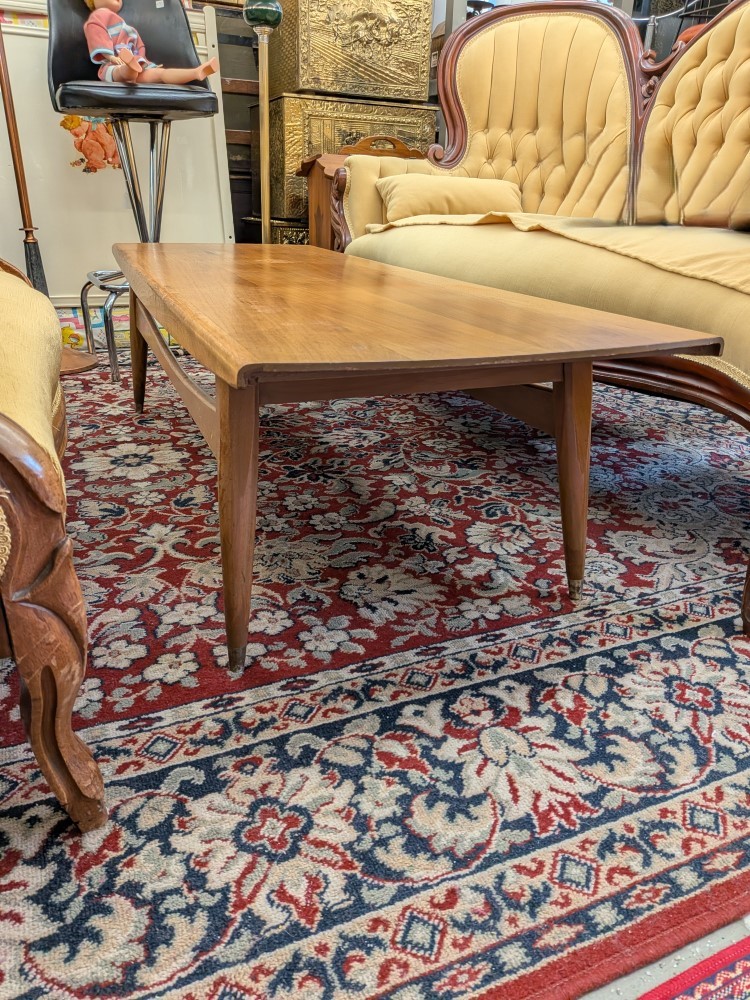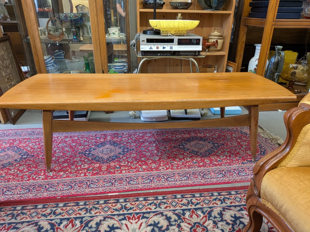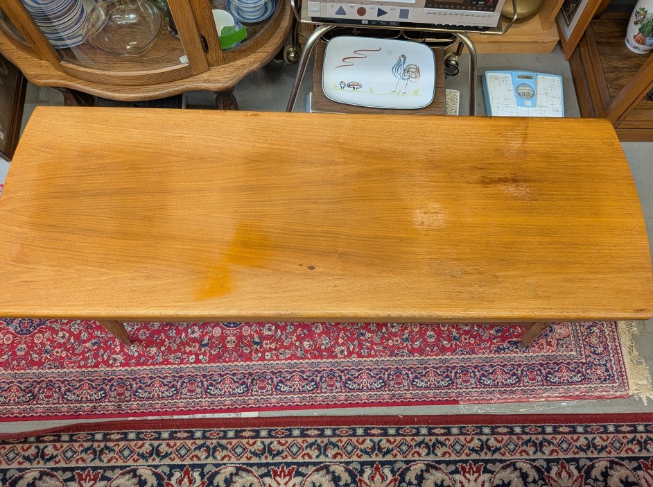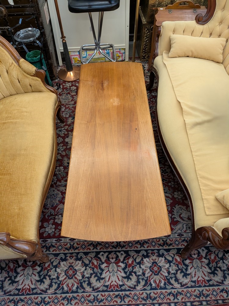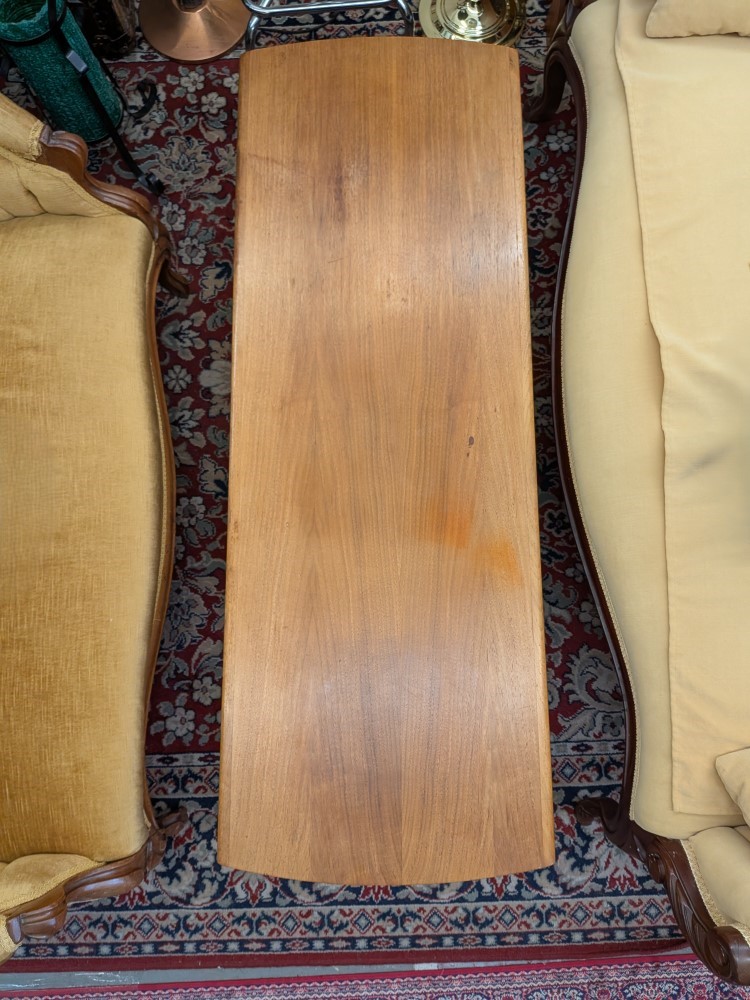 mid-century coffee table with a long rectangular top with rounded ends and straight side edges. Tapered legs and a unique arched support rail, 1960s minimalist styling. Please refer to photos for condition and note the condtion of the table top.