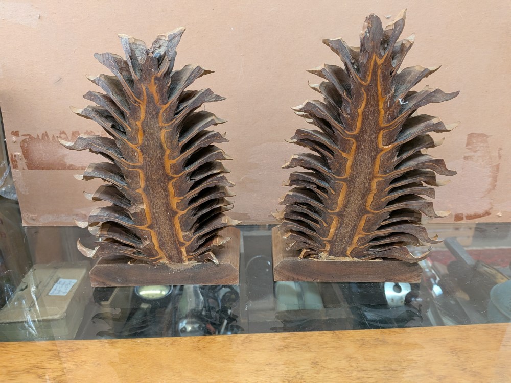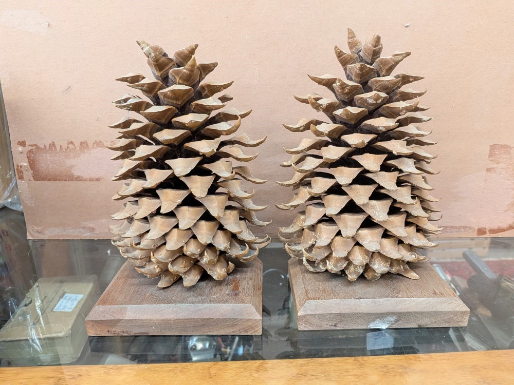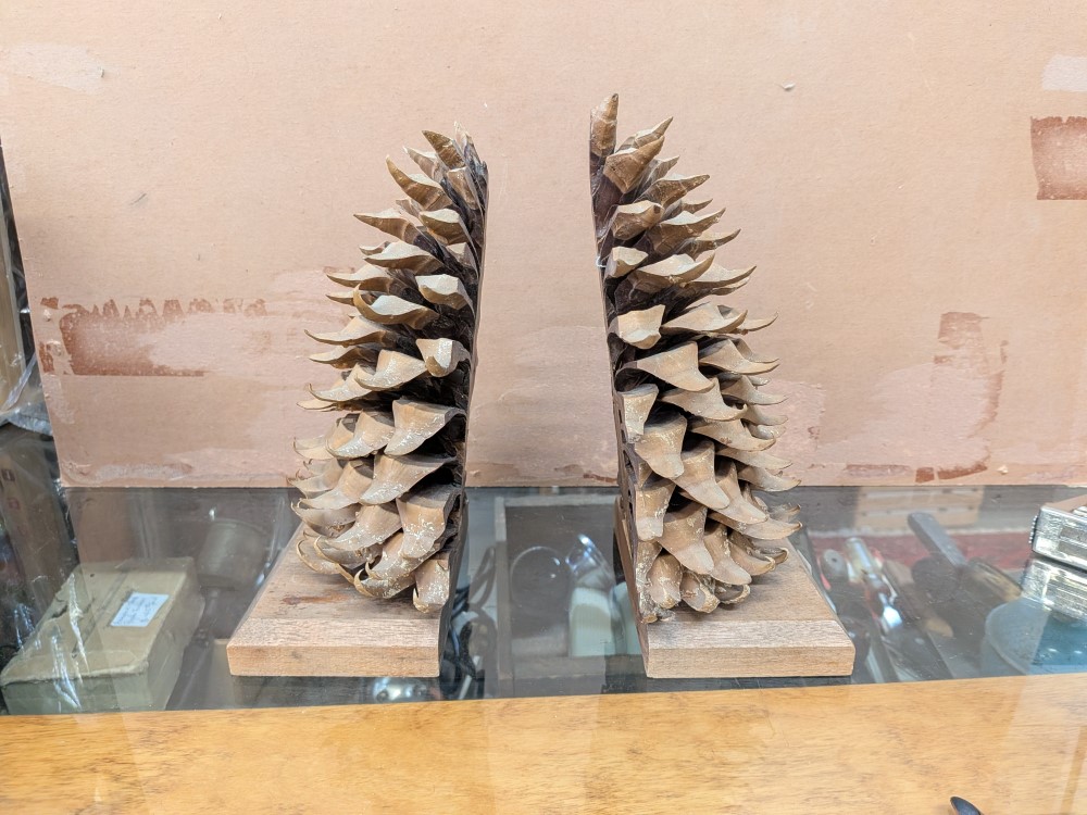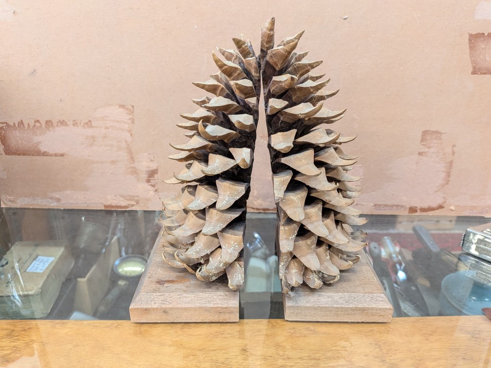 Unique pair of vintage bookends made of a real, large scale pine cone that has been bisected to reveal its intricate internal structure.