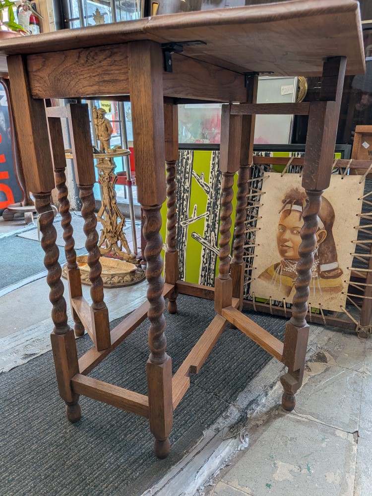 Solid oak drop leaf table with six barley twist legs and a versatile gateleg design that expands to increase table top surface space.