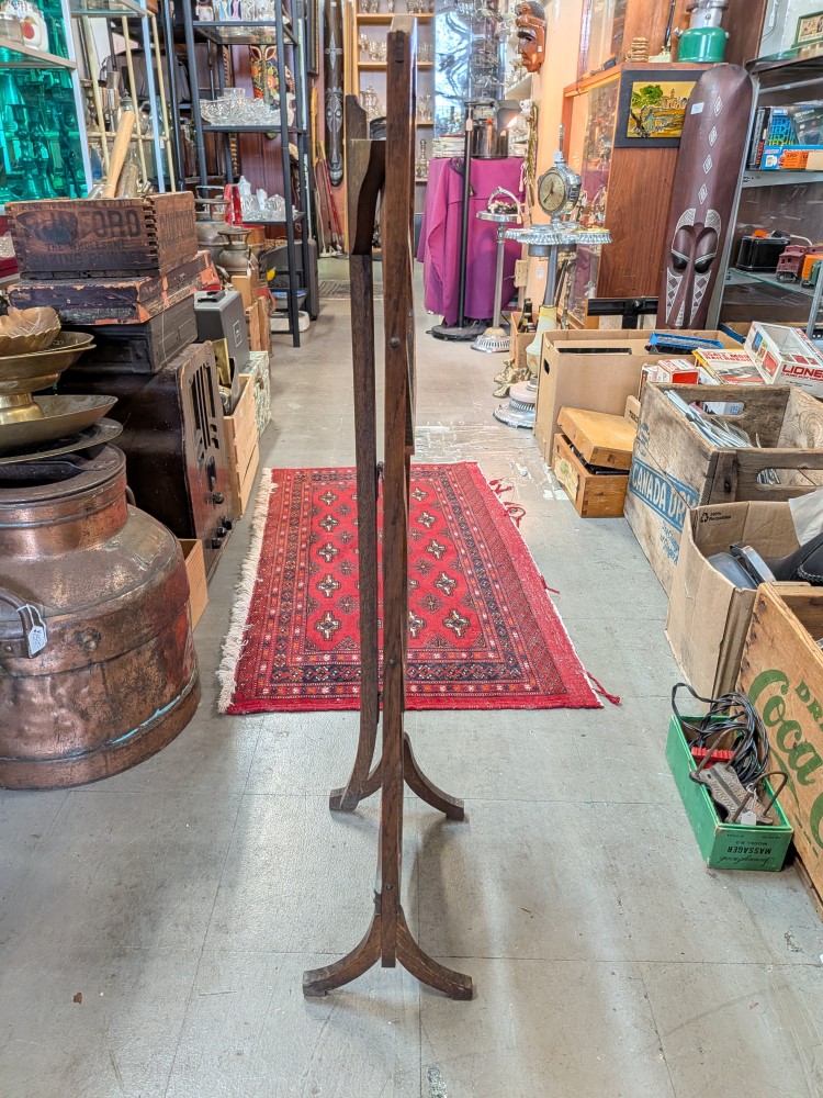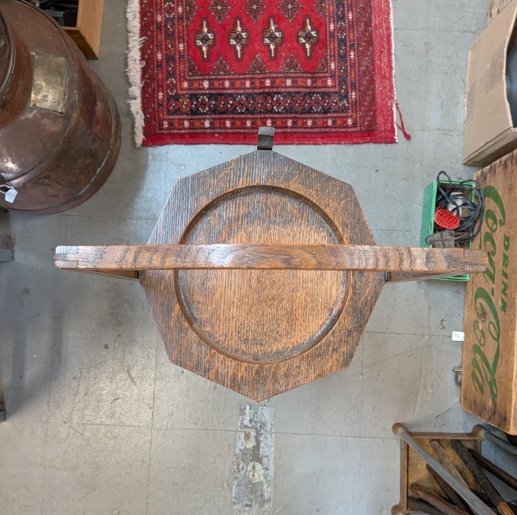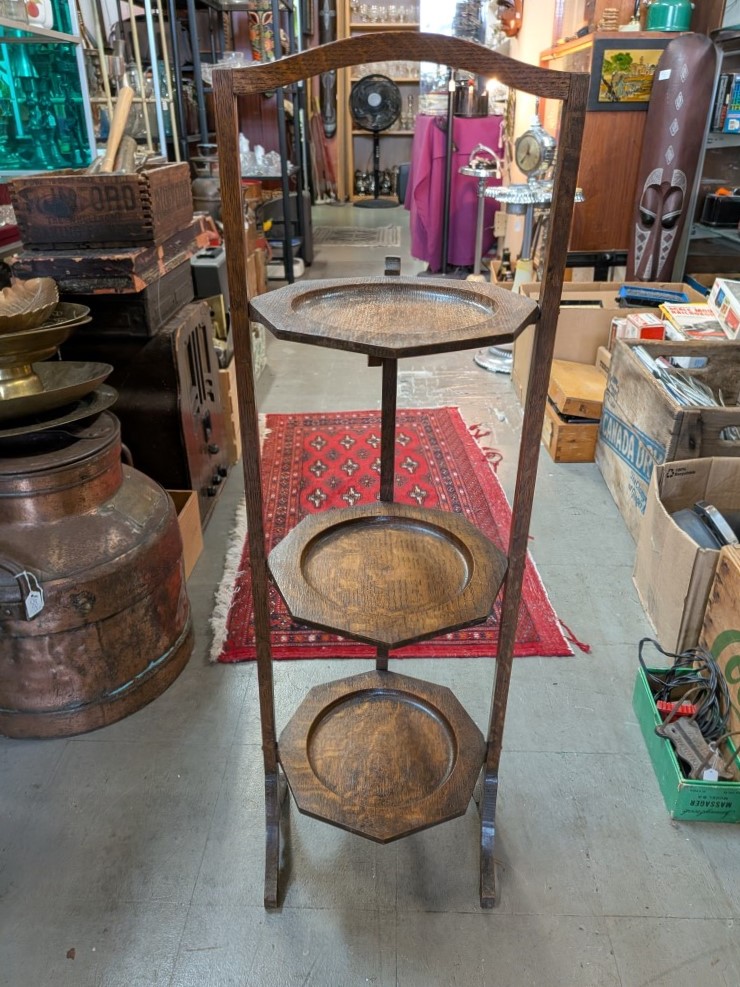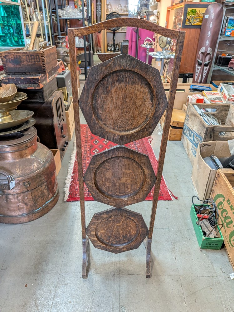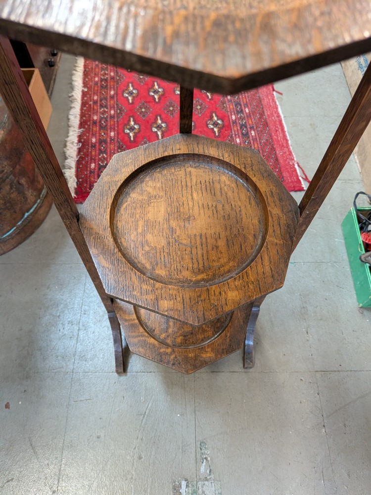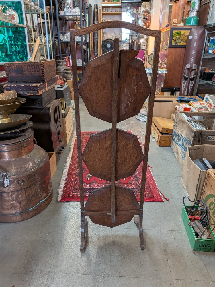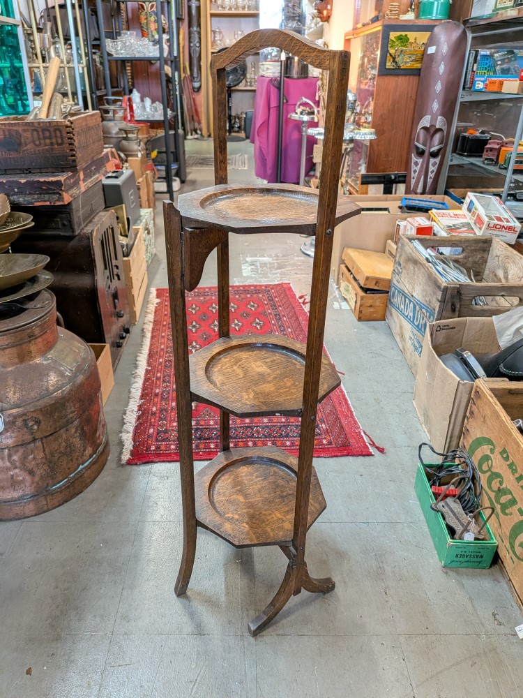solid oak folding stand with three octagonal tiers and a curved carry handle. The shelves are hinged to fold flat for storage, and the wood displays a prominent quarter-sawn grain characteristic of early 20th-century craftsmanship. Great shape and condition.