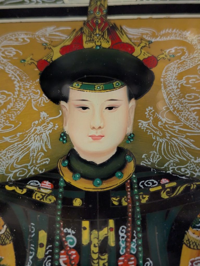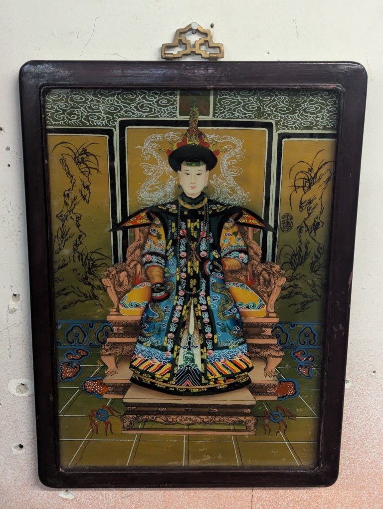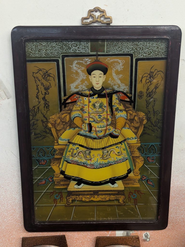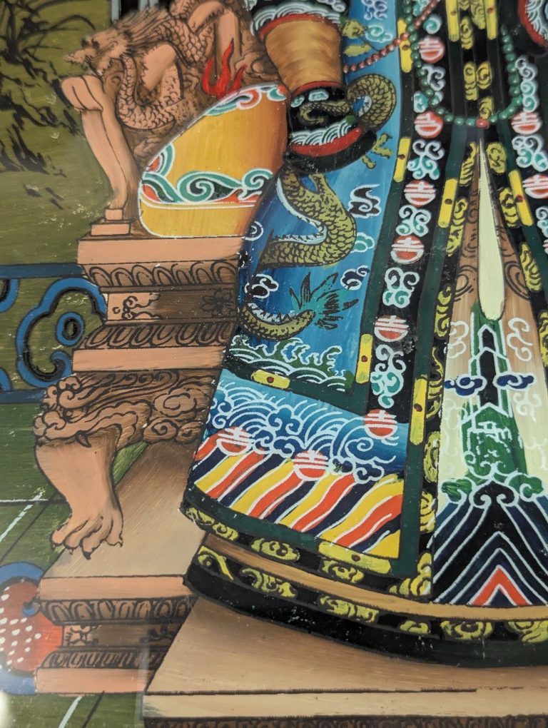 Lovely pair of reverse glass framed ancestor portrait paintings of Chinese Emperor and Empress like figures dressed in elaborate and colorful robes.