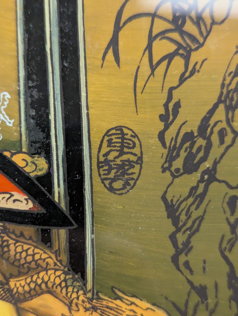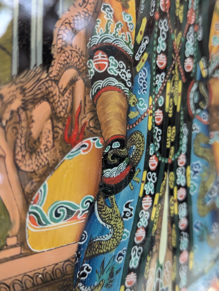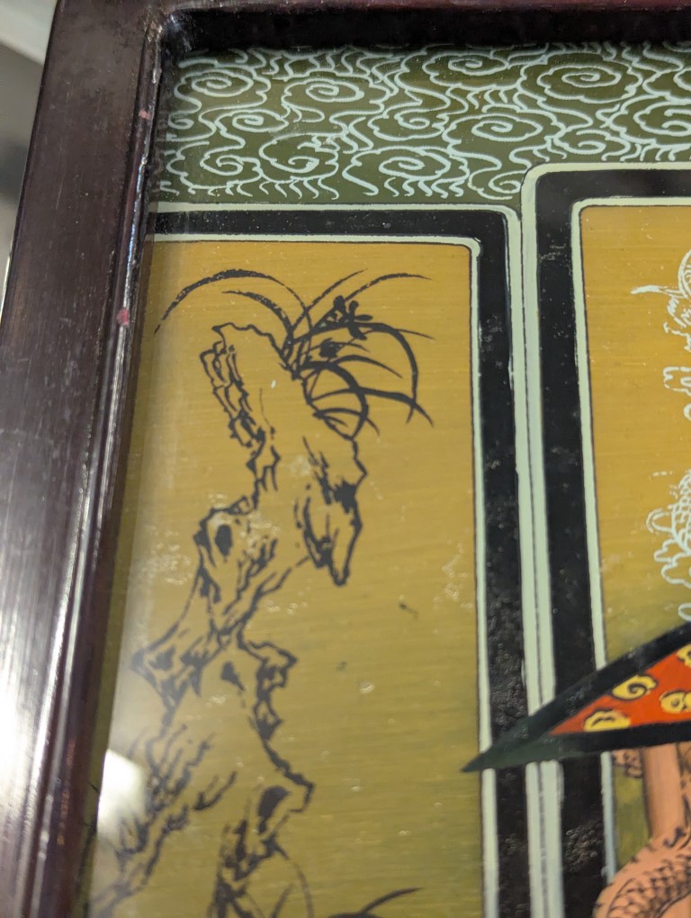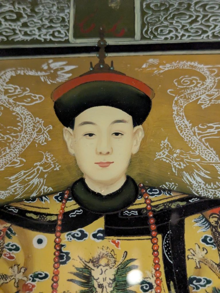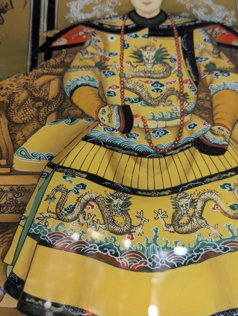 Lovely pair of reverse glass framed ancestor portrait paintings of Chinese Emperor and Empress like figures dressed in elaborate and colorful robes.