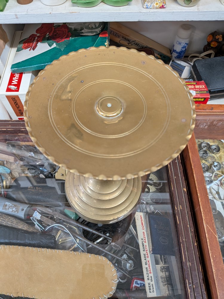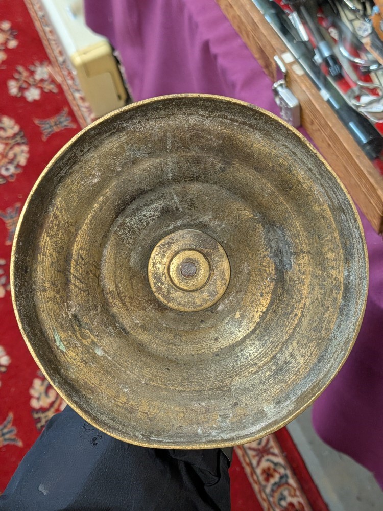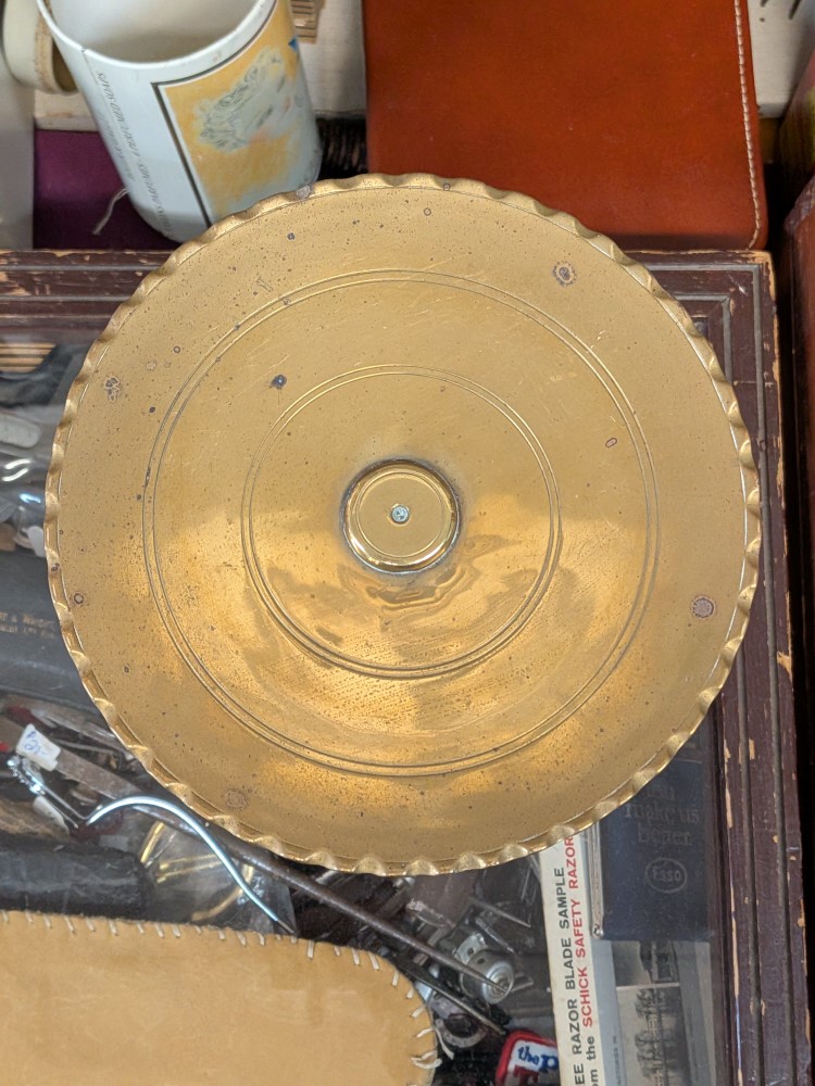 Mid-century brass dish with a deep pedestal base and a wide, smooth rimmed top with a soft vintage patina.