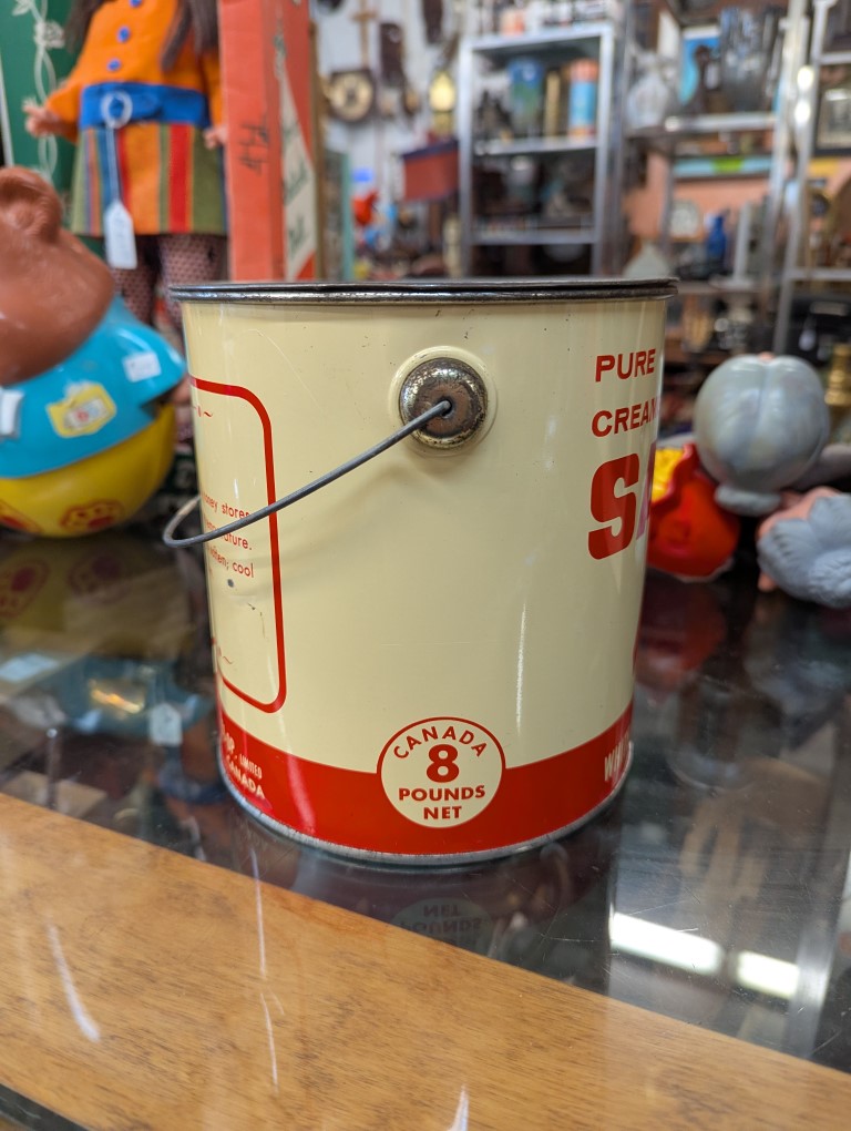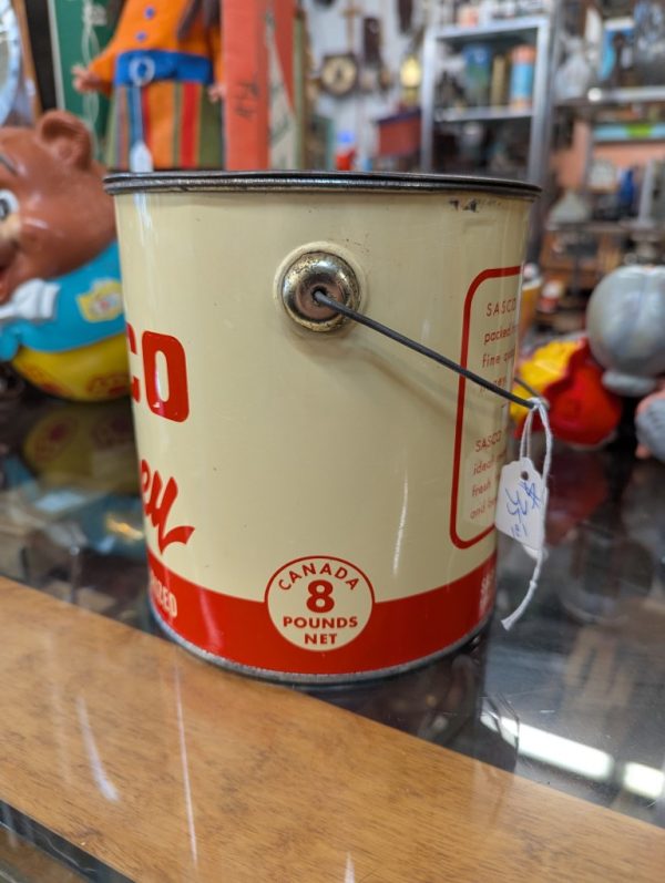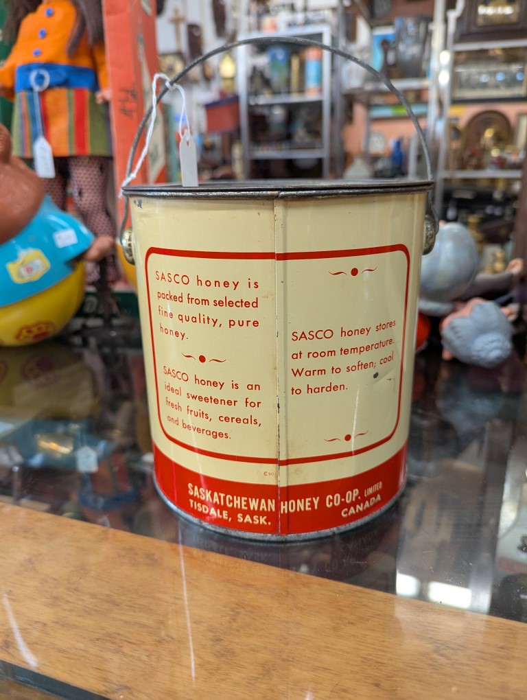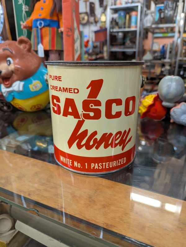 Vintage Sasco Pure Creamed Honey Tin Saskatchewan Canada 8lb Empty red and white in colour