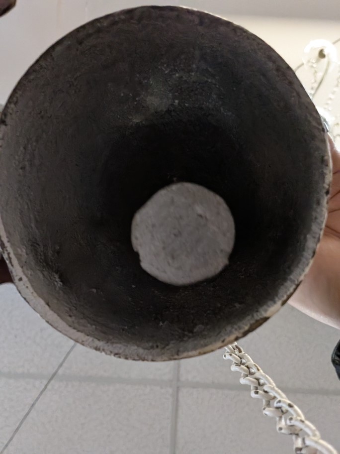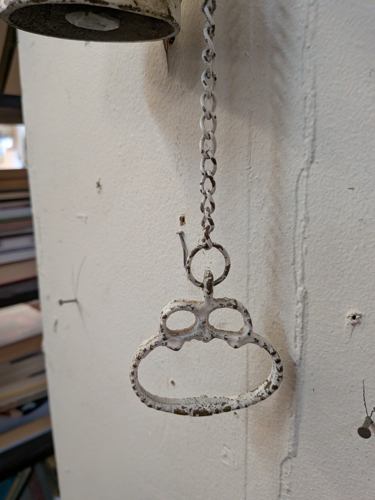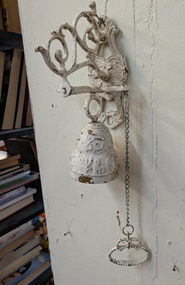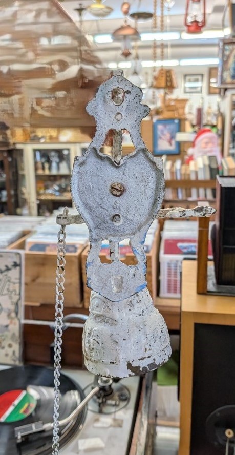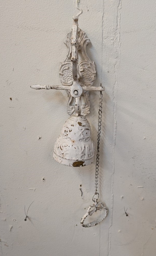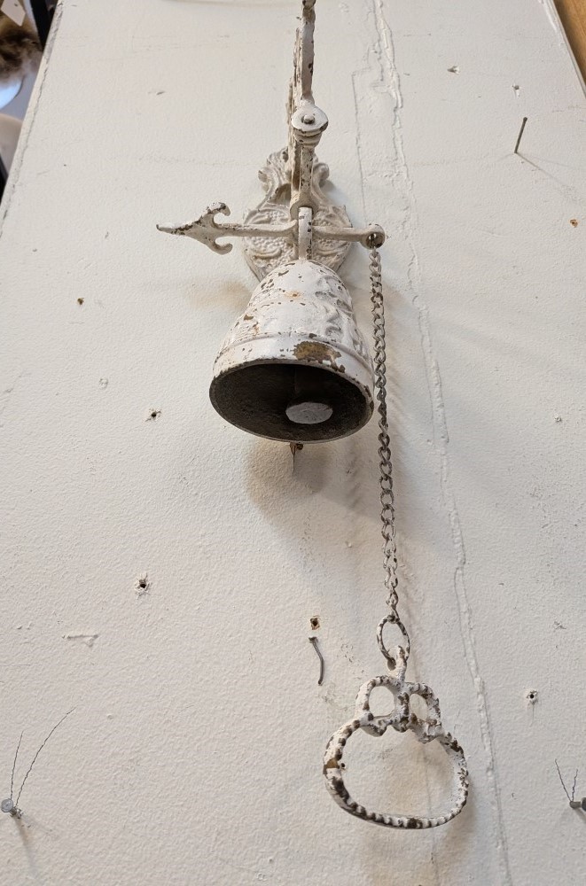 Decorative dinner bell with a detailed scrollwork bracket and a matching bell with an original pull chain.