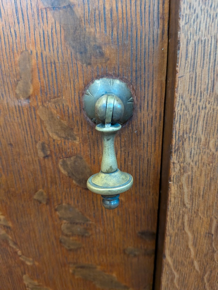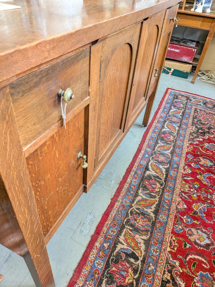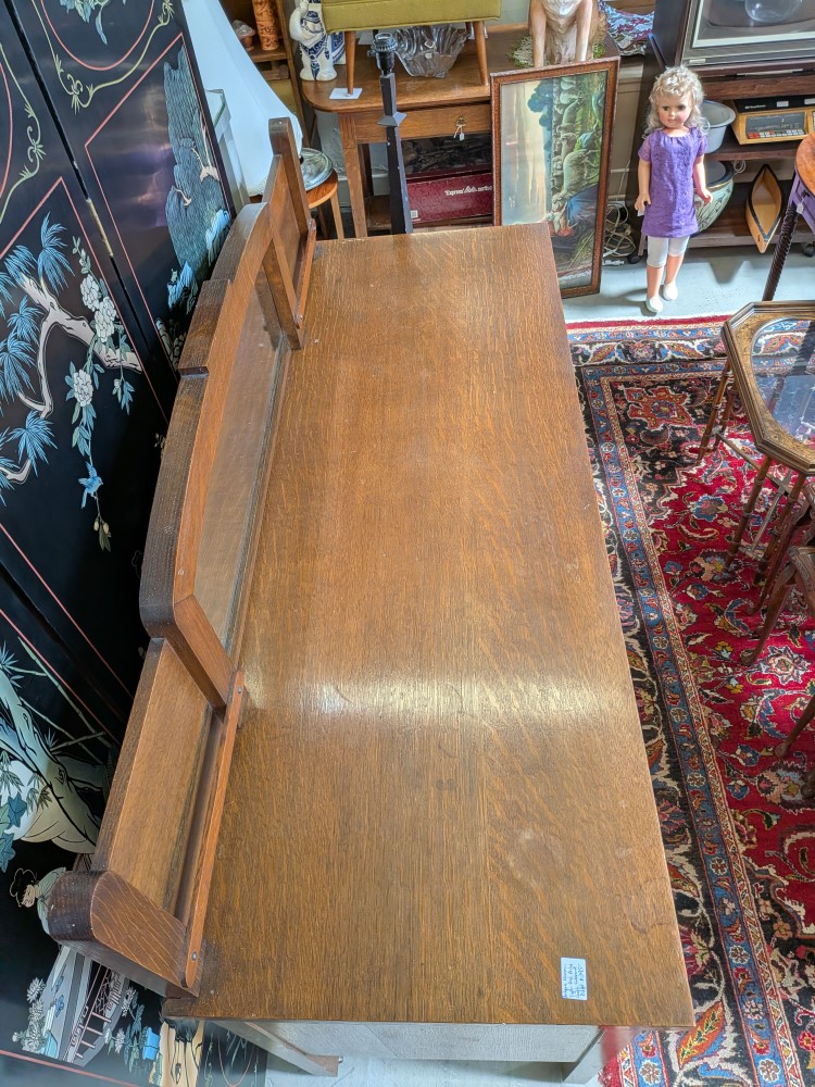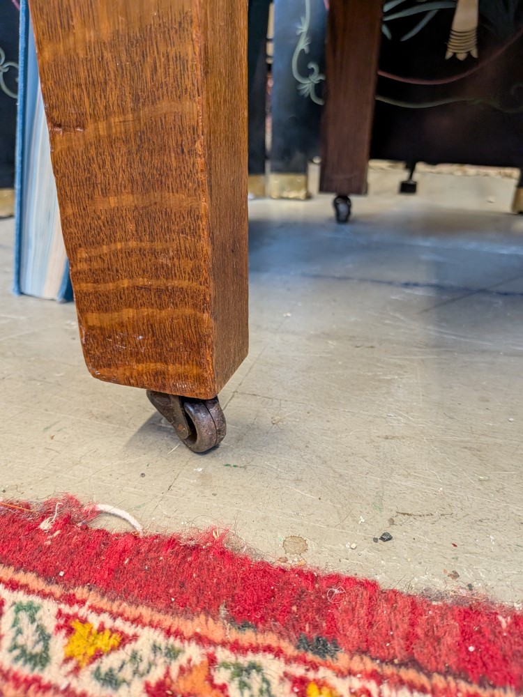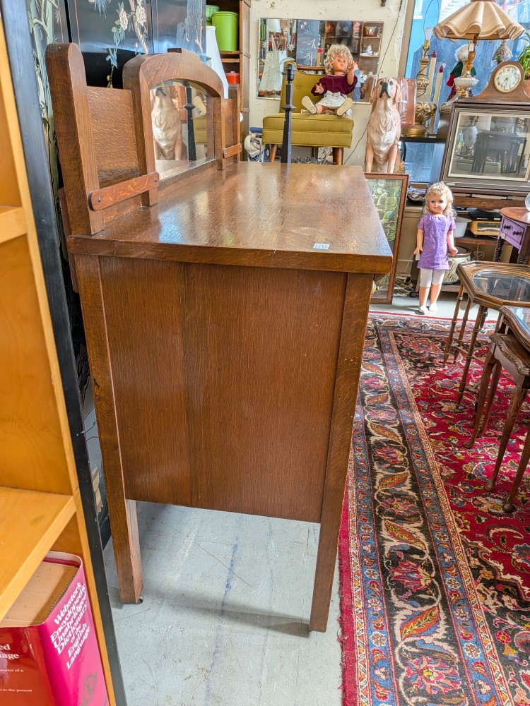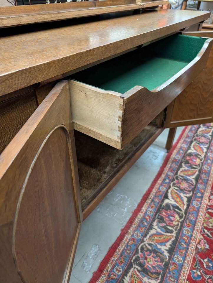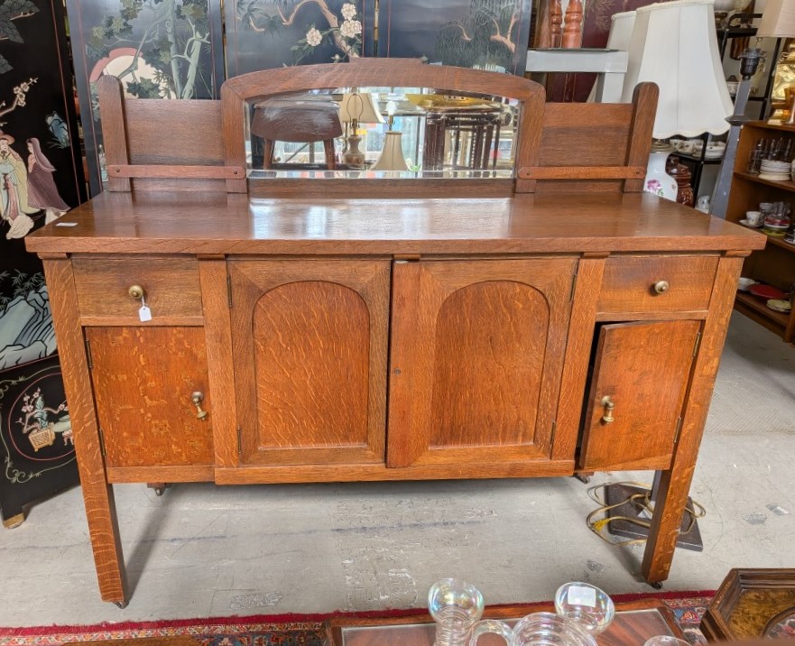 early 20th-century oak sideboard with mirrored backsplash and removable top serving tray. The base has articulated brass drop pulls and sits on functional metal castors for easy movement.