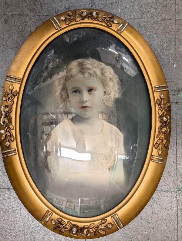 Antique Victorian-era framed portrait. This piece features an oval frame with original curved bubble glass. The frame is finished in gold gilt and includes ornate floral and scrollwork detailing. Inside the frame is an original monochrome portrait of a young child. The overall design is consistent with the Victorian period, dating to the late 19th or early 20th century.