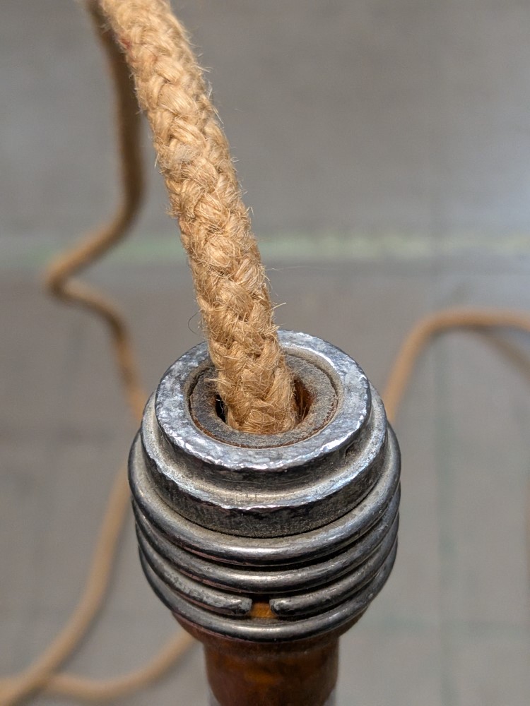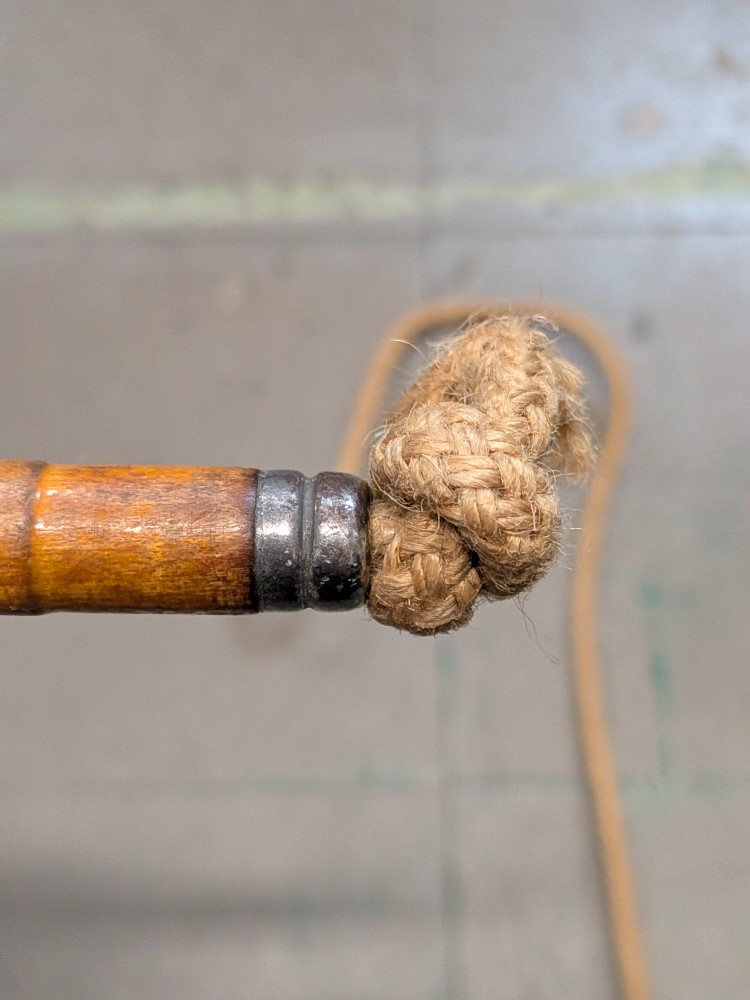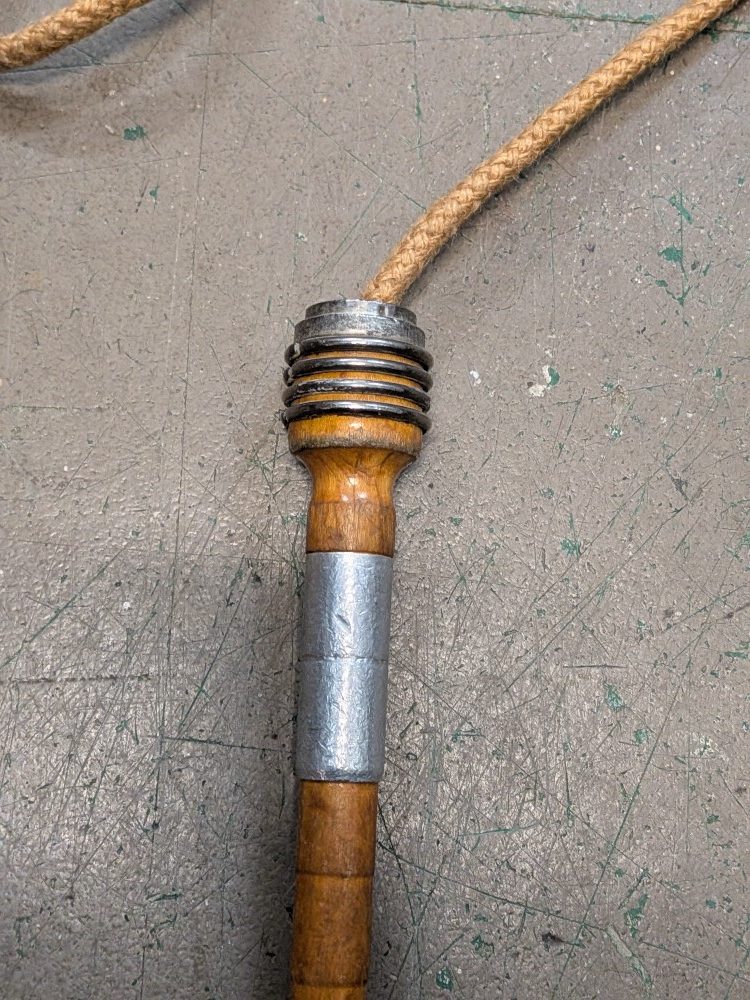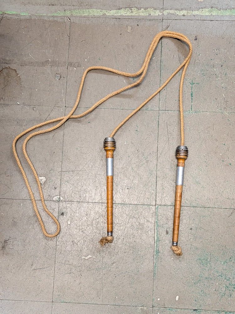Mid century training jump rope with primitive wooden handles and original metal ferrules.