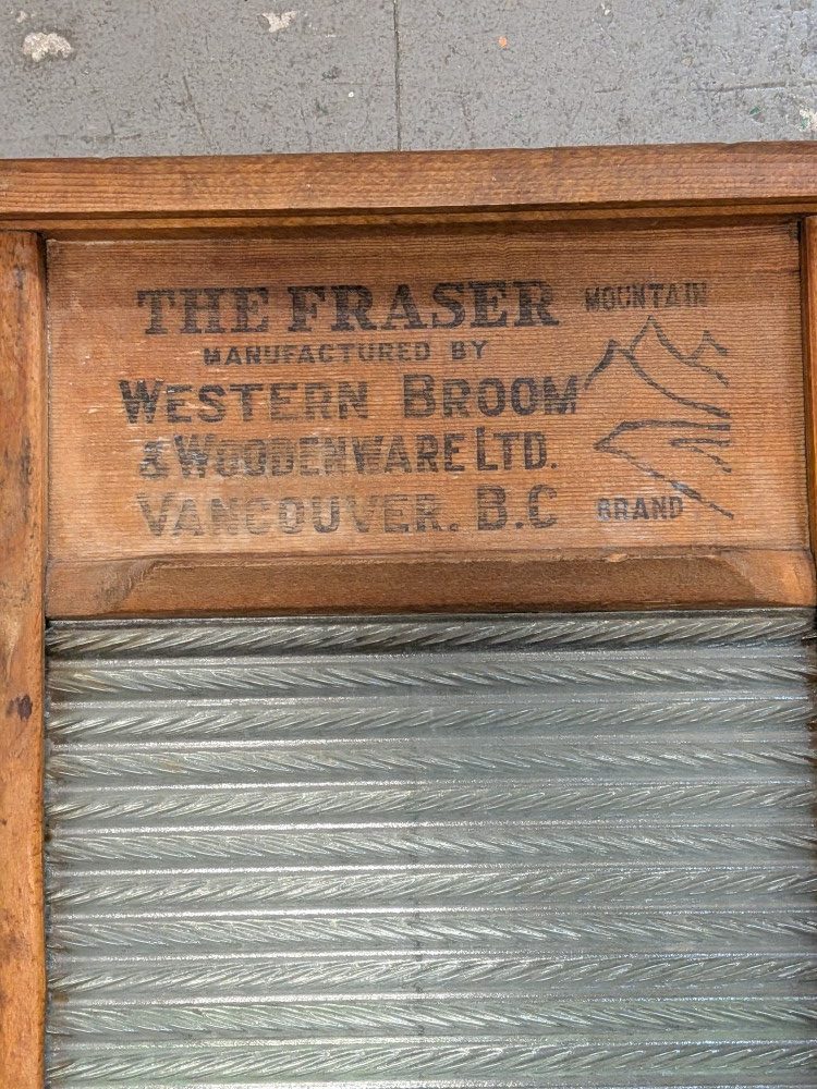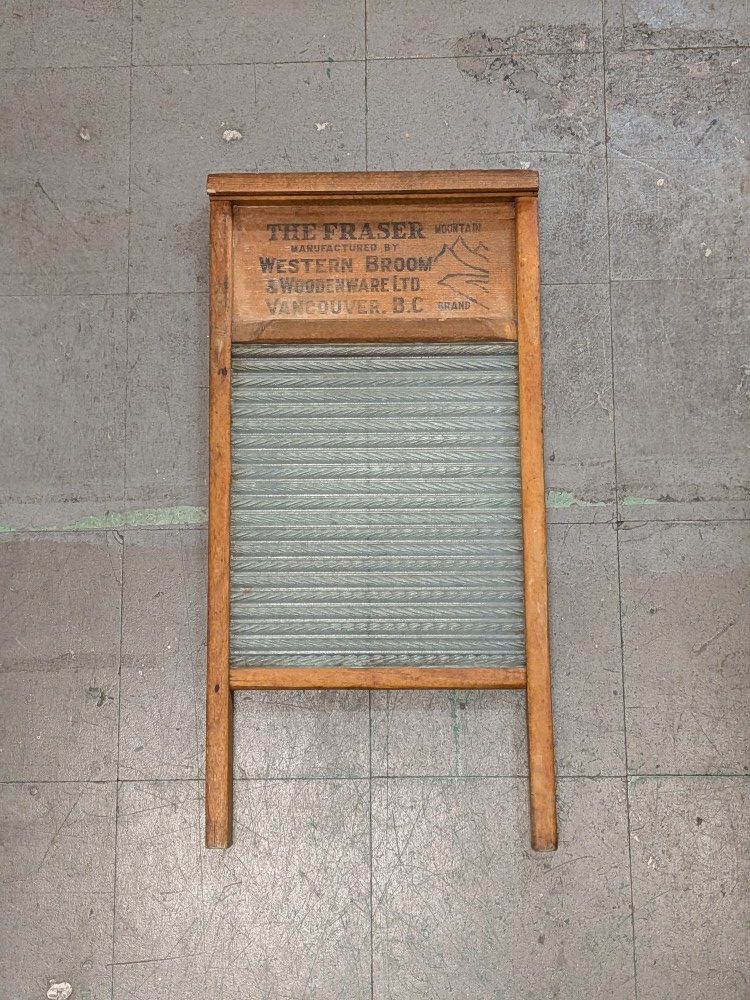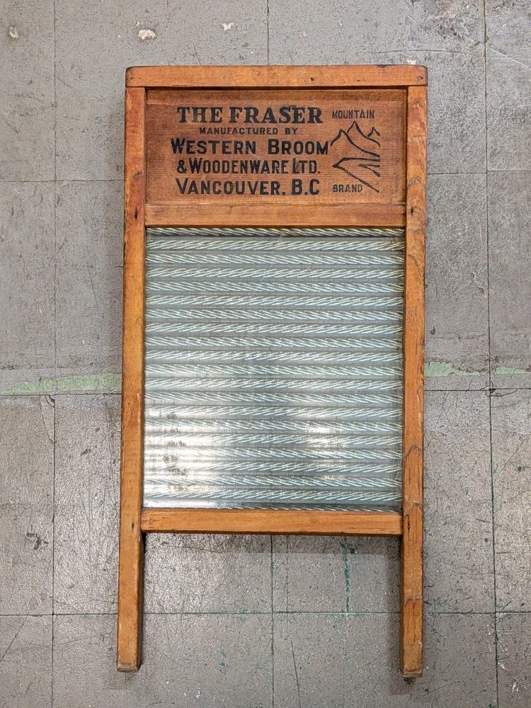 Cool vintage washboard. This Fraser Mountain brand washboard was manufactured by Western Broom & Woodenware Ltd. in Vancouver, B.C. Great piece for laundry room decor or just to add some rustic charm. Has that classic old school look.