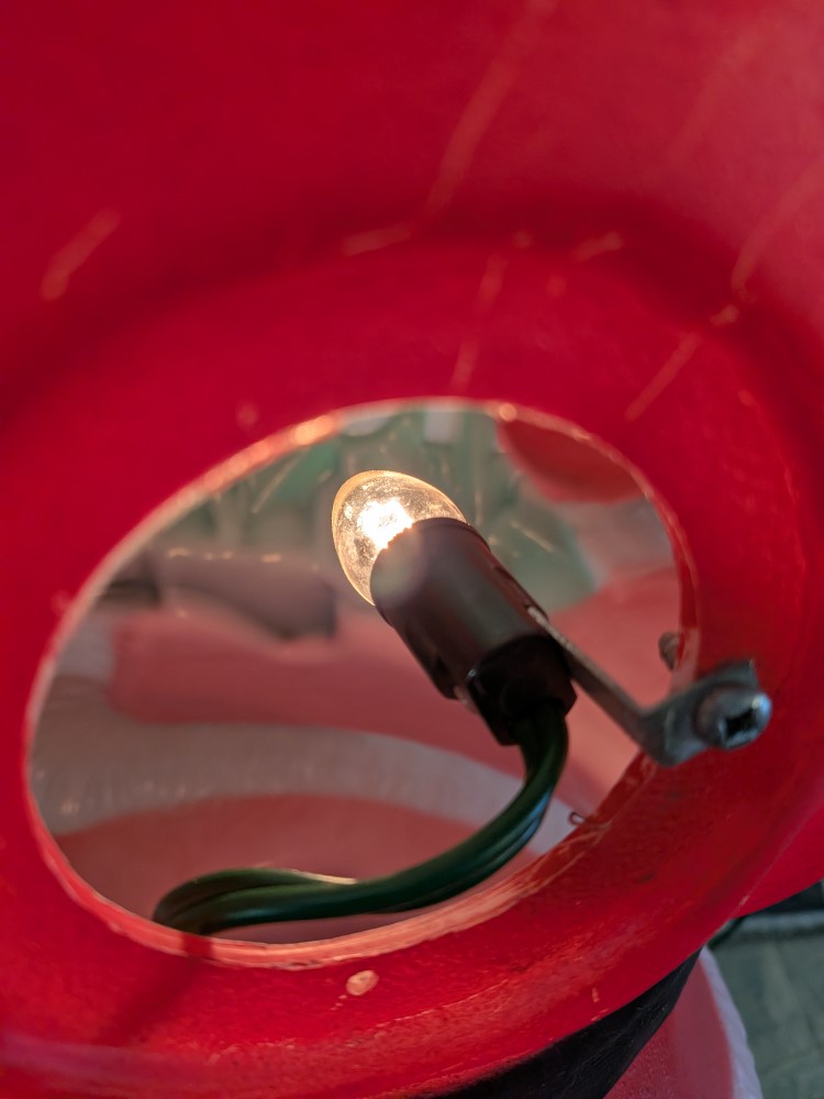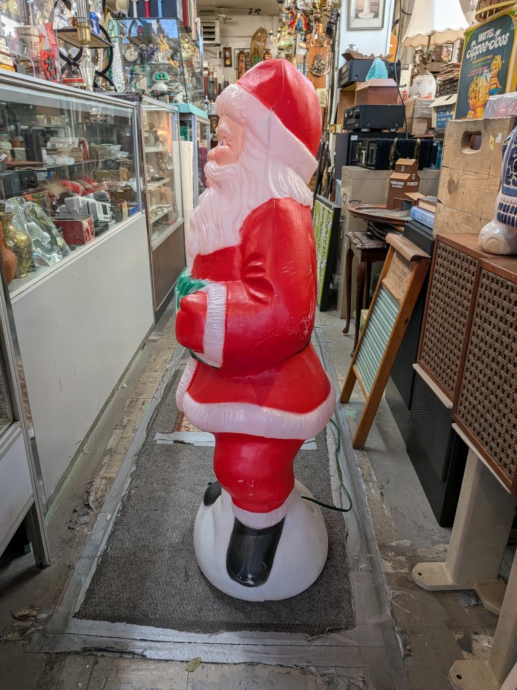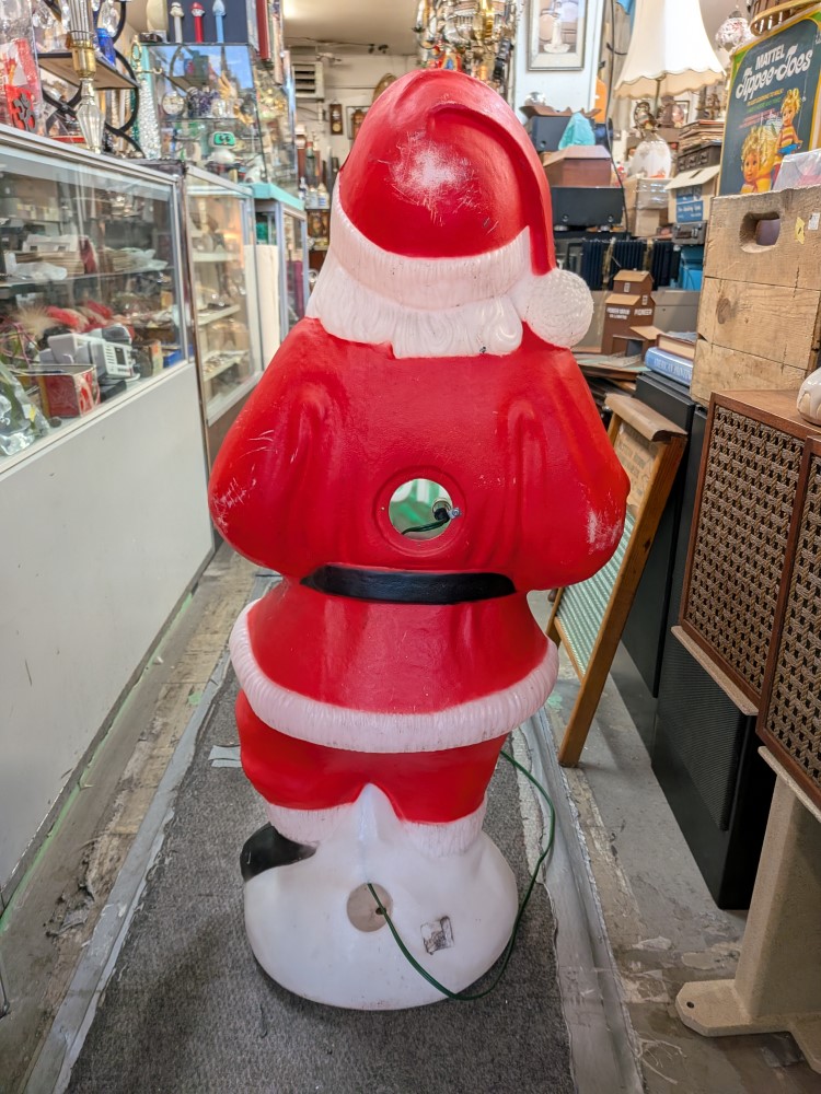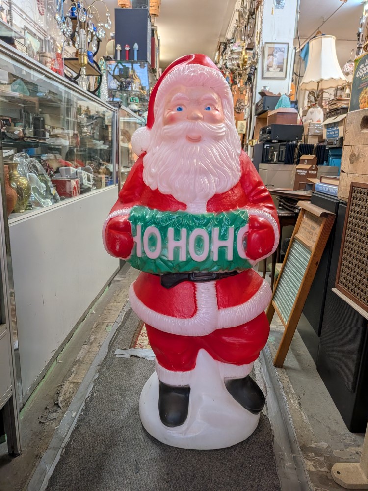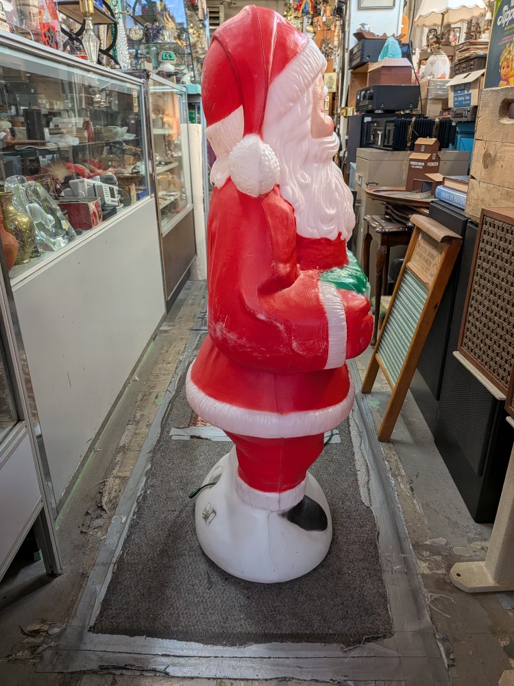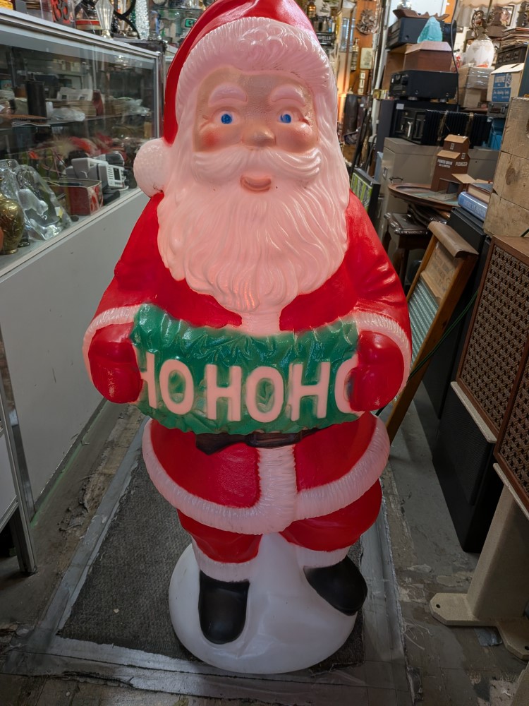 Vintage lighted classic Santa Claus blow mold lovely piece of holiday decor. About 40″ tall with cheerful red suit santa holding a ho-ho-ho sign. Thermoplastic Processes Inc. Canada.