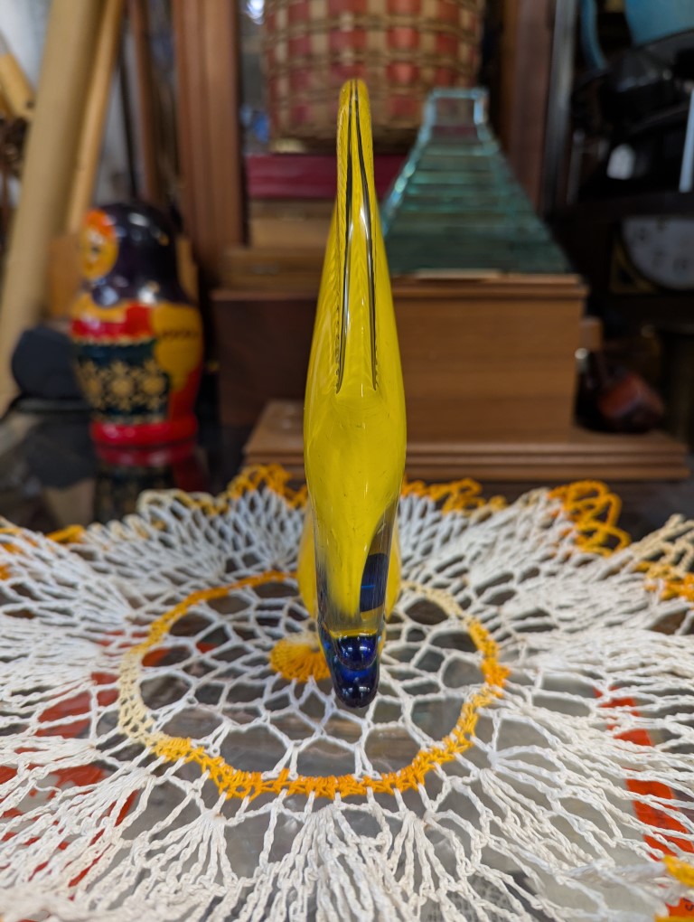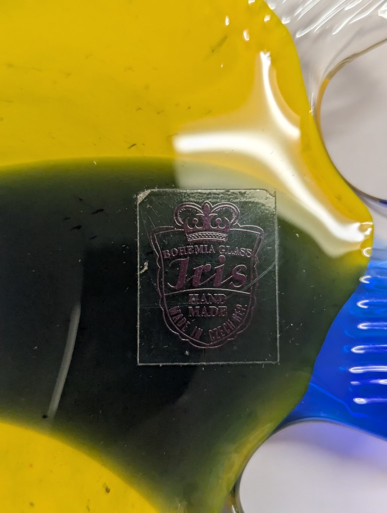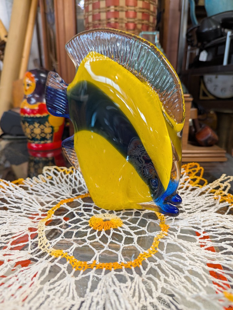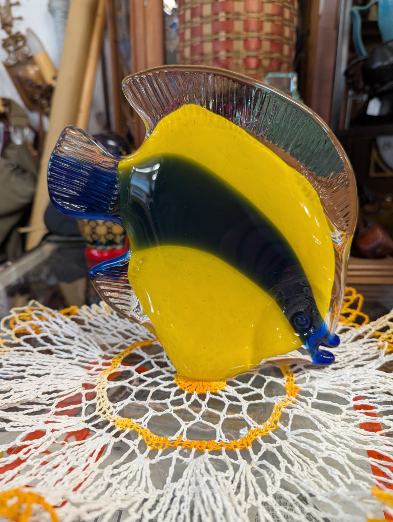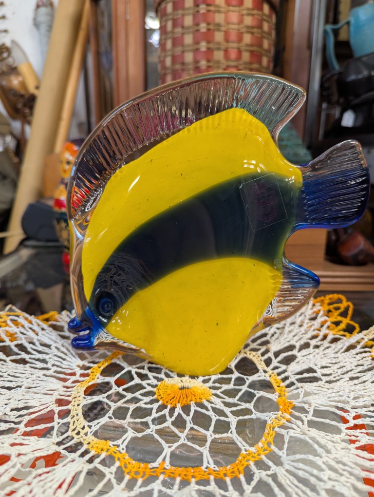 Vintage yellow and blue art glass tropical fish believed to be a butterfly fish with makers mark. Paper weight Bohemia Glass Iris Hand Made in Czech Rep.