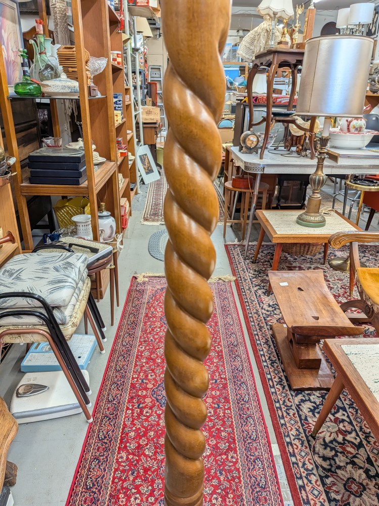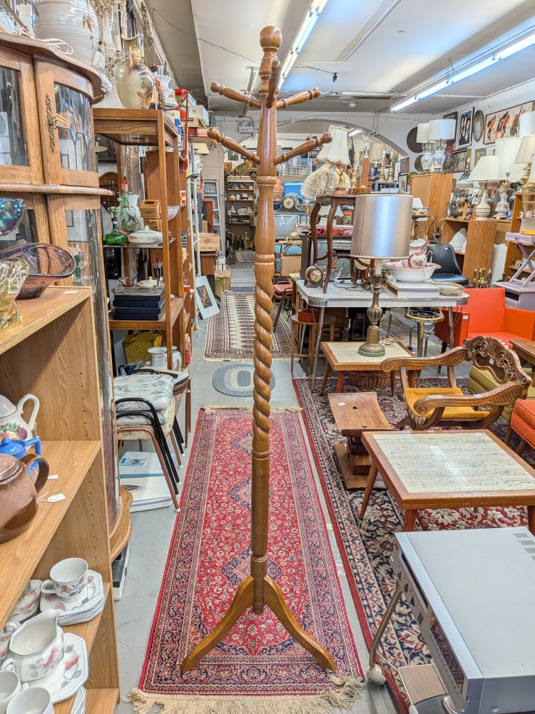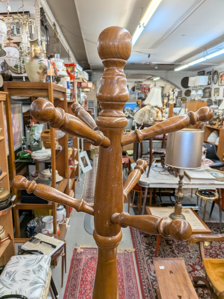 Vintage standing coat rack with decorative barley twist center post and a rotating head with multiple hanging pegs.