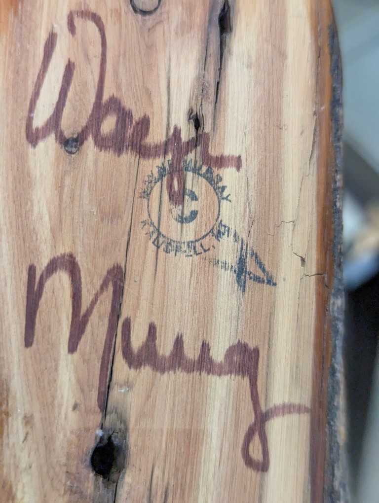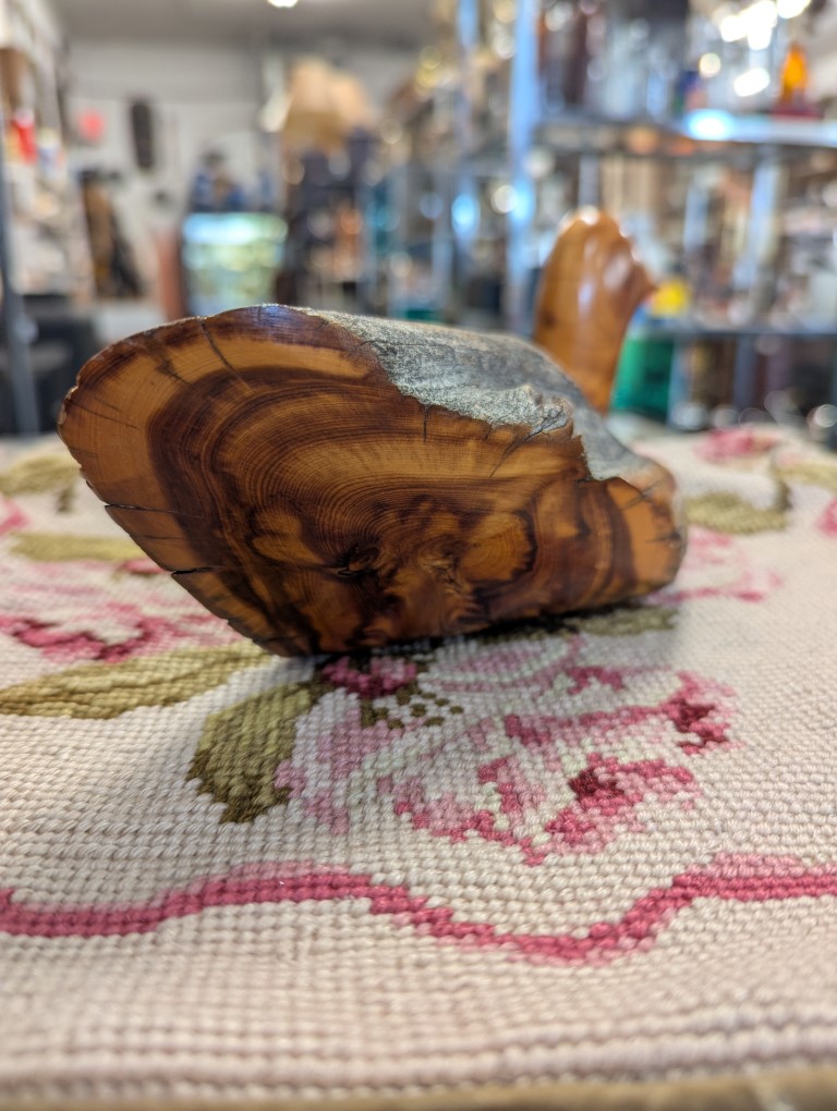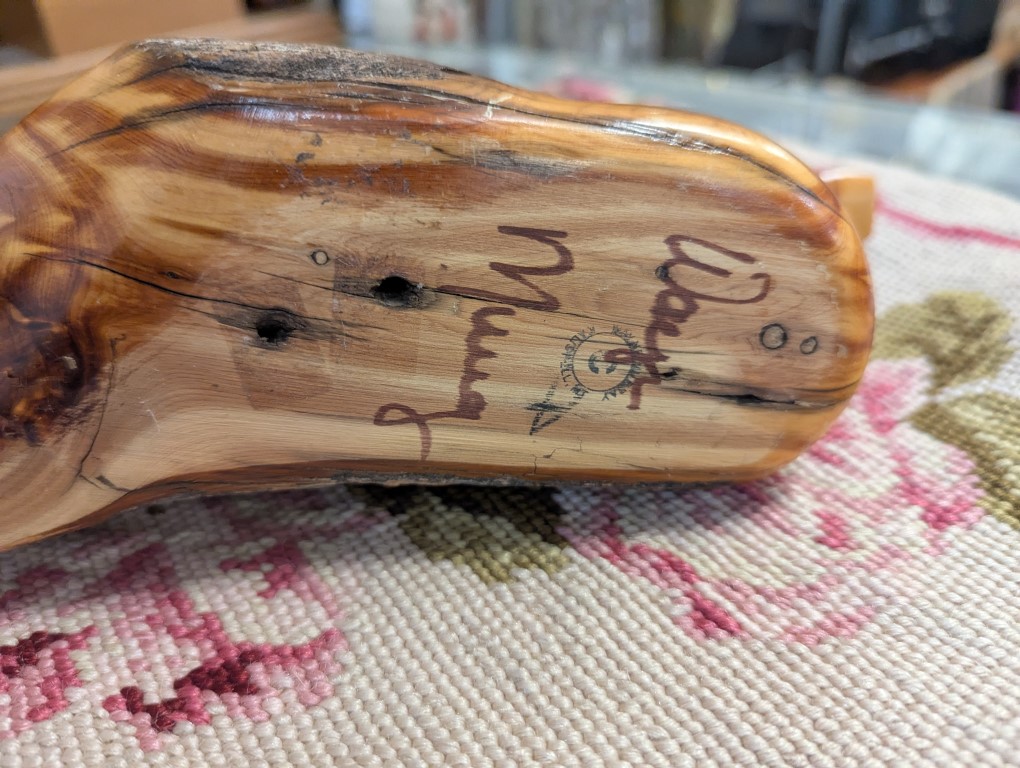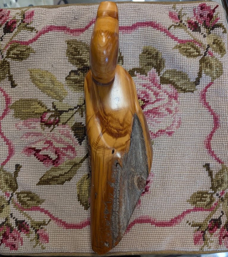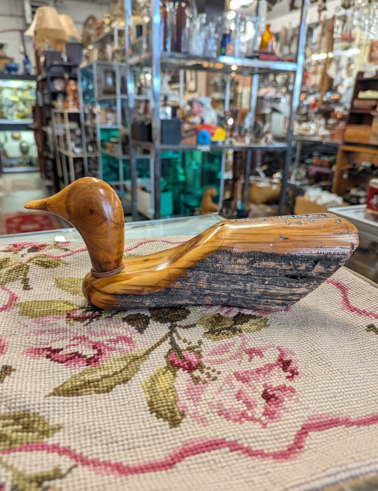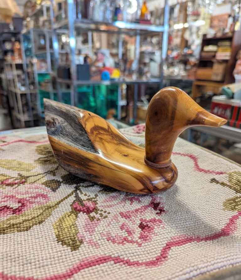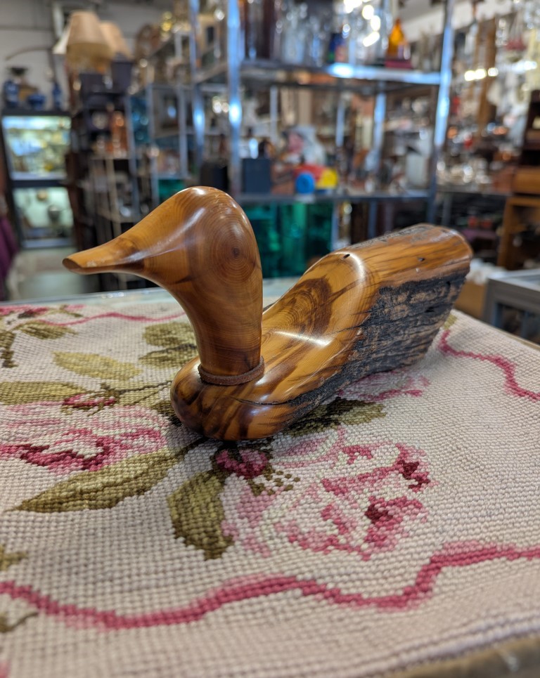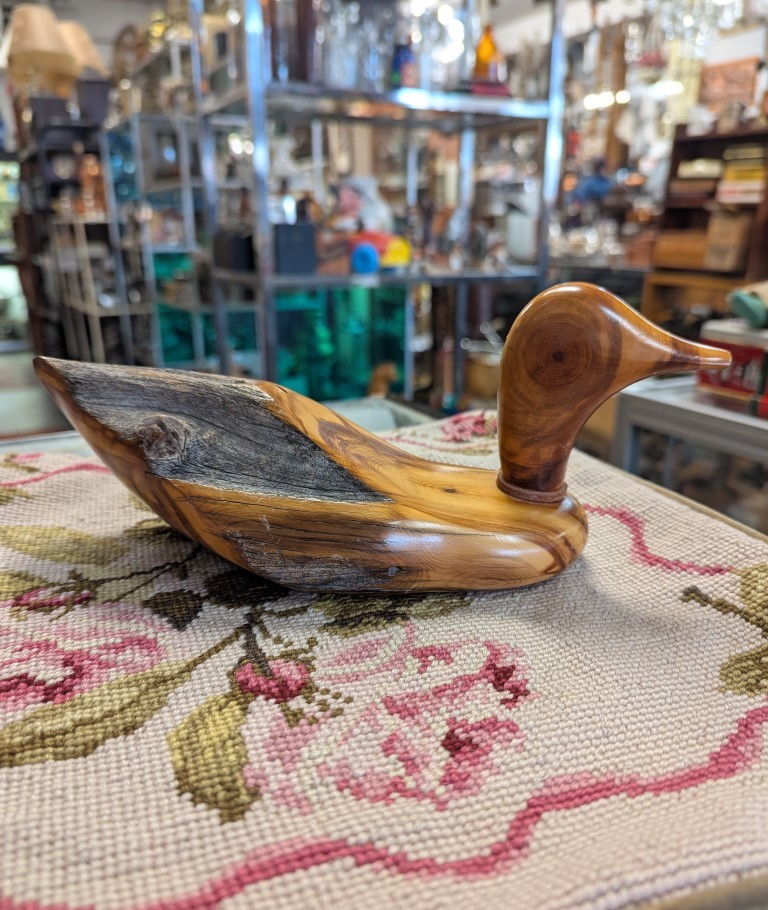This is a beautiful hand carved wooden decorative duck. Featuring a smooth, polished wood head and a distinct, rougher texture on the body. Signed and carved by Wayne Murray.